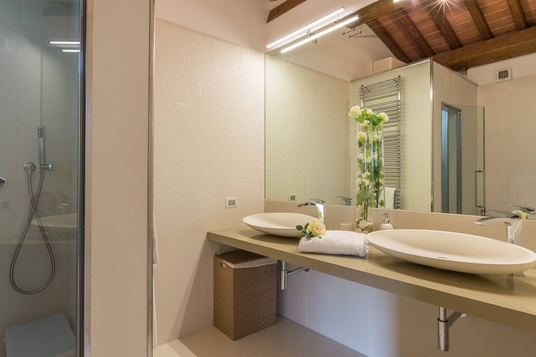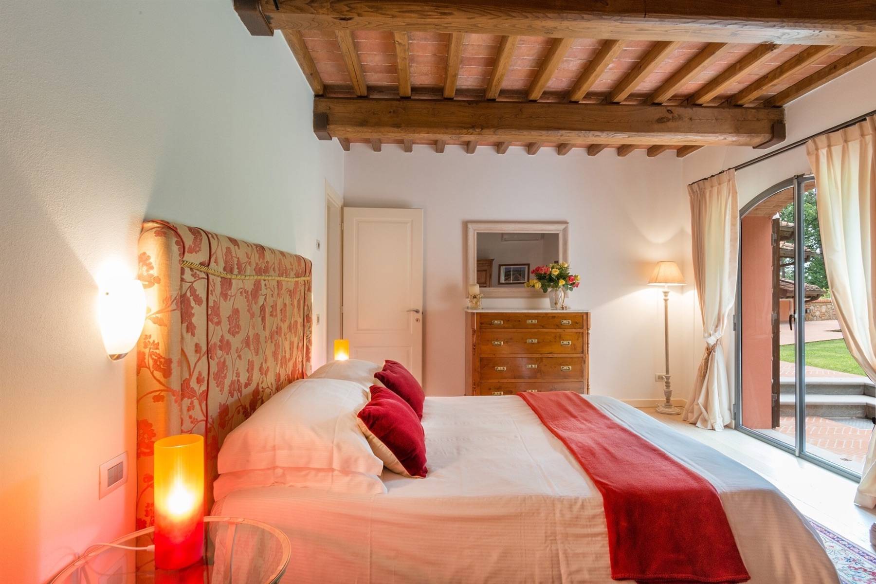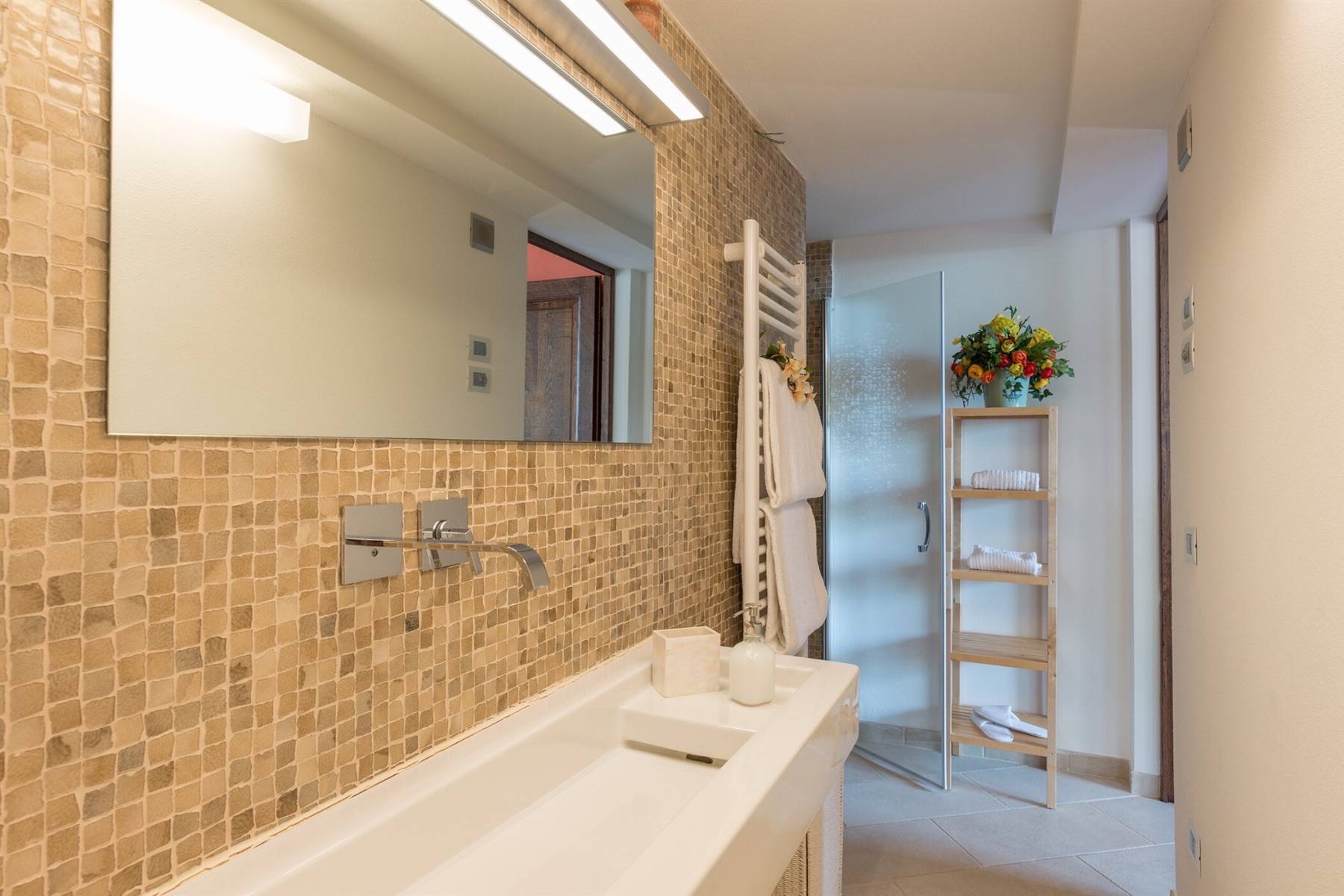 Der beheizbare Pool der Villa ist nach Süden ausgerichtet und blickt auf die schöne Hügellandschaft, die sich vom Garten bis zur Ebene bei Montecatini Terme erstreckt. Es befindet sich auf der gleichen Ebene wie das Erdgeschoss, entlang einer langen mit Terrakotta gepflasterten Fläche, die vor dem Haus beginnt und über französische Fenster vom Wohnzimmer aus zugänglich ist. Der Pool hat zwei geschwungene Seiten, ist mit PVC ausgekleidet und misst 4 x 8 m bei einer konstanten Tiefe von 1,40 m. Es gibt eine Metallleiter für den Zugang ins Wasser; Der Pool ist Chlor basiert. Der Poolbereich wird von sandfarbenen Steinplatten gesäumt und ist mit stilvollen Sonnenliegen, Tischen, einem Sonnensegel und einer Warm- und Kaltwasserdusche ausgestattet.