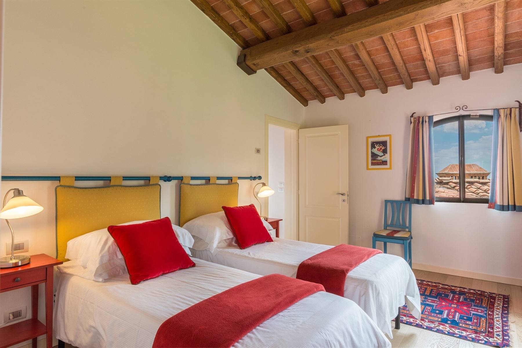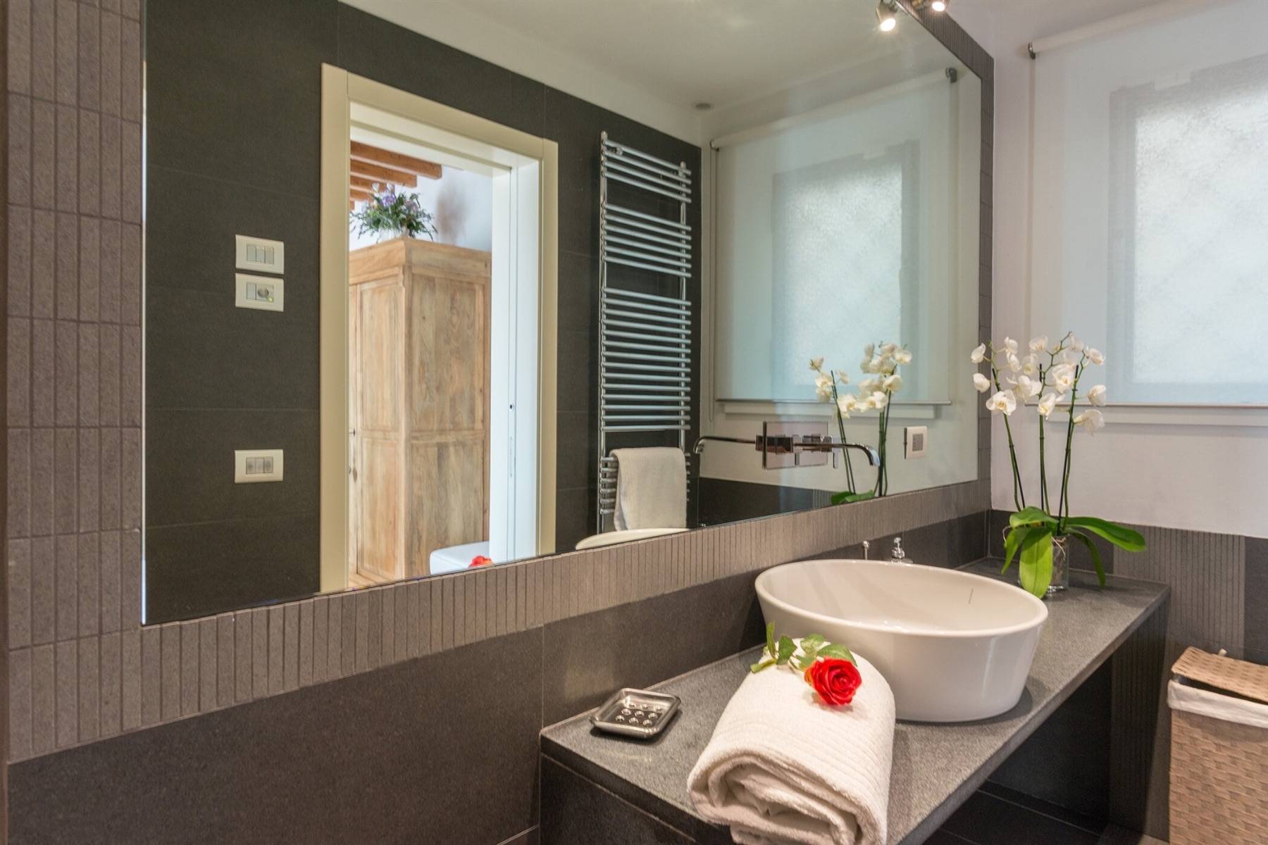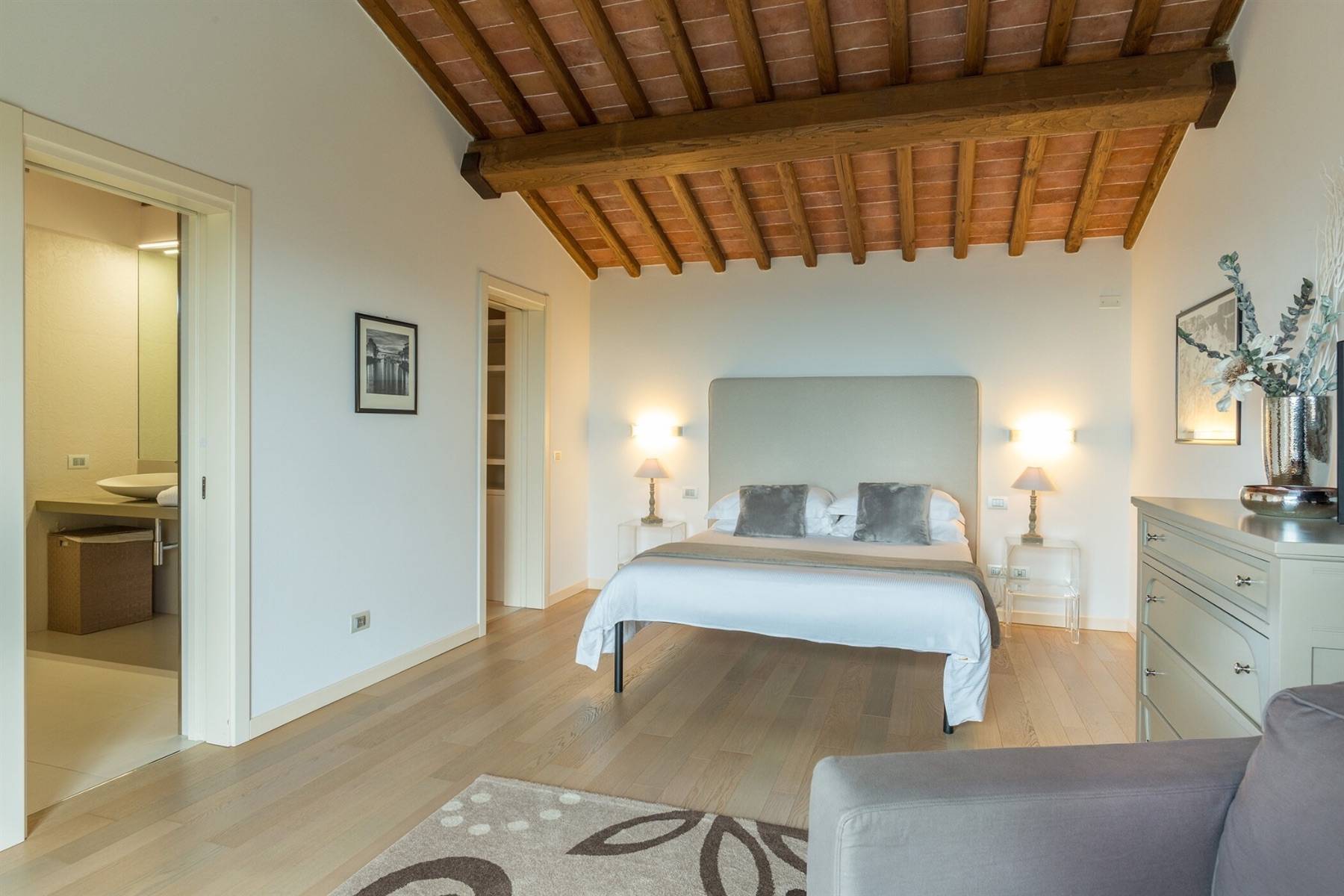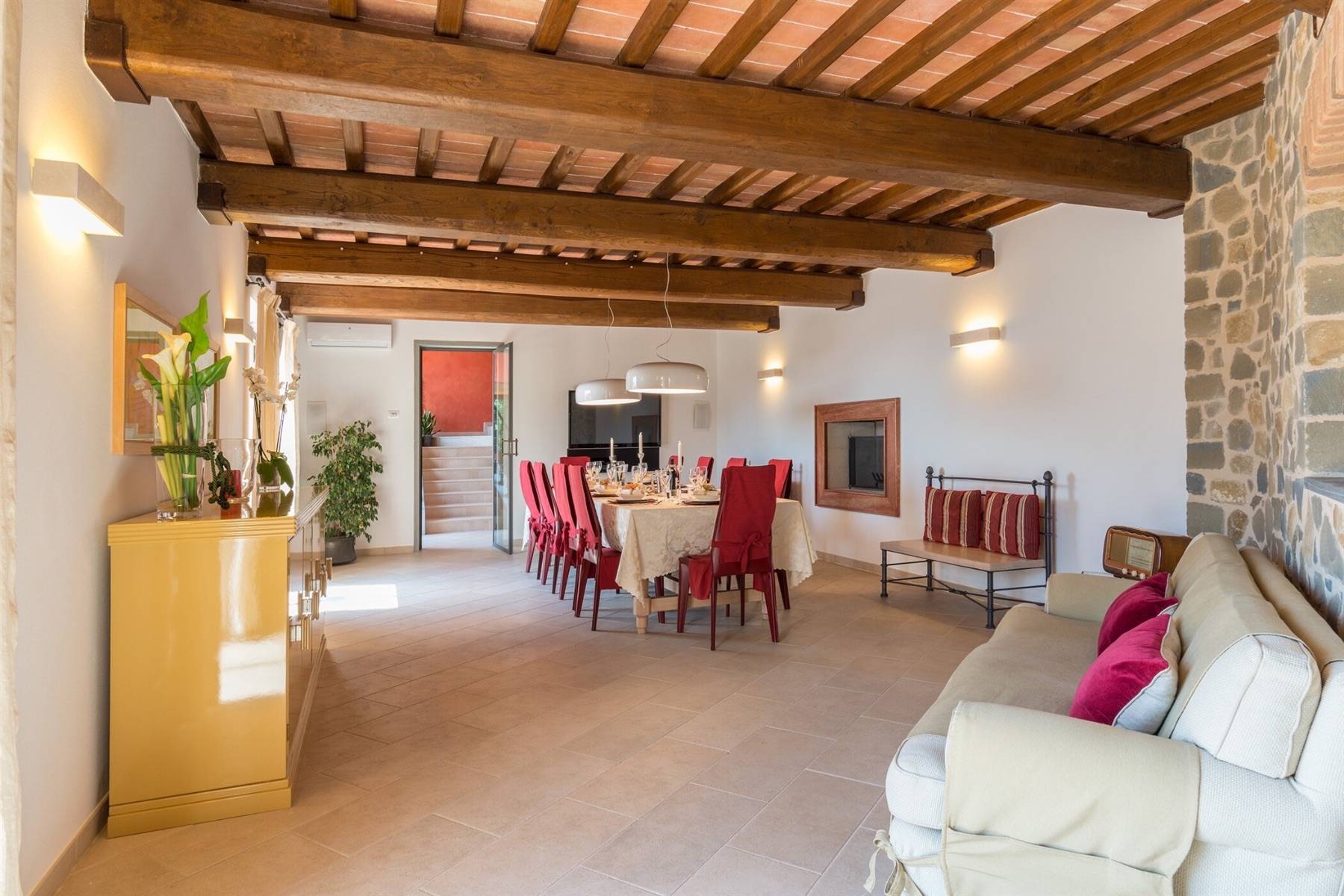 Der beheizbare Pool der Villa ist nach Süden ausgerichtet und blickt auf die schöne Hügellandschaft, die sich vom Garten bis zur Ebene bei Montecatini Terme erstreckt. Es befindet sich auf der gleichen Ebene wie das Erdgeschoss, entlang einer langen mit Terrakotta gepflasterten Fläche, die vor dem Haus beginnt und über französische Fenster vom Wohnzimmer aus zugänglich ist. Der Pool hat zwei geschwungene Seiten, ist mit PVC ausgekleidet und misst 4 x 8 m bei einer konstanten Tiefe von 1,40 m. Es gibt eine Metallleiter für den Zugang ins Wasser; Der Pool ist Chlor basiert. Der Poolbereich wird von sandfarbenen Steinplatten gesäumt und ist mit stilvollen Sonnenliegen, Tischen, einem Sonnensegel und einer Warm- und Kaltwasserdusche ausgestattet.
