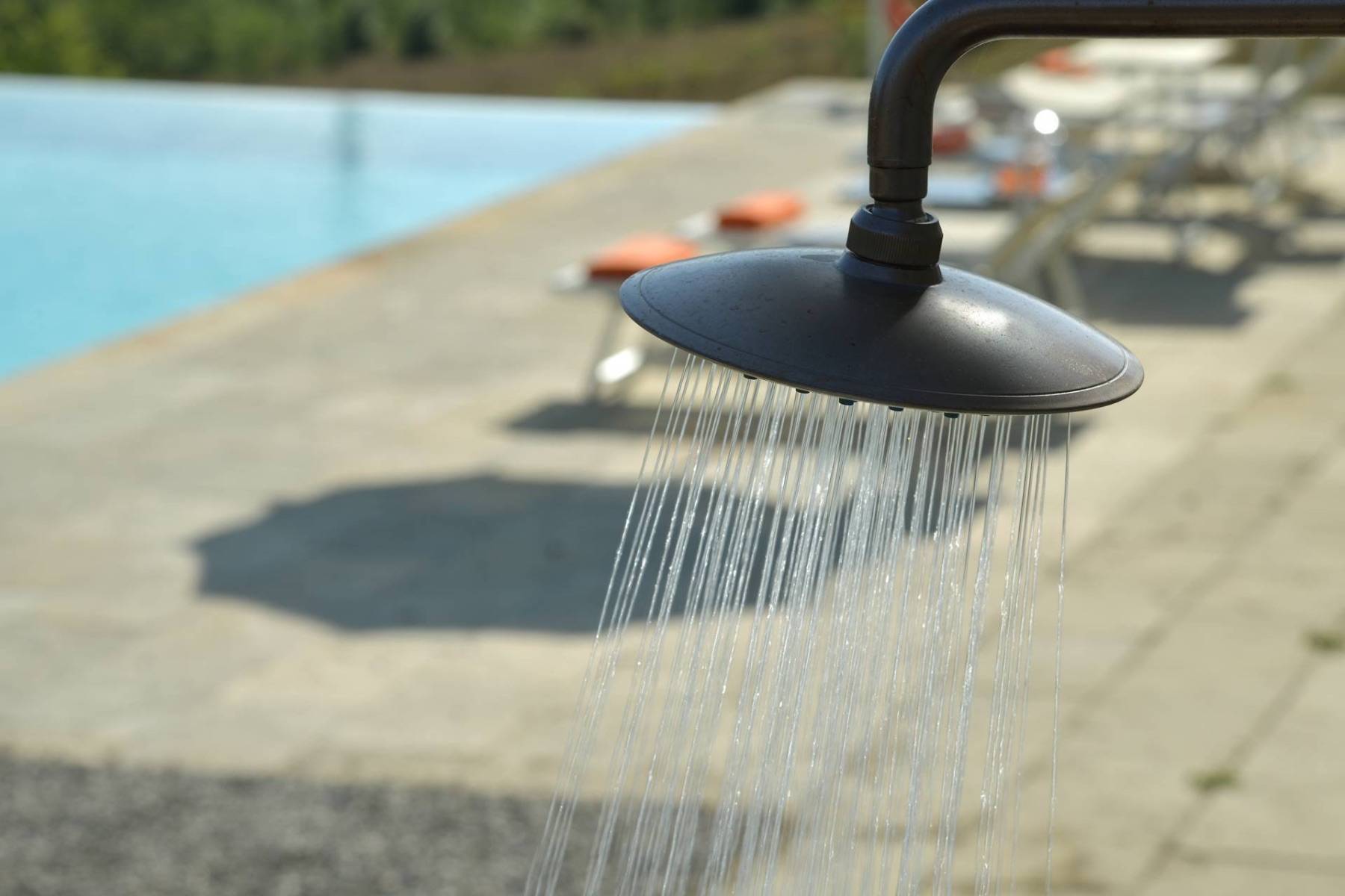 Ein besonderes Highlight dieses Landhauses liegt in seiner herrlichen Aussicht. Von der südseitigen großen Pergola mit Esstisch und bequemen Stühlen sind es nur ein paar Schritte zu einem gemauerten Grill, der mit Holz befeuert wird. Ein romantischer Pfad führt hinunter zum Infinity-Pool, der zur Sicherheit für die Kinder eingezäunt ist. Neben dem Schwimmbad wurde ein kleiner Raum mit Fitnessgeräten ausgestattet. Eine charmante Terrasse mit Garten- Loungesofas und -sesseln rund um eine einladende Feuerschale rundet das äußere Bild ab.