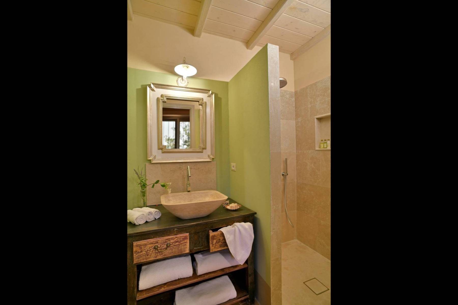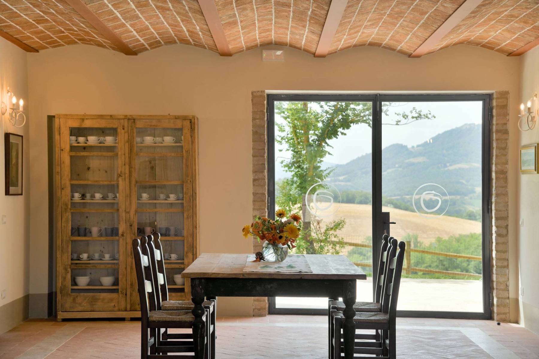 Eine etwa 700 m lange private Schotterstraße führt zu einem großen schattigen Parkplatz hinter dem toskanischen Landhaus. Das Landhaus erstreckt sich über zwei Etagen, die beide einen separaten Eingang haben, im Hausinneren aber durch eine gemeinsame Treppe verbunden sind.