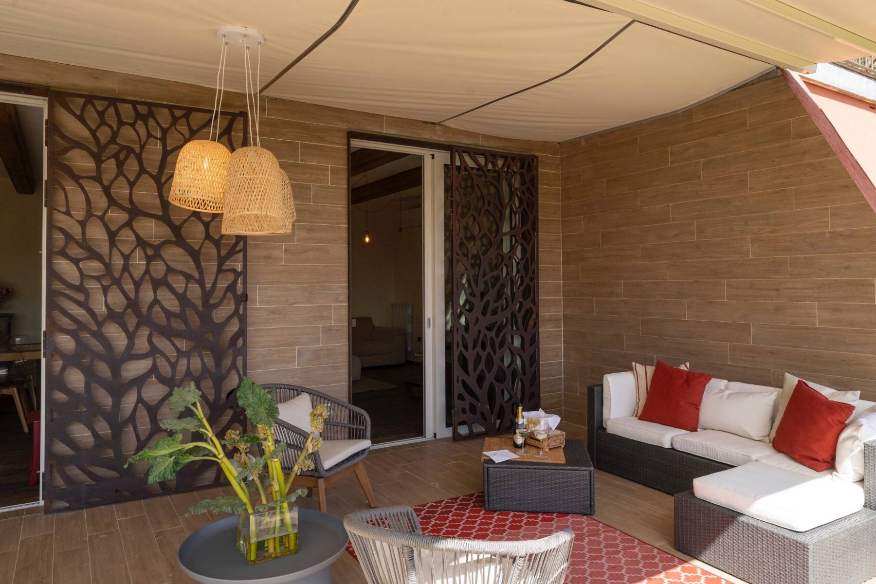 Im ersten Stock gibt es ein Doppelschlafzimmer mit Doppelbett und ein Bad mit Dusche. Und auf dieser Ebene gibt es im Freien eine weitere Terrasse und einen Barbecue-Bereich.