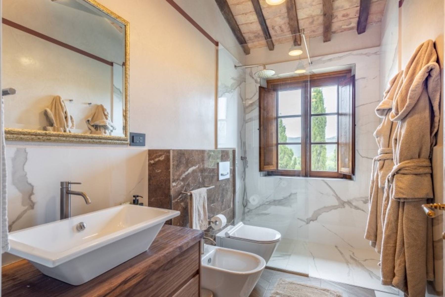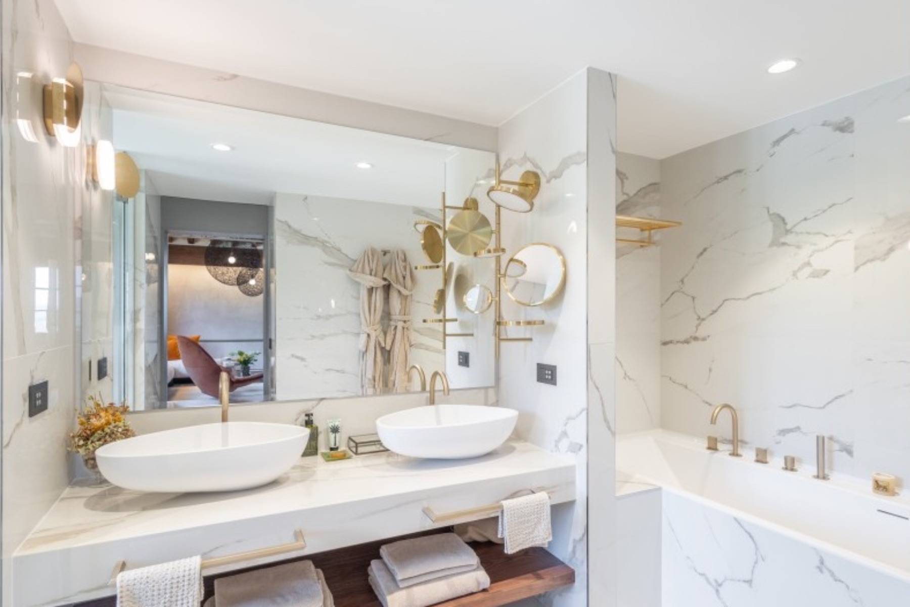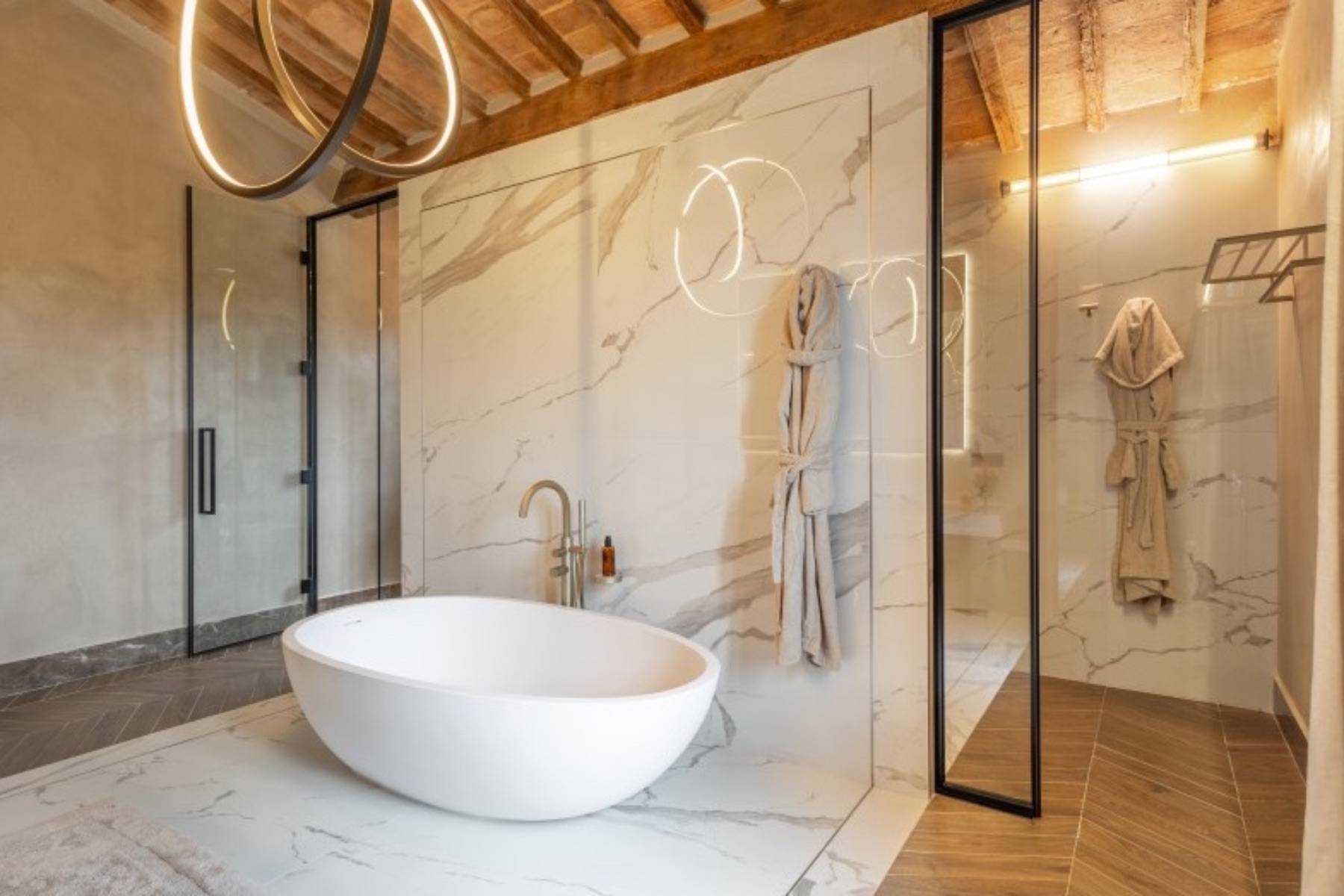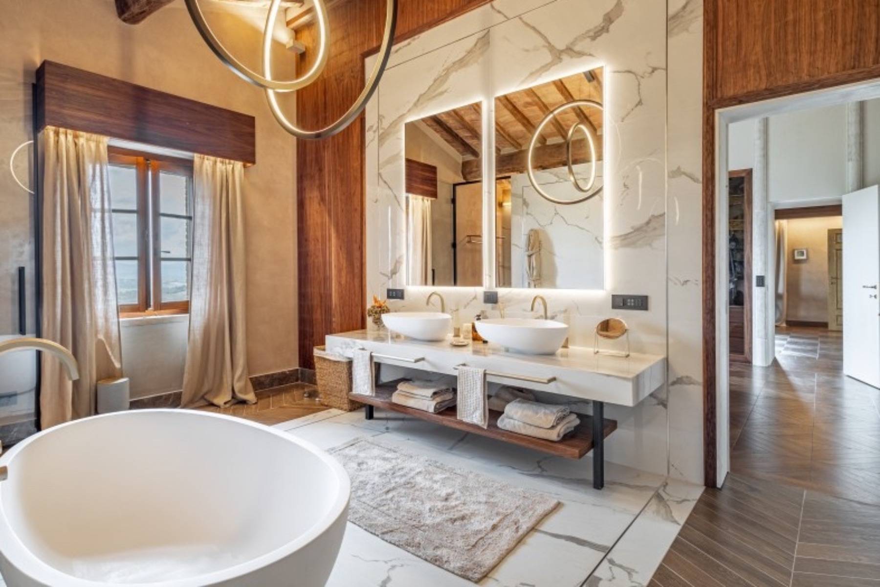 Bademantel Badetuch Badewanne freistehend Bidet Doppelwaschbecken Duschgel Fenster Fußbodenheizung Haartrockner Handtuch Kosmetikspiegel Seife Shampoo Spiegel Vorhänge Walk- In- Dusche WC