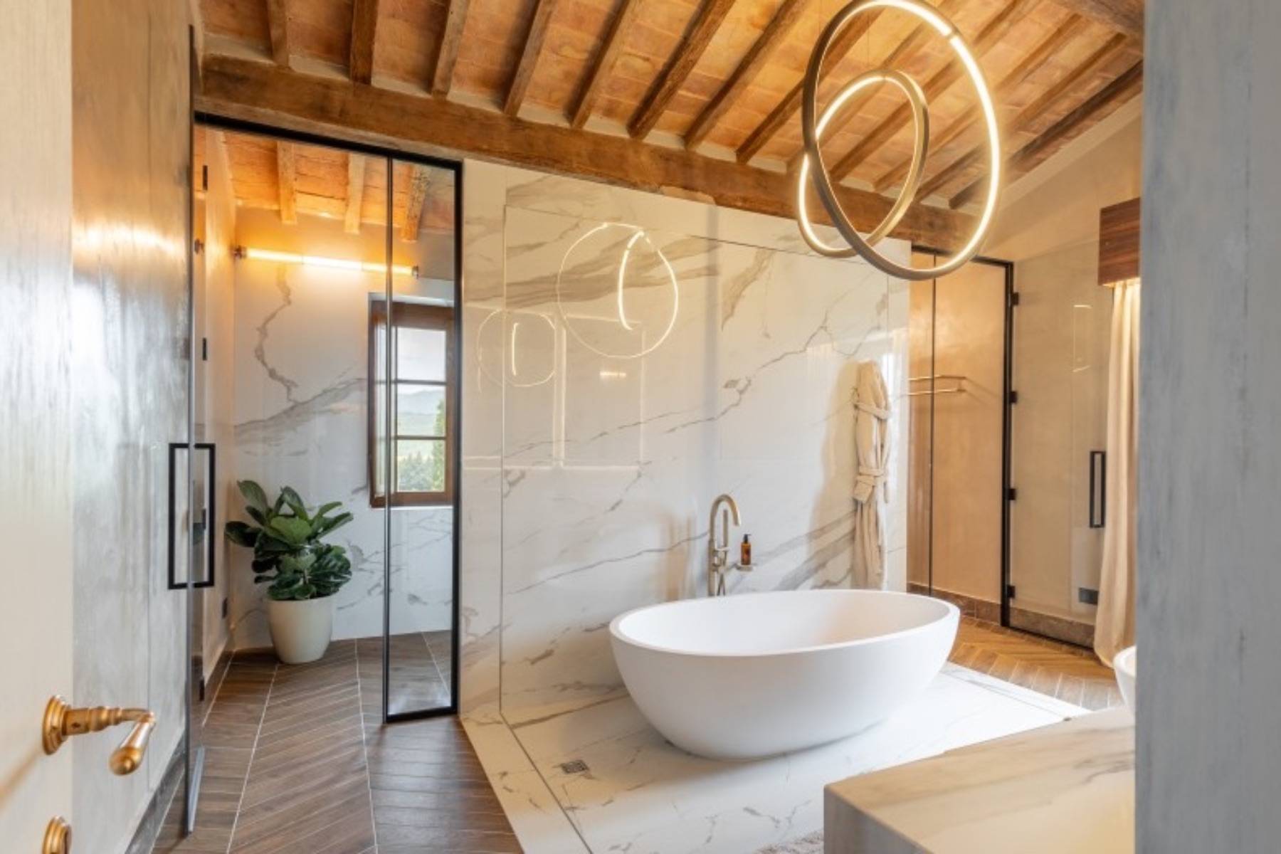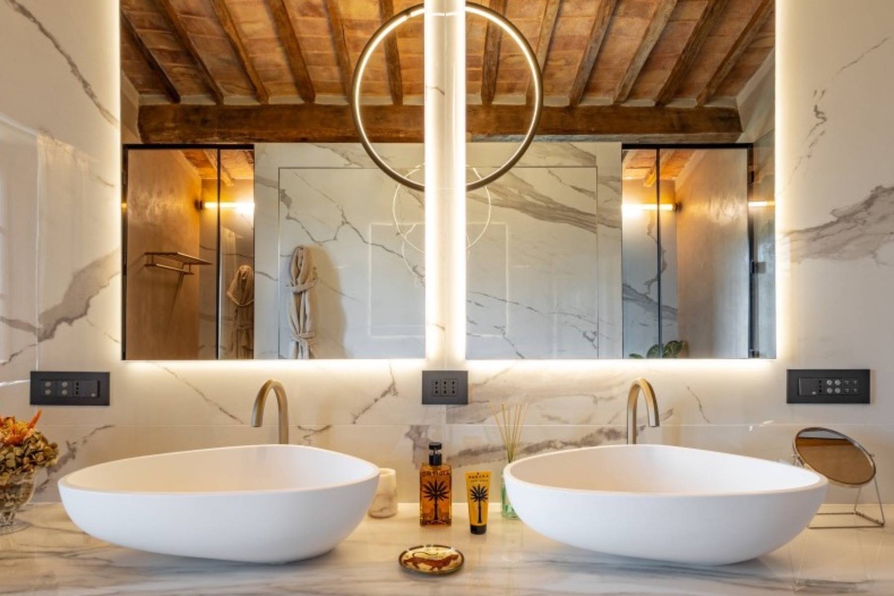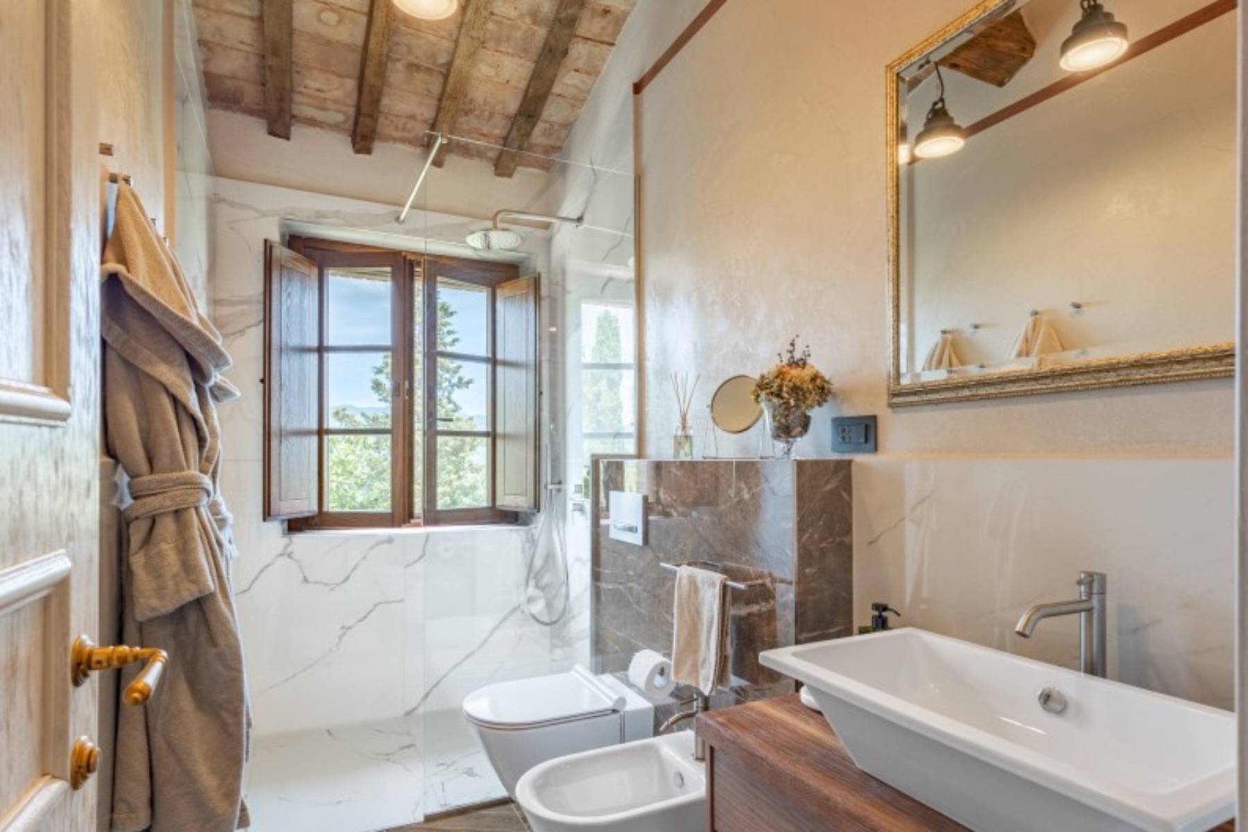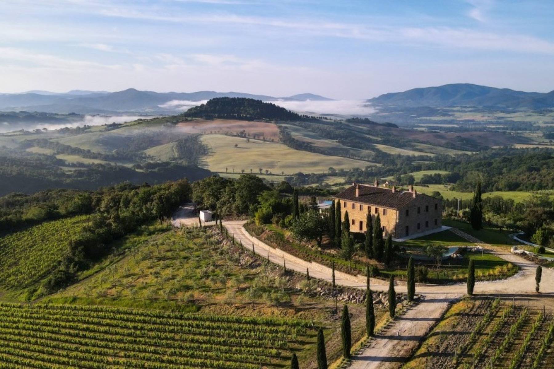 Die Villa besticht durch die Liebe zum Detail, die hochwertige Ausstattung sowie die ausserordentlich schöne Lage in typische Toskanischer Hügellandschaft und die noch gute Nähe zur Küste auf einem 18 Hektar grossen Grundstück mit Wald und Wein.