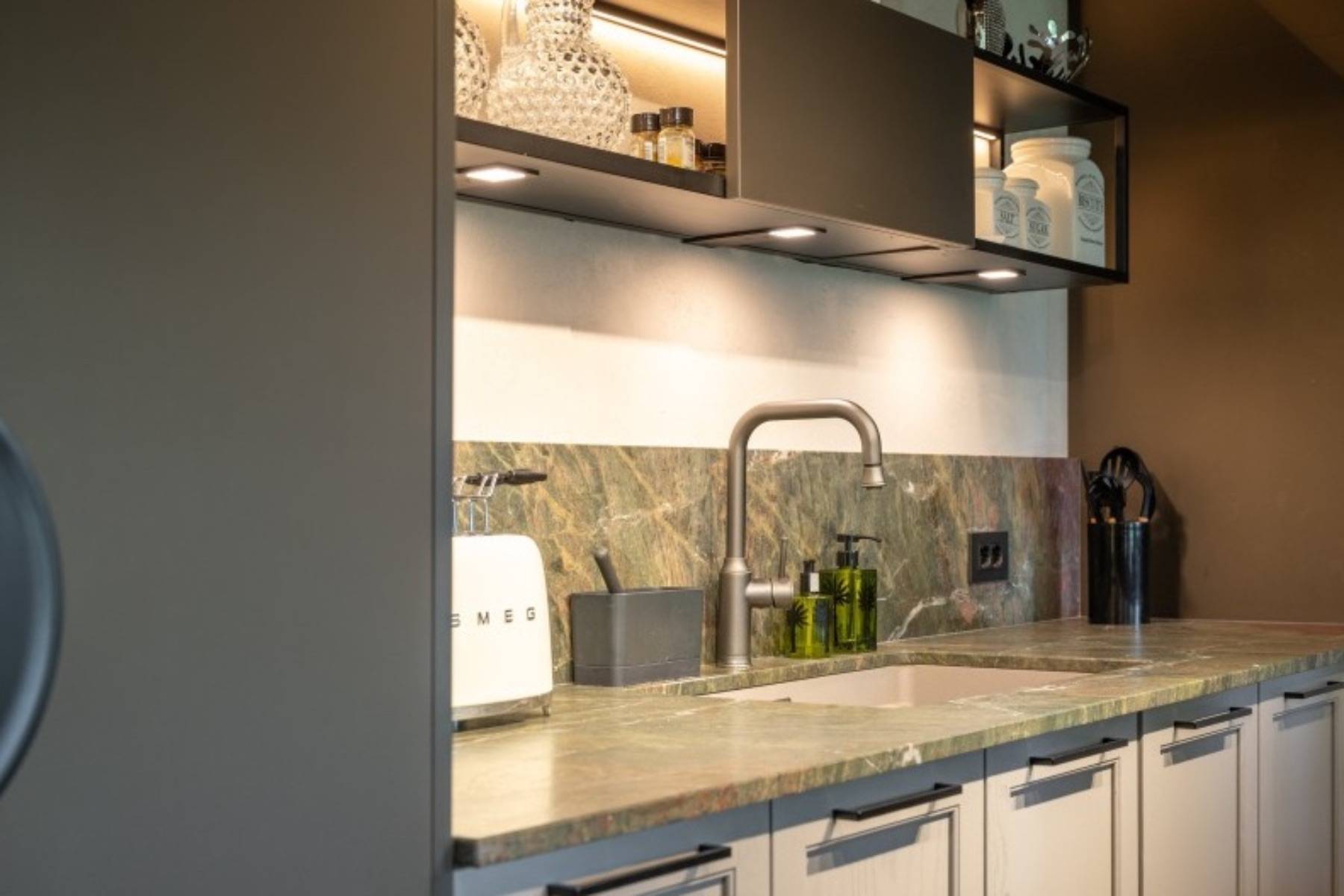 Backofen Dunstabzug Fenster Fußbodenheizung Geschirr/ Besteck Geschirrspülmaschine Induktionskochfeld Kaffeevollautomat Kochinsel Küchenutensilien Kühl- / Gefrierschrank Luxusküche Mixer Pfannen Toaster Töpfe Wasserkocher Weinkühlschrank