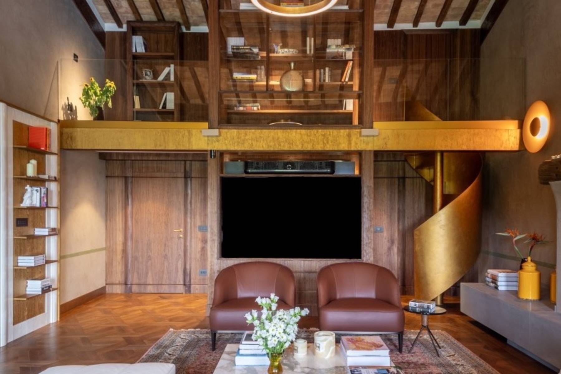 Bücher Ecksofa Fenster Flatscreen Fußbodenheizung Kamin Sessel Vorhänge