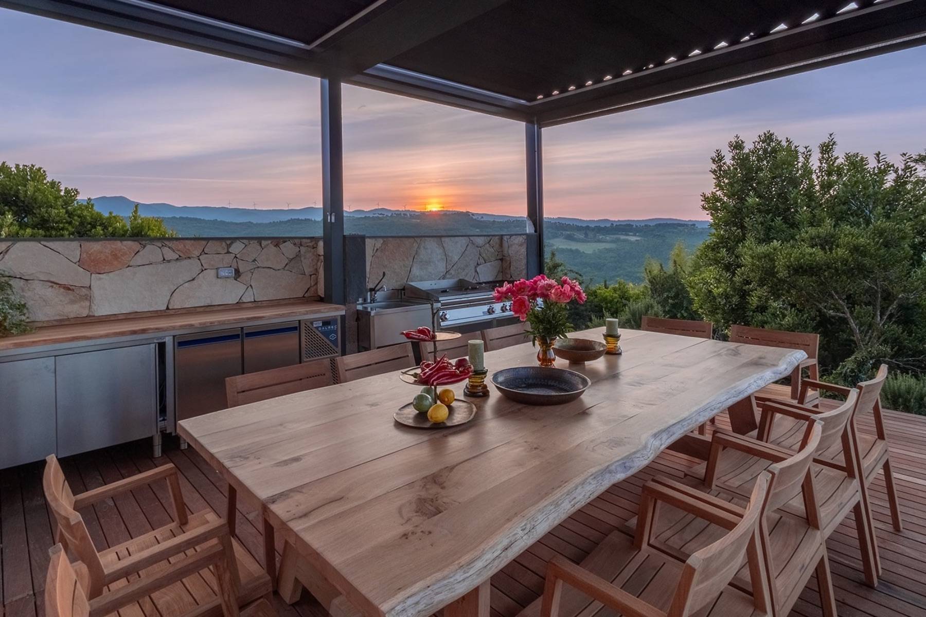 Im Erdgeschoss gibt es die Eingangshalle, einen grosszügigen Wohnbereich, eine bestens ausgestattete Küche sowie einen Speisebereich mit Kamin. Im Freien gibt es ein Patio, sowie einen weiteren Aussenbereich zum Speisen und eine Aussenküche.