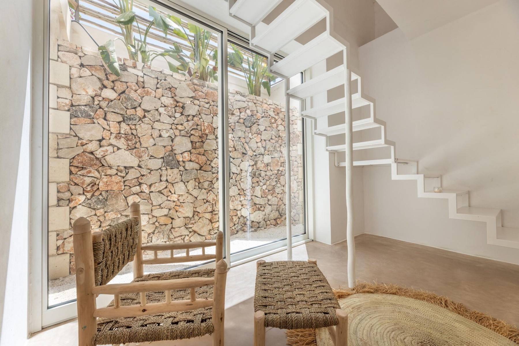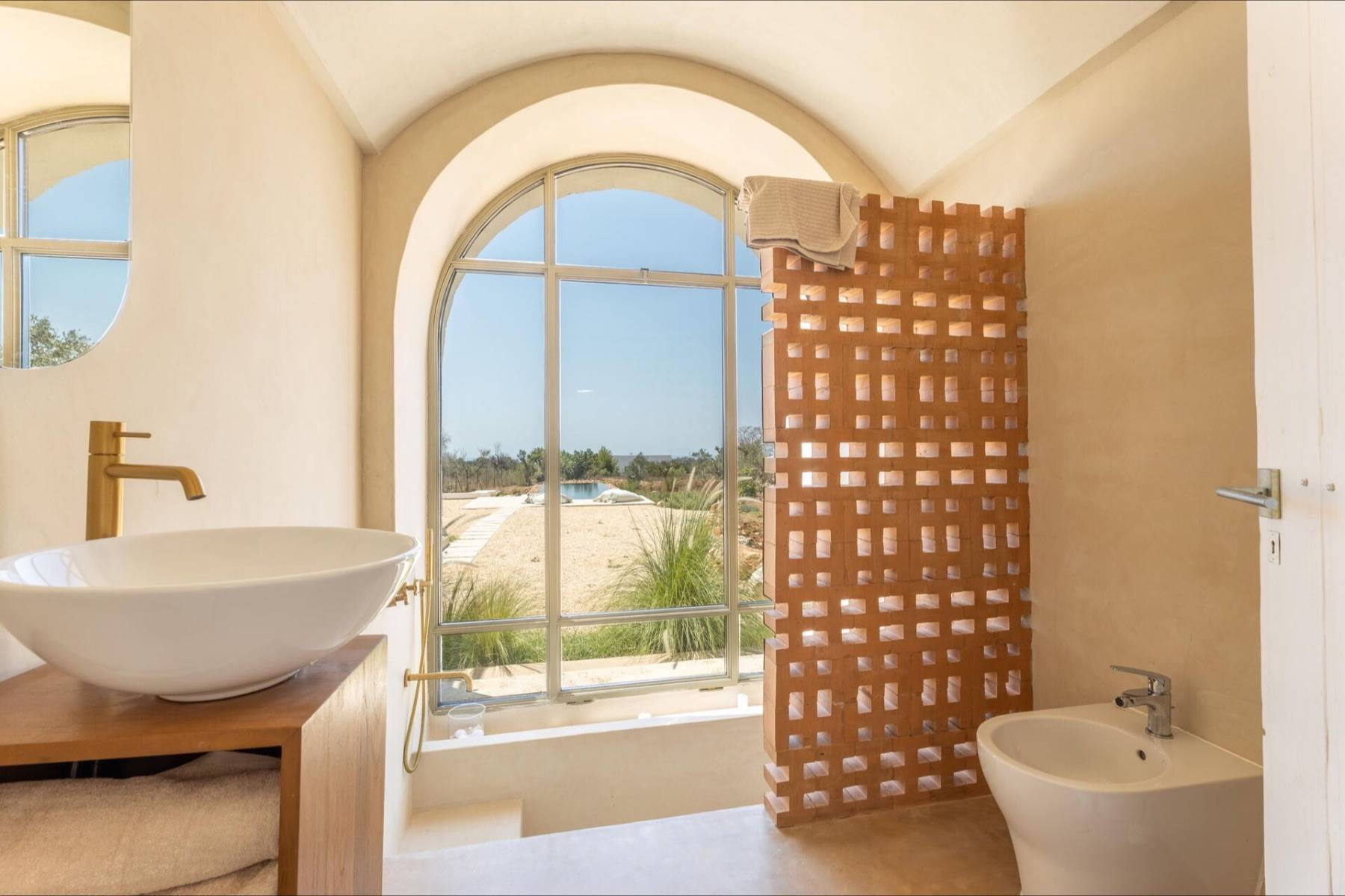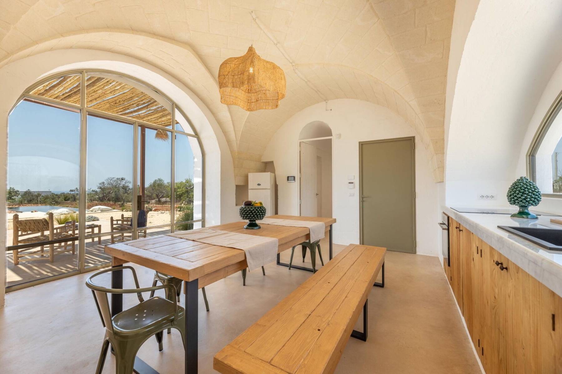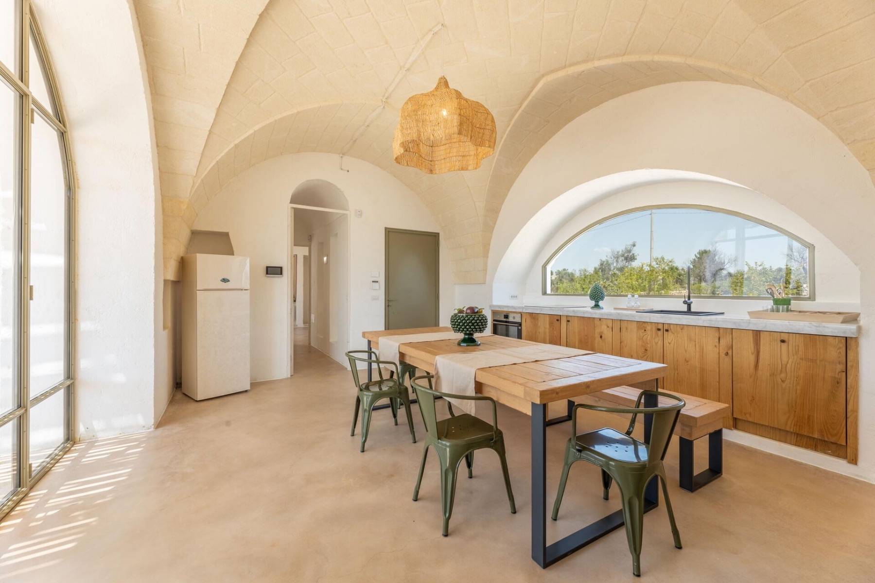 Dank der großen und zahlreichen Rundbogenfenster, werden die Räume mit warmen Sonnenlicht durchflutet. In der Wohnküche strömt von beiden Seiten Tageslicht durch die großen Fenster hinein. Von hier gelangt man auf die Aussenterrasse und in den weitläufigen Garten, in dem ein Infnitypool zum Baden, Schwimmen oder Plantschen einlädt.