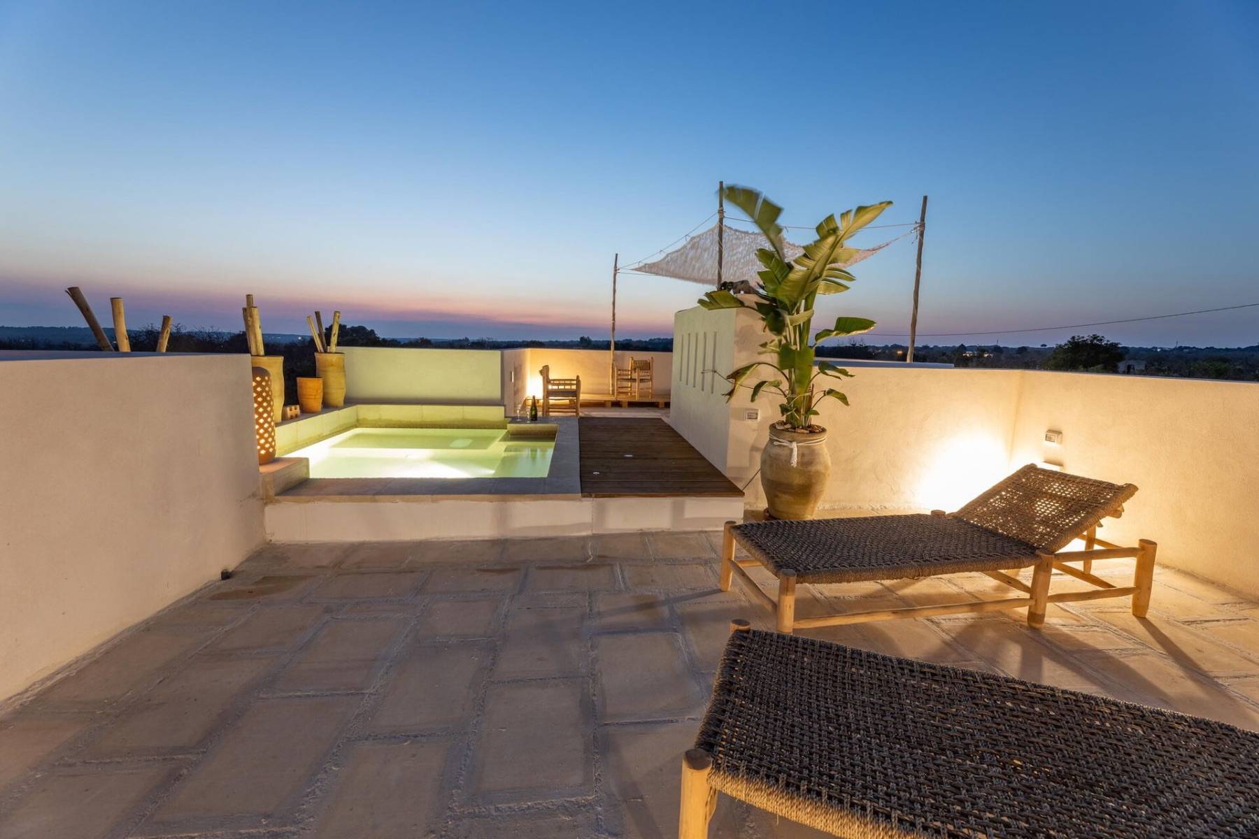 Ein weiteres Highlight des Ferienhaus Dolce Mare in Salve ist die große Dachterrasse. Auf dieser laden Sonnenliegen und ein weiterer Pool/ Whirlpool zum relaxen und abkühlen ein. Der Blick auf das Meer verzaubert den Nachmittag und den Urlaub zugleich.