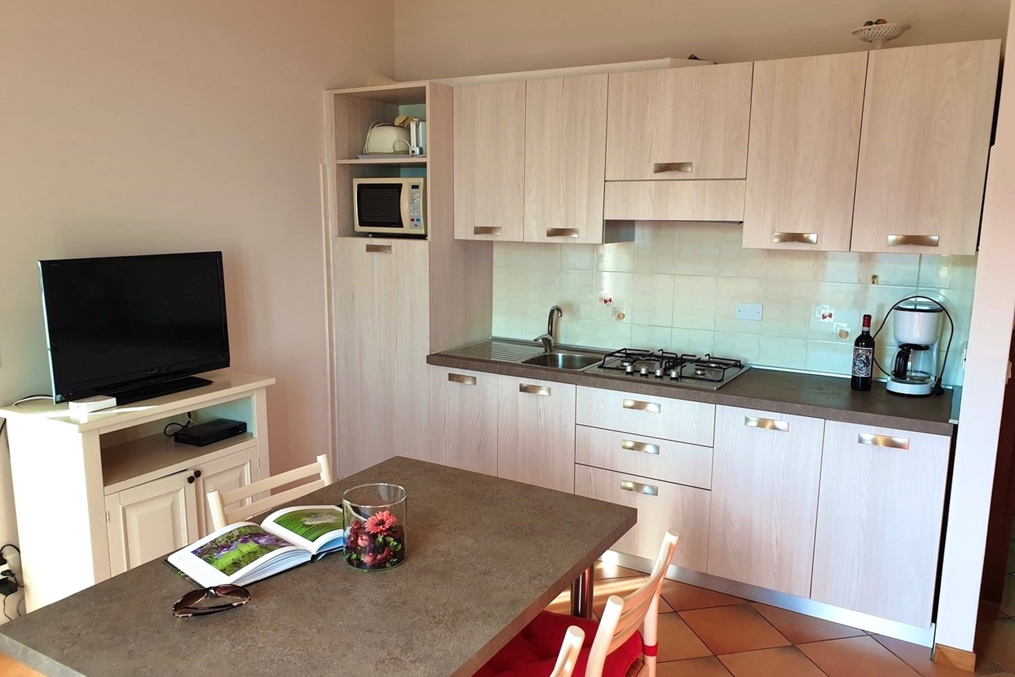 Diese schöne Ferienwohnung liegt in Tignale-Olzano am Westufer des Sees, auf einem Hochplateau ca. 500 m über dem See in schönster Panoramalage mit herrlichem See- und Bergblick. Sie ist, etwa 7 km oberhalb des Sees liegend, über eine schön ausgebaute Panoramastraße in wenigen Minuten zu erreichen. Als anerkannter Luftkurort und Naturpark ist das nach Süden ausgerichtete Sonnenplateau mit seiner üppigen Mittelmeervegetation ideal zum Erholen und Relaxen oder auch Wandern und Mountainbiken. Von Ihrem Feriendomizil aus genießen Sie eine unvergleichlich schöne Aussicht fast über den gesamten Gardasee und das Monte Baldo Massiv. Hunde sind willkommen. Die schöne und gemütliche Ferienwohnung für 2 – 3 Personen befindet sich in ruhiger Ortsrandlage mit einem separaten Eingang. Sie hat eine nach Süden ausgerichtete grosse Terrasse mit traumhaftem Blick auf den See und das gegenüberliegende Monte Baldo Massiv und einen Autostellplatz mit einer etwas steileren Abfahrt. Zudem gibt es einen Garagenstellplatz in ca. 200 m. Durch den Eingang gelangen Sie in den lichtdurchfluteten Wohn-Essbereich mit Sat- TV. Die Küchenzeile ist komplett mit allem ausgestattet, was man benötigt. Die Wohnung verfügt je über 1 Schlafzimmer und ein Duschbad