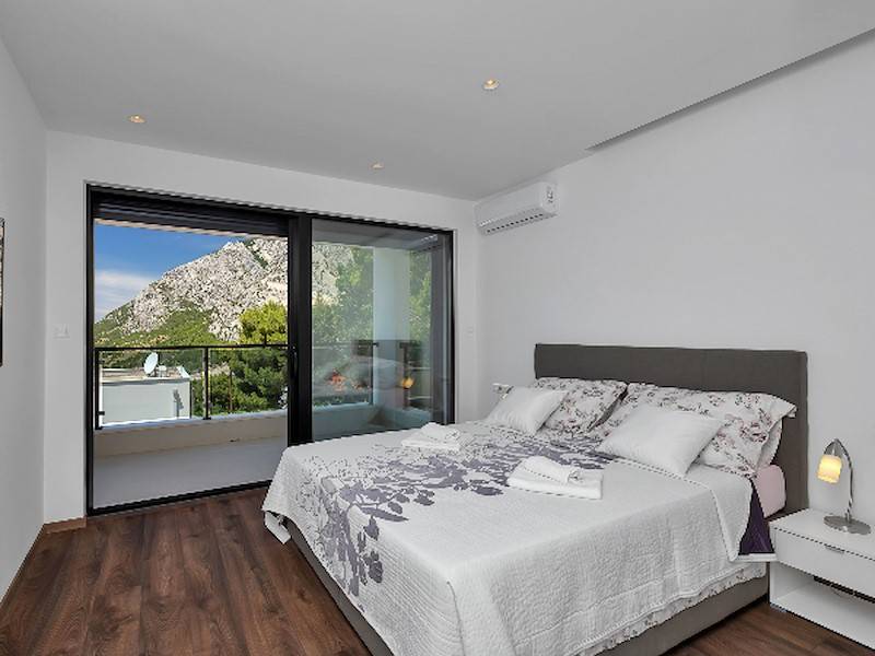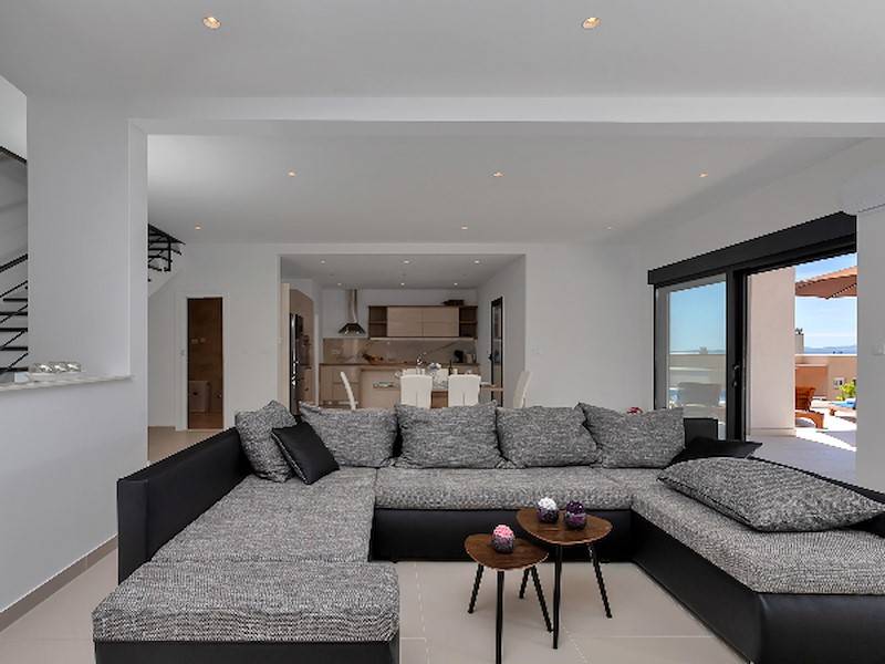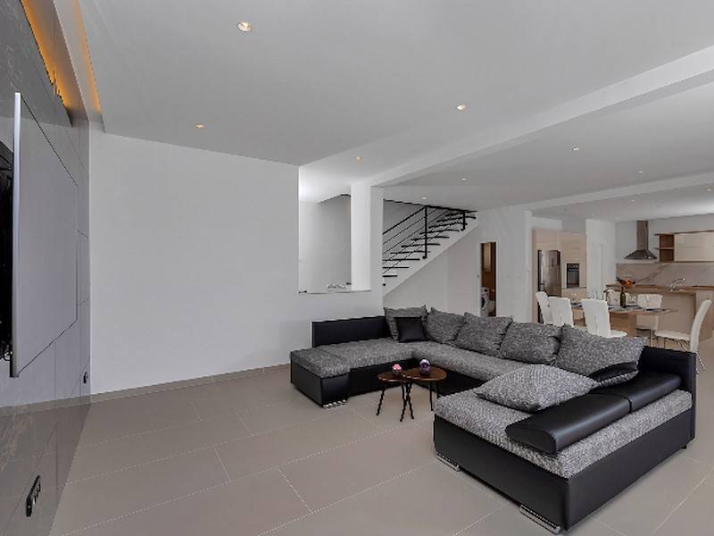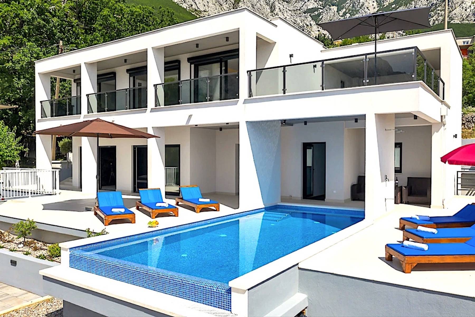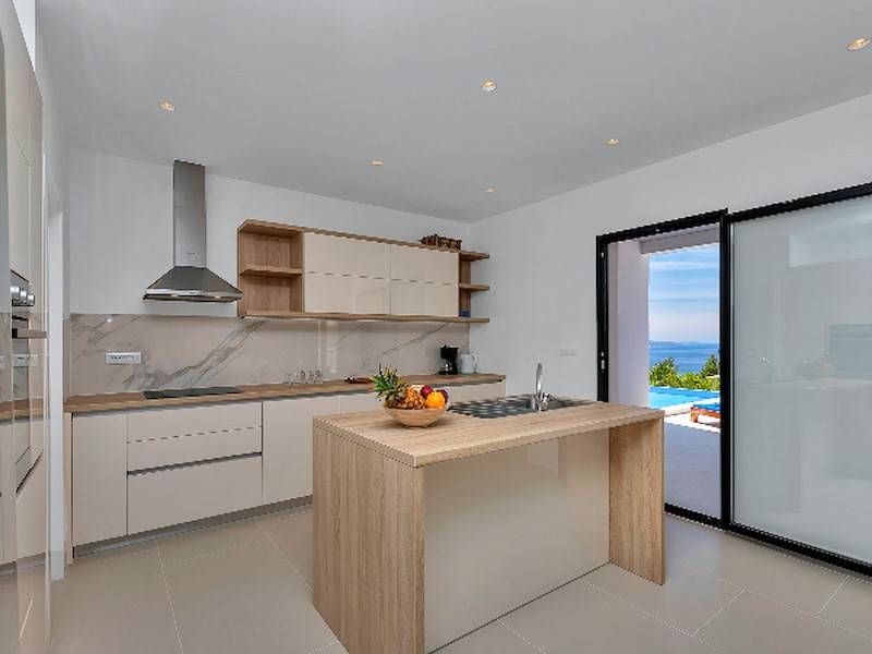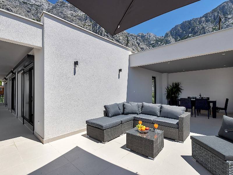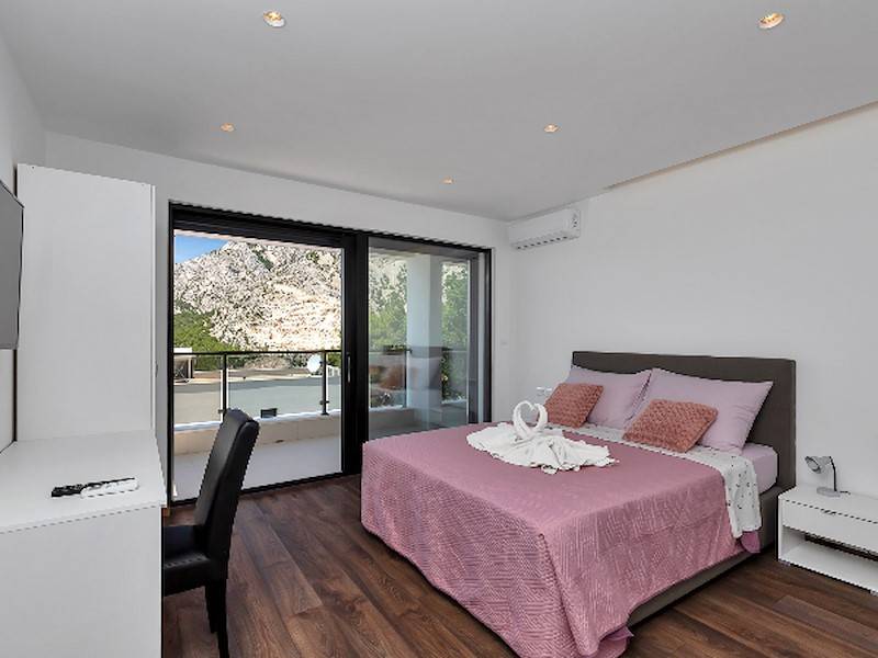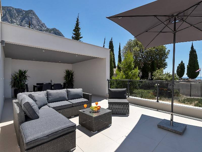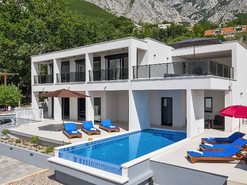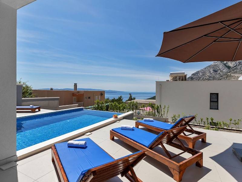 Modernes Ferienhaus in ruhiger Hanglage, oberhalb der Küste und Ortes Baška Voda, im Ort Bast. Die Räume verteilen sich über zwei Etagen. In der unteren Etage befindet sich das geräumige Wohzimmer mit offener Küche, sehr modern eingerichtet und komplett ausgestattet. Sitzsofa, SMART Sat/Tv, ein Gäste WC mit Waschmaschine. Von hieraus gelangt man auf die schöne große, zum Teil überdachte Terrasse mit beheiztem Überlaufpool. Es stehen Ihnen die Sonnenliegen und eine Aussendusche zur Verfügung. Auf der ersten Etage befinden sich insgesamt drei Doppelbett Schlafzimmer, jedes mit eigenem Badezimmer (Ensuite), alle Zimmer mit Klimaanlage und SAT/TV ausgestattet. Eine Dachterrasse mit Gartenmöbeln und Meerblick, zum Teil überdacht, ein Sonnenschirm. Das moderne Ferienhaus ist brand neu, sehr gepflegt und geräumig. Familien mit Kindern sind hier willkommen. Kostenloses WLAN gehört zur Grundausstattung. Parkplätze vorm Haus.