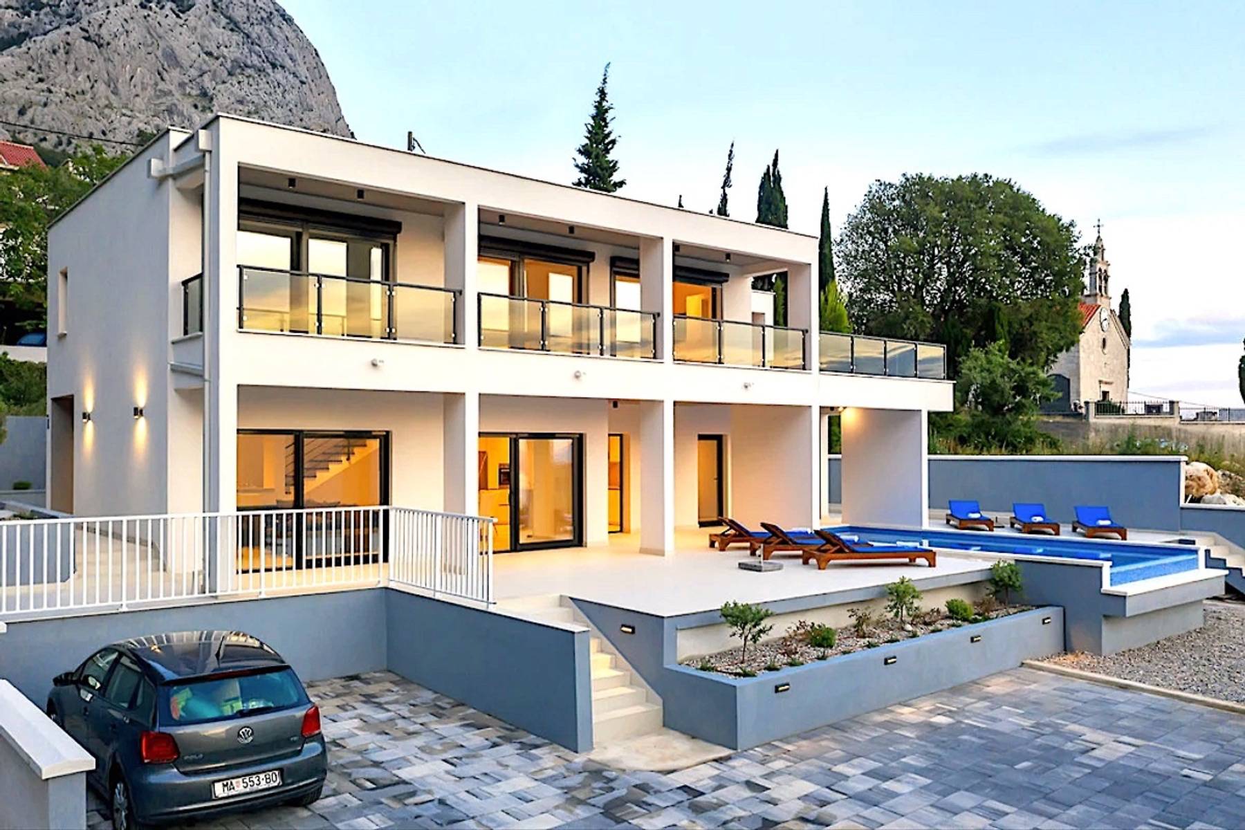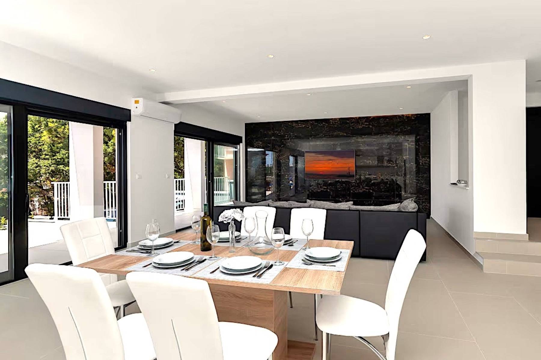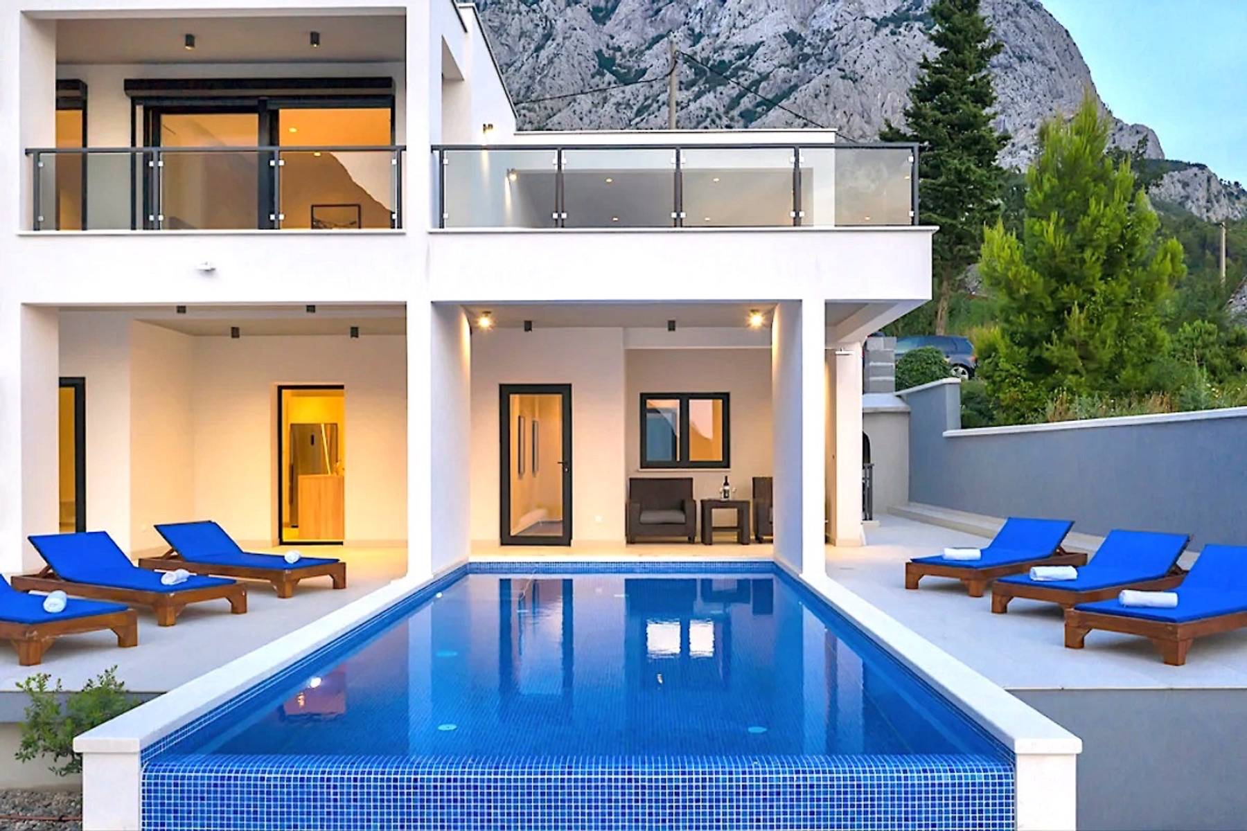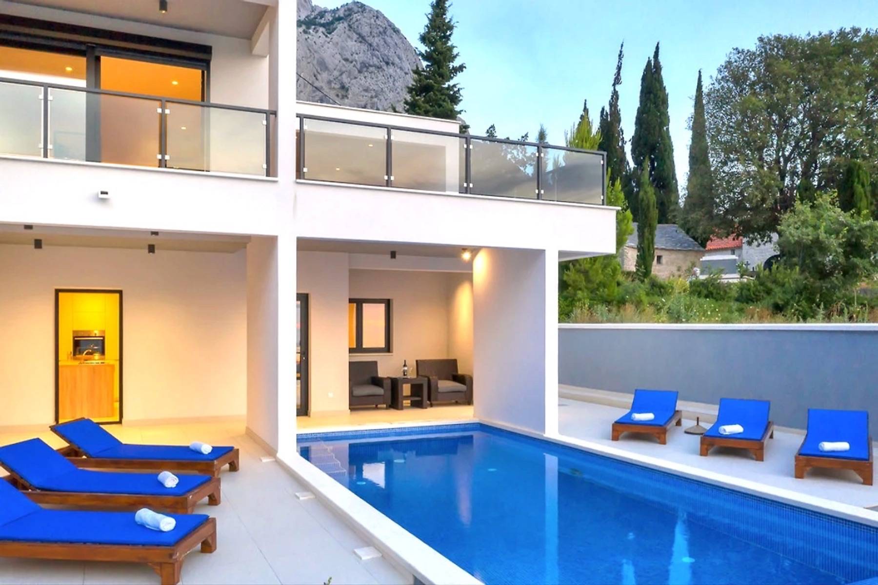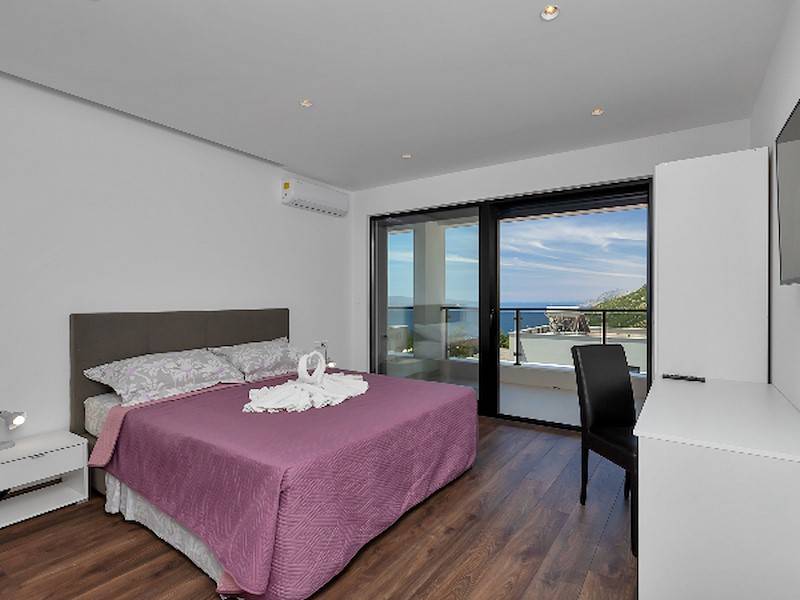 Modernes Ferienhaus in ruhiger Hanglage, oberhalb der Küste und Ortes Baška Voda, im Ort Bast. Die Räume verteilen sich über zwei Etagen. In der unteren Etage befindet sich das geräumige Wohzimmer mit offener Küche, sehr modern eingerichtet und komplett ausgestattet. Sitzsofa, SMART Sat/Tv, ein Gäste WC mit Waschmaschine. Von hieraus gelangt man auf die schöne große, zum Teil überdachte Terrasse mit beheiztem Überlaufpool. Es stehen Ihnen die Sonnenliegen und eine Aussendusche zur Verfügung. Auf der ersten Etage befinden sich insgesamt drei Doppelbett Schlafzimmer, jedes mit eigenem Badezimmer (Ensuite), alle Zimmer mit Klimaanlage und SAT/TV ausgestattet. Eine Dachterrasse mit Gartenmöbeln und Meerblick, zum Teil überdacht, ein Sonnenschirm. Das moderne Ferienhaus ist brand neu, sehr gepflegt und geräumig. Familien mit Kindern sind hier willkommen. Kostenloses WLAN gehört zur Grundausstattung. Parkplätze vorm Haus.