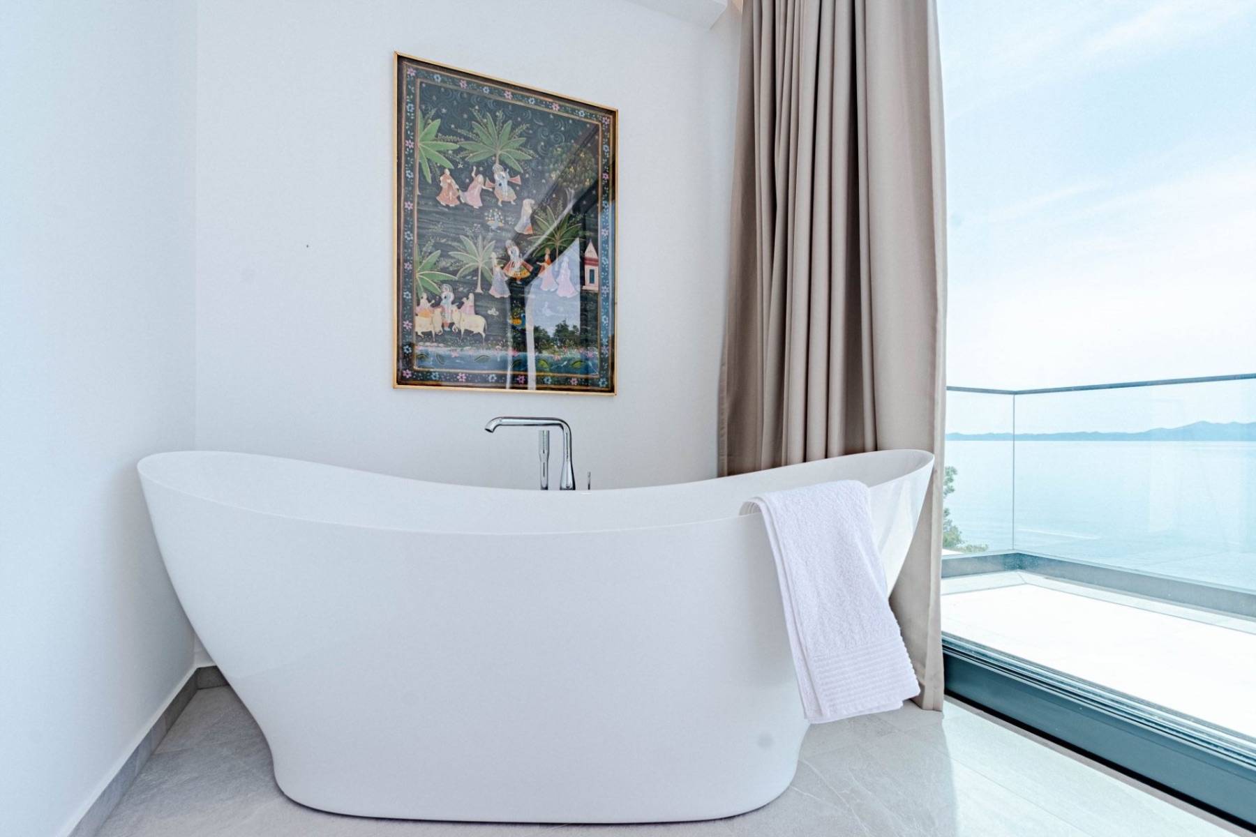 Badewanne freistehend Balkonzugang Doppelwaschbecken Fenster Fußbodenheizung Haartrockner Meerblick Spiegel WC