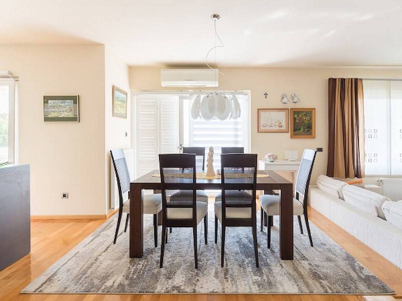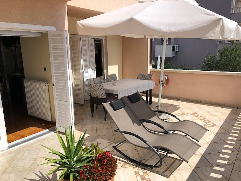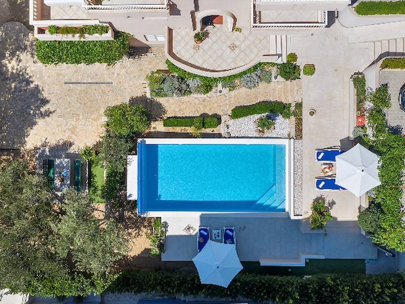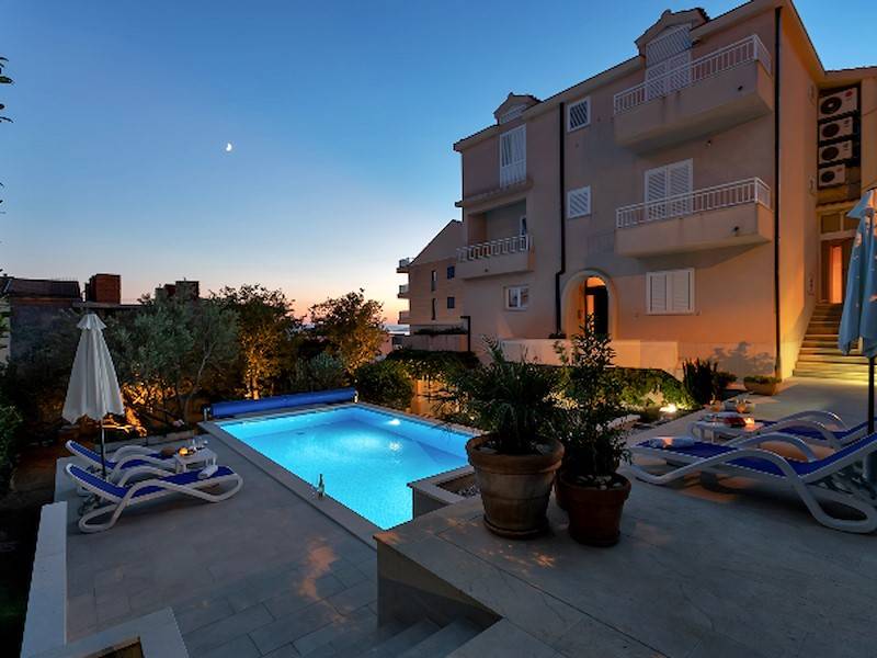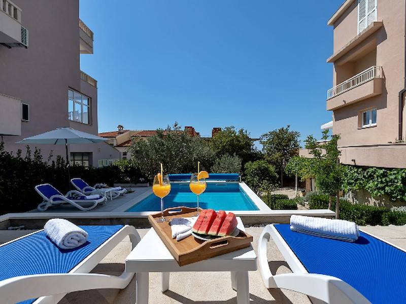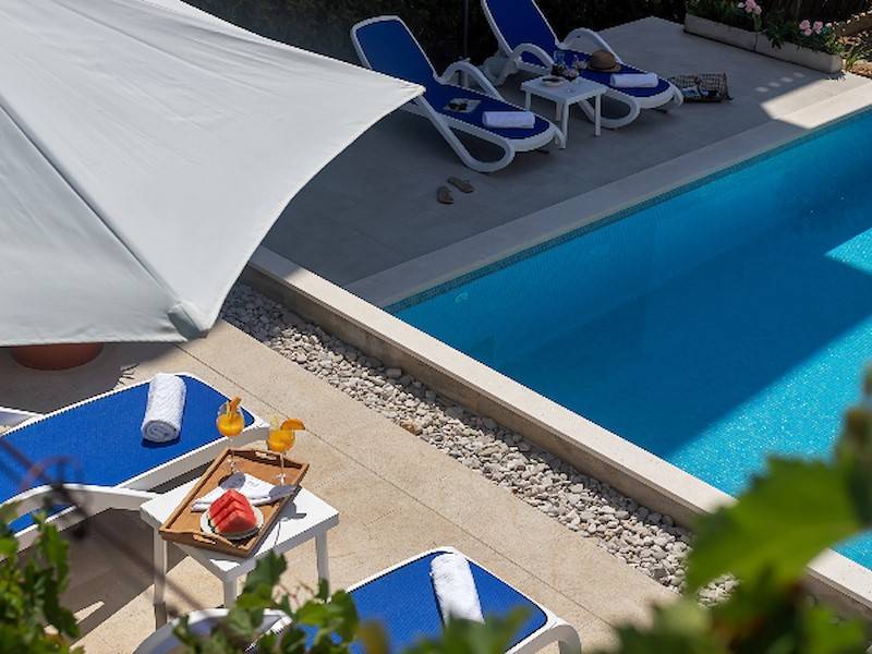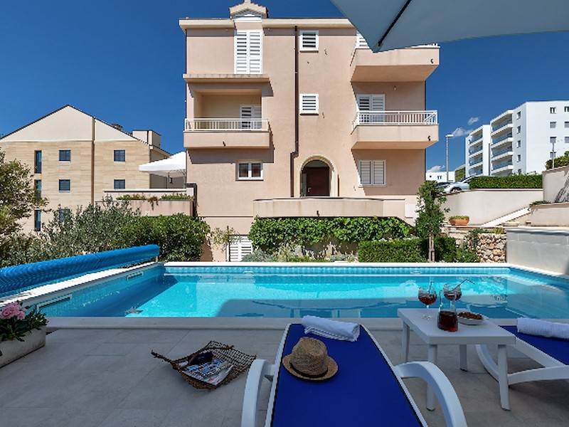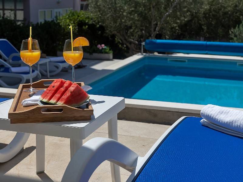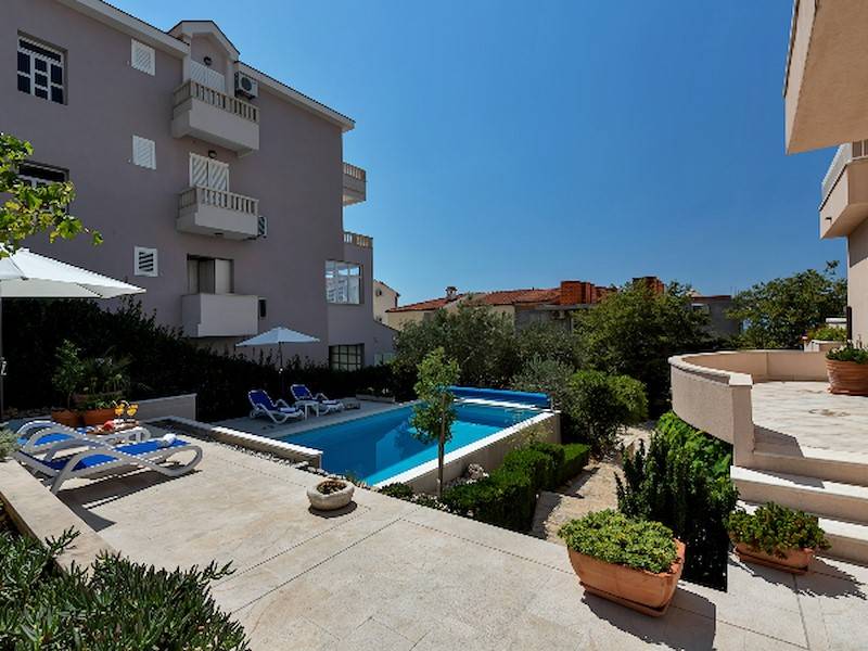 Highlight des Anwesens ist natürlich der große Gemeinschaftspool, der allen Gästen des Hauses zur Verfügung steht. Die Poollandschaft ist mit Sonnenliegen, Sonnenschirm und Außendusche ausgestattet. Garten und Grillmöglichkeit steht ebenfalls allen Gästen des Hauses zur Verfügung. Pool, Garten & Grillmöglichkeit teilt man sich mit der 2. Ferienwohnung in diesem Haus. Durch den beheizbaren Pool ist dieses Ferienhaus ideal für alle Gäste, die gerne schon im Frühling oder erst im Herbst Urlaub in Dalmatien machen wollen und lieber in einem vorgewärmten Pool baden – sehr geeignet auch für kleine Kinder.