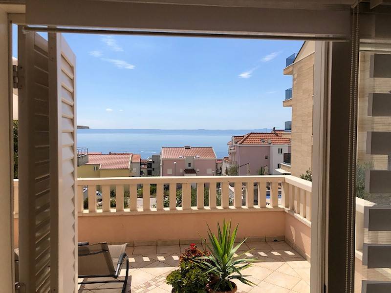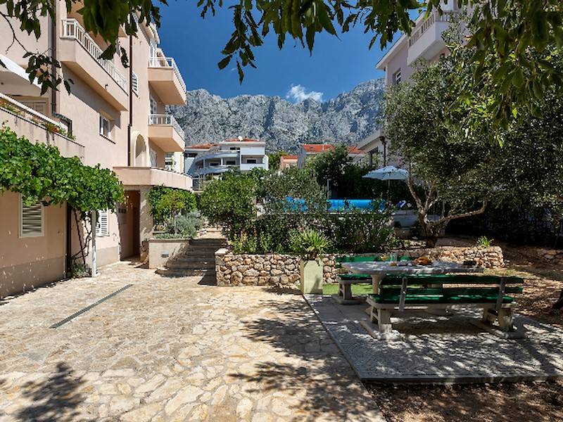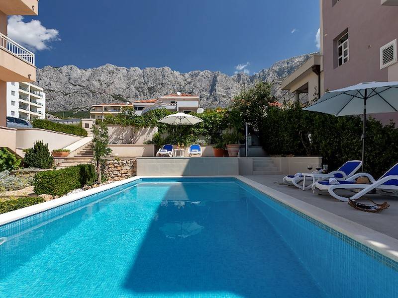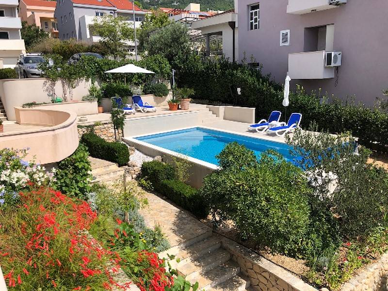 Schöne, moderne Ferienwohnung mit Pool(beheizt) in Makarska, mit Terrasse und Sonnenliegen,Aussendusche und Garten. Ideal für Familien mit Kindern.