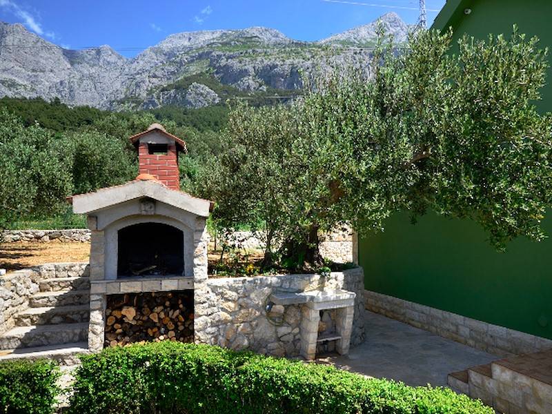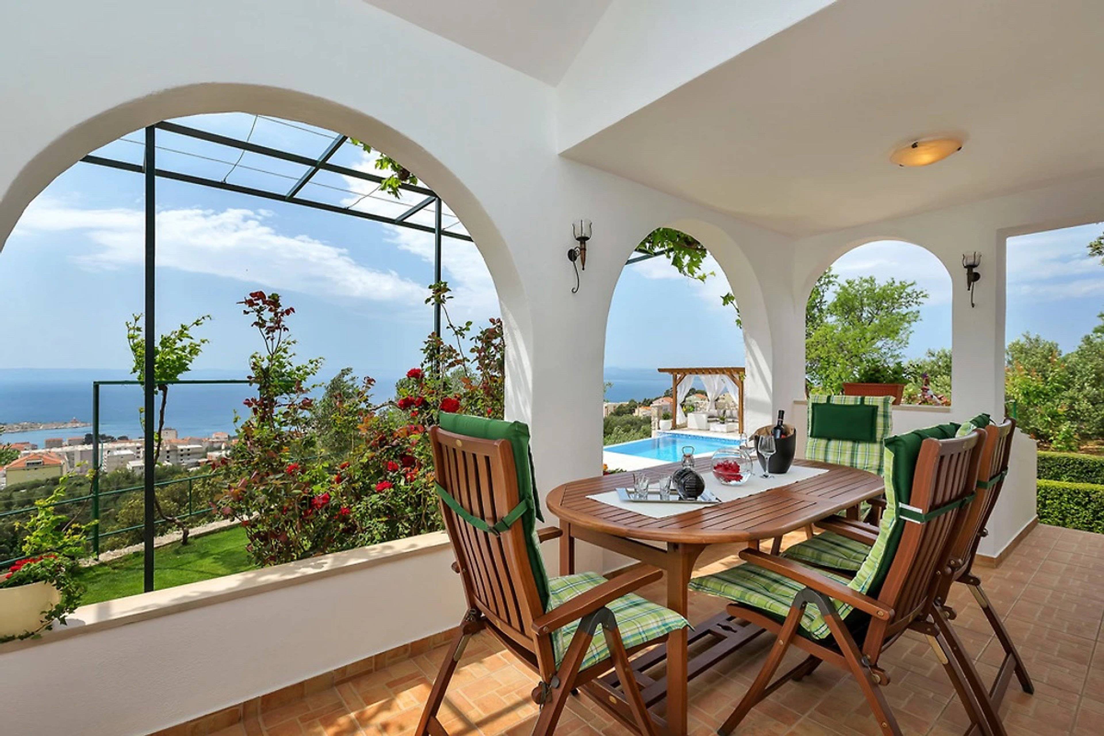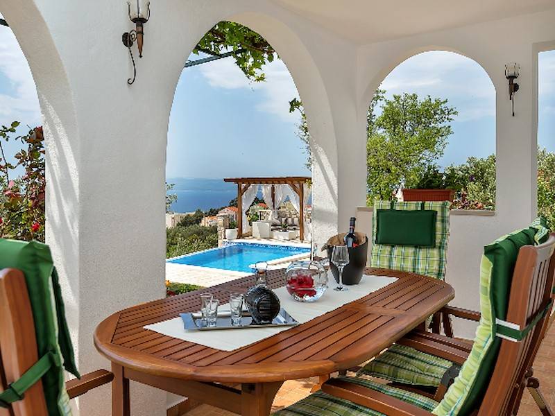 Das Haus ist umgeben von Olivenbäumen, hat einen gepflegten Garten mit Grillplatz. Der Überlaufpool, beheizt, ist ca. 20 m² groß und von hieraus können Sie die wunderschöne Aussicht aufs Meer und die Insel Brac und Hvar genießen.
