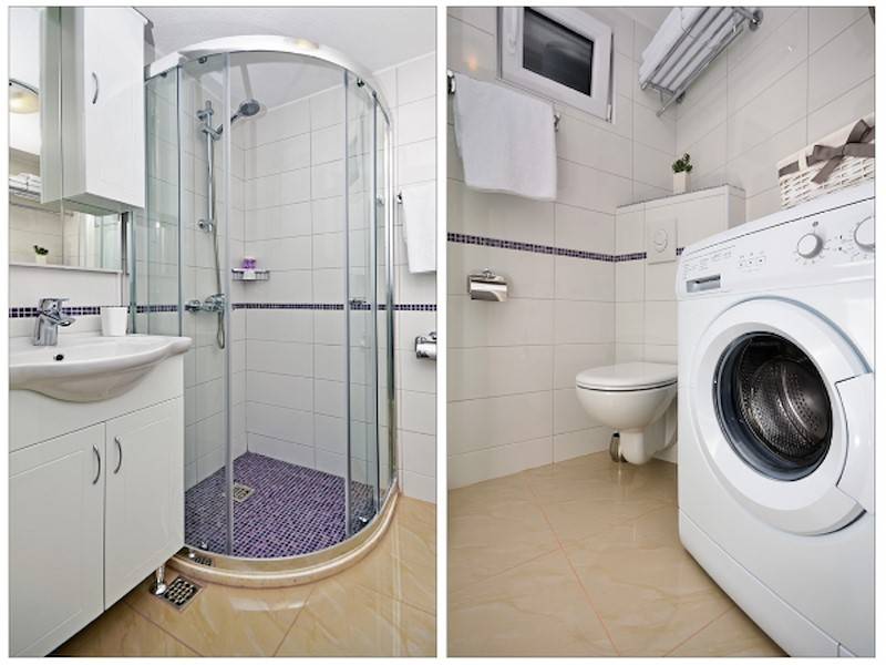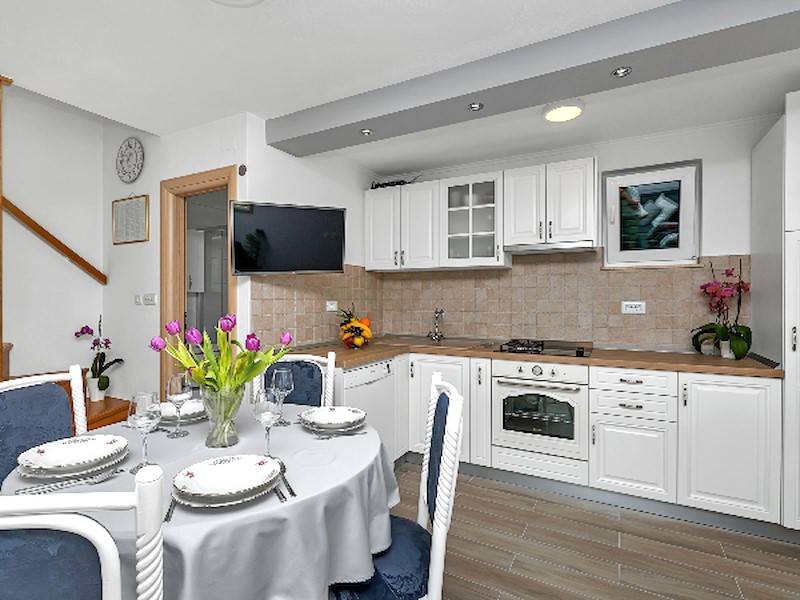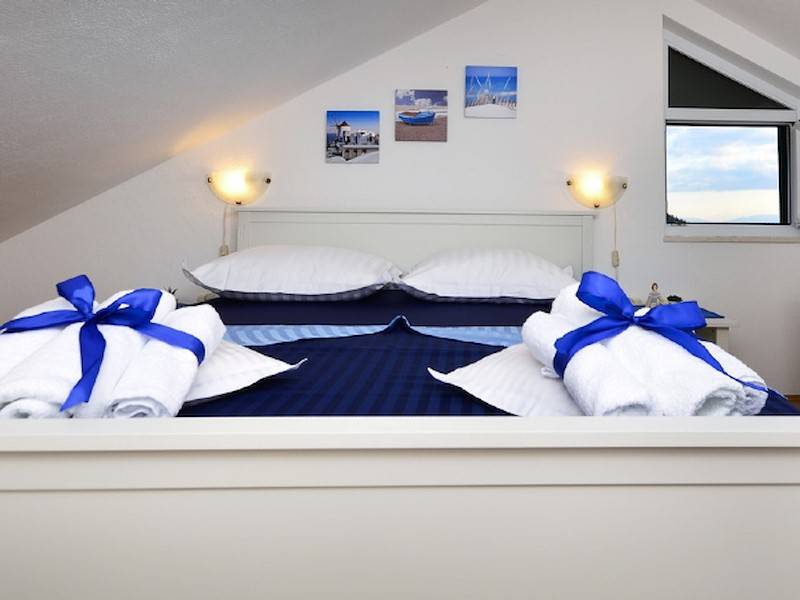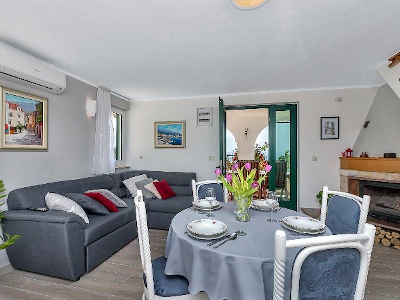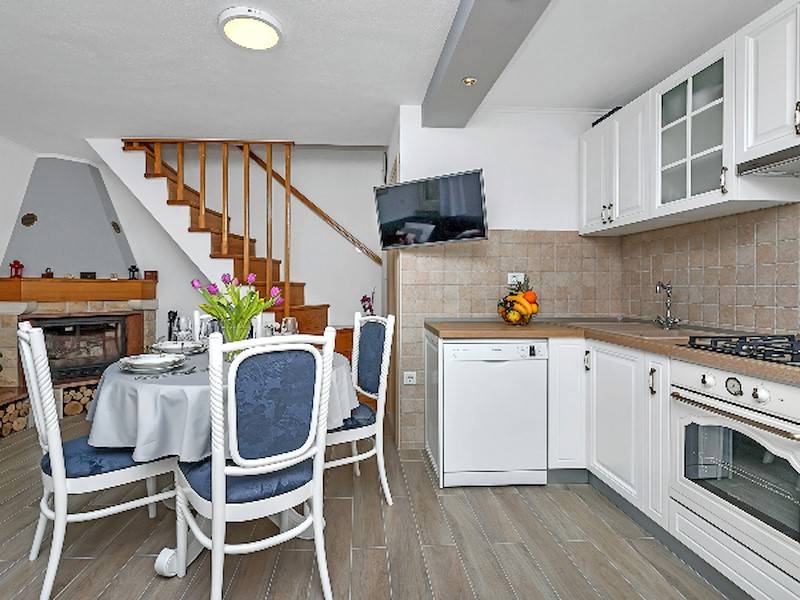 Im Haus befindet sich der Wohnraum mit Essecke und Sitzsofa, Kamin, Küche und das Badezimmer. Auf der ersten Etage steht das Schlafzimmer mit Doppelbett und einem Einzelbett, eine Loggia mit Sitzgarnitur mit Blick aufs Meer und die Stadt. Im Keller befindet sich das zweite Doppelbett Schlafzimmer mit Badezimmer. Diese Etage hat einen separaten Eingang und ist mit der oberen Etage mit eine Aussentreppe verbunden(Anliegerwohnung).
