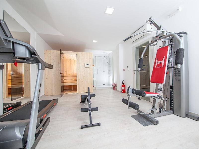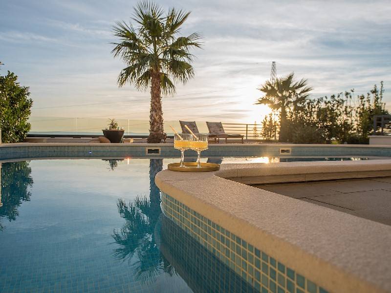 Schöne Terrasse mit Pool und Sonnenligen mit Meerblick. Sauna und Fitnessraum.