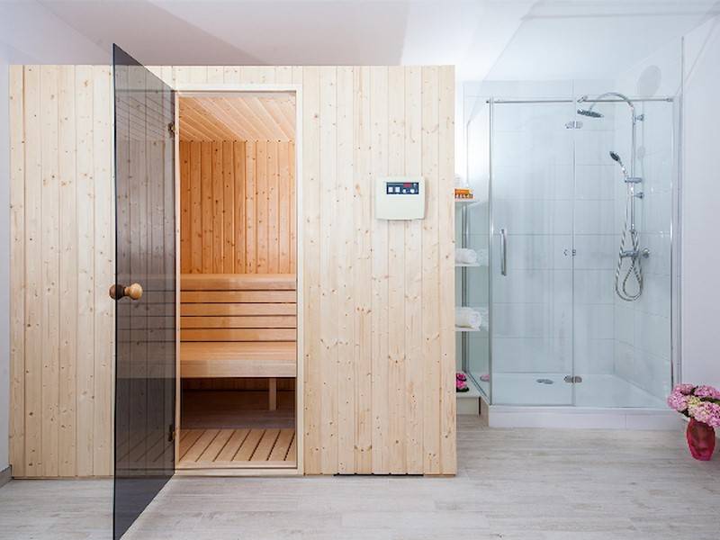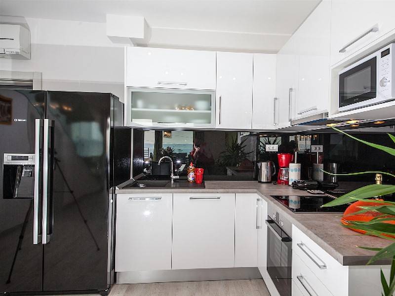 Das moderen Ferienhaus ist in drei Stockwerken unterteilt. Im Erdgeschoss befindet sich ein großer, offener Wohnbereich mit Küche und direktem Zugang zu der Terrasse mit Pool und Meerblick. Die großzügige Terrassenfläche erstreckt sich auf 200 m2 rund um das Haus. In einem separaten Raum befindet sich noch eine Sauna und der Fitnessraum.