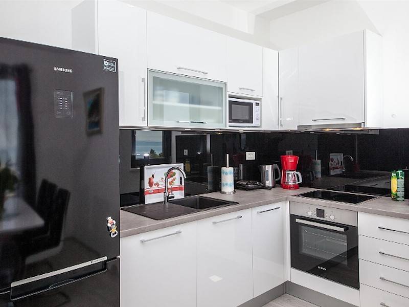 Im 2. Stock, mit separatem Eingang, befindet sich ein großer Wohnbereich mit voll ausgestatter Küche, Balkon und Meerblick. Zwei Schlafzimmer mit Doppelbett, ein Badezimmer mit Dusche und Waschmaschine..