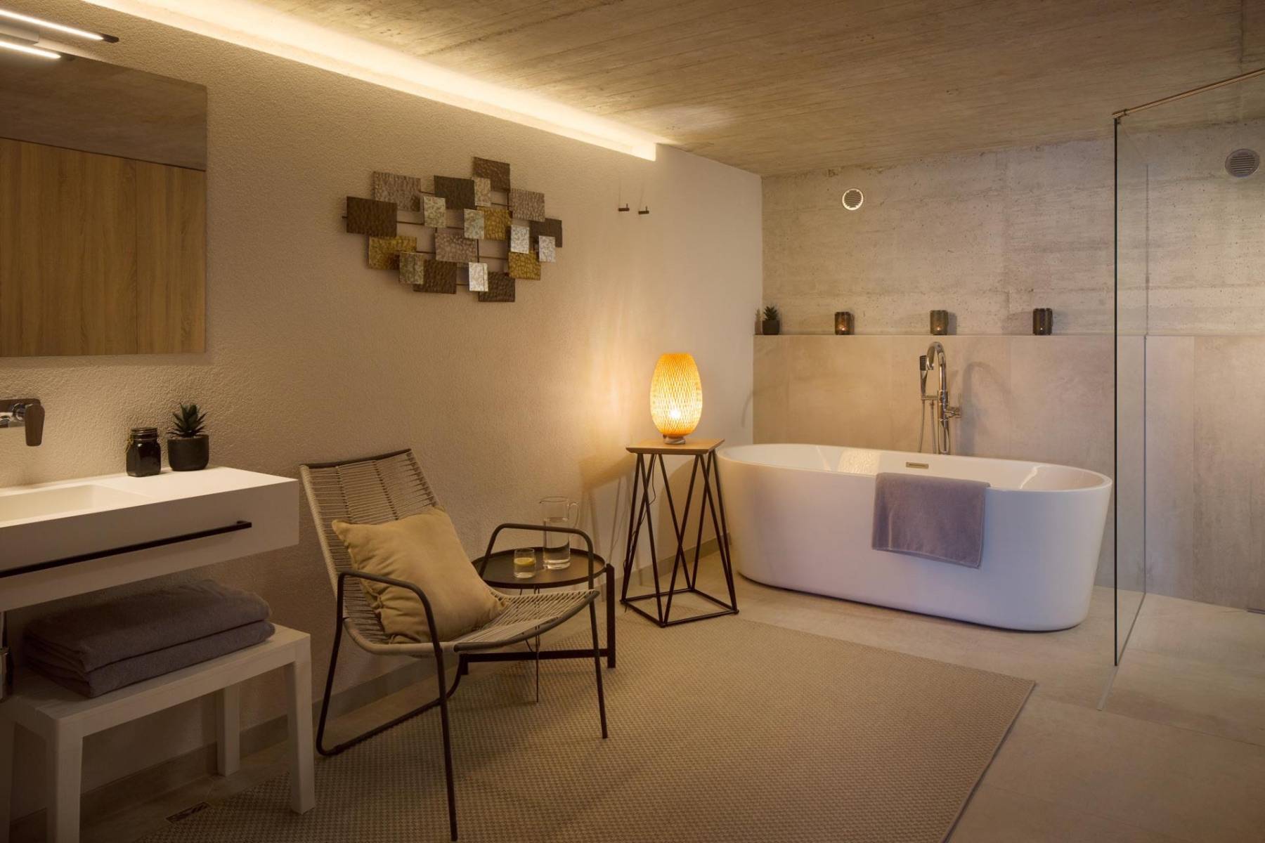 Neben dem exquisiten Wohn-, Ess- und Kochbereich sind im Erdgeschoss zwei Schlafzimmer mit Terrassenzugang und zwei Badezimmern vorhanden. Eines davon ist mit einer freistehenden Badewanne und einer Sauna ausgestattet. Zwei weitere Schlafzimmer und Badezimmer befinden sich im Obergeschoss.