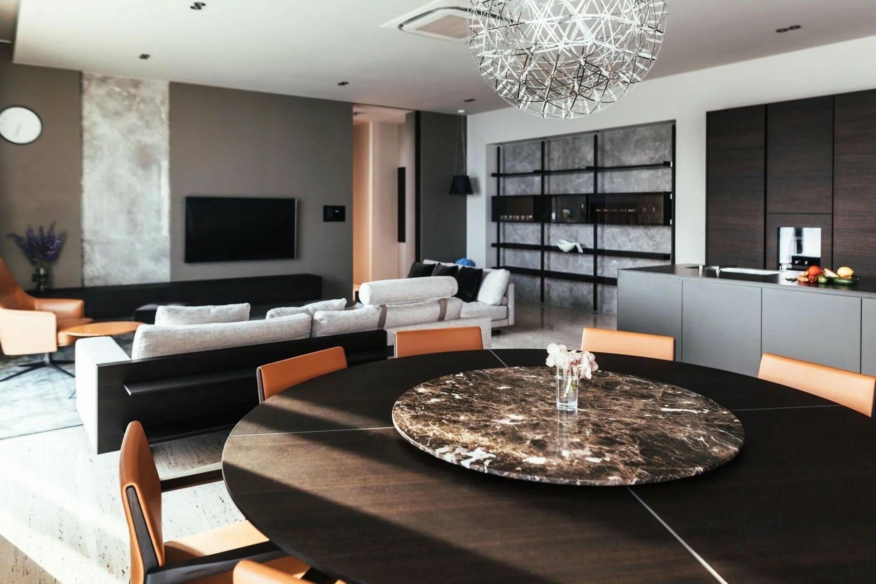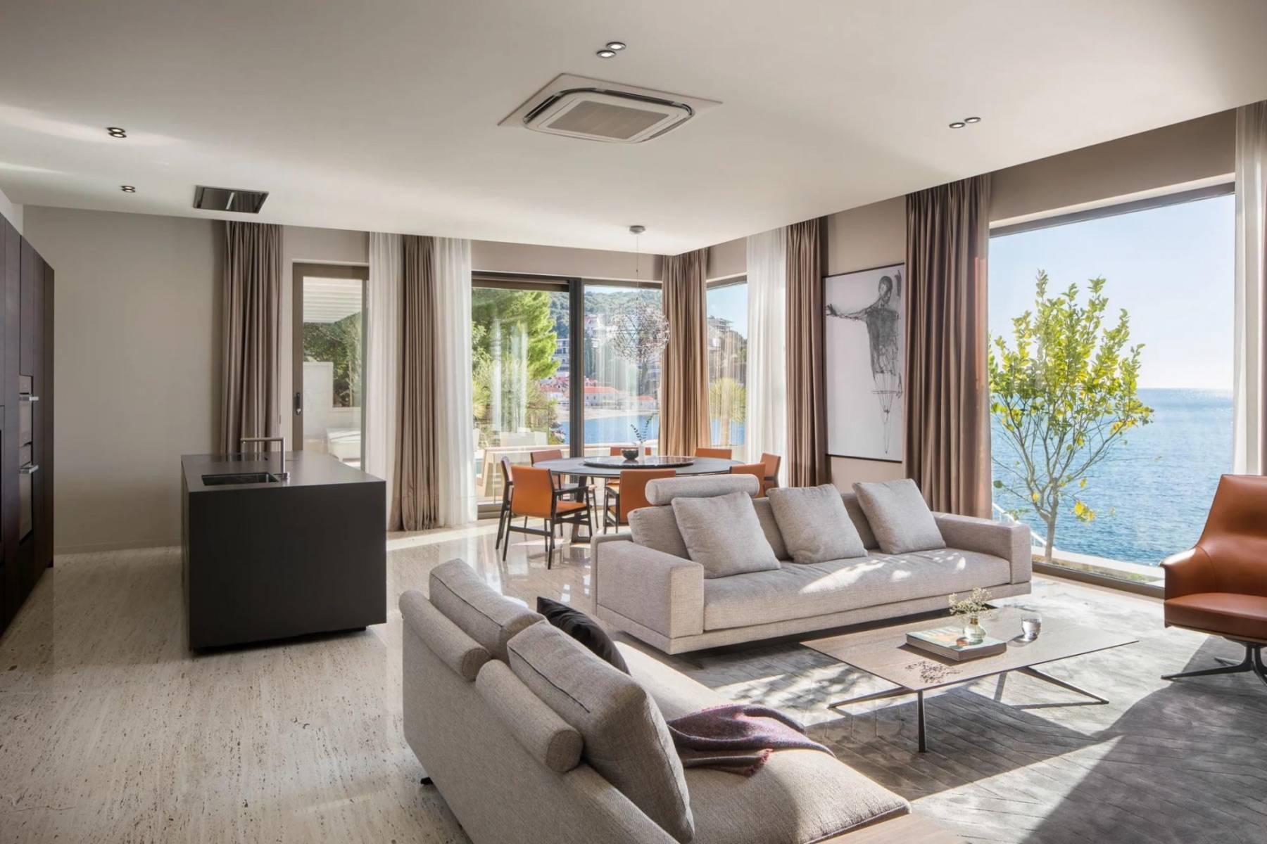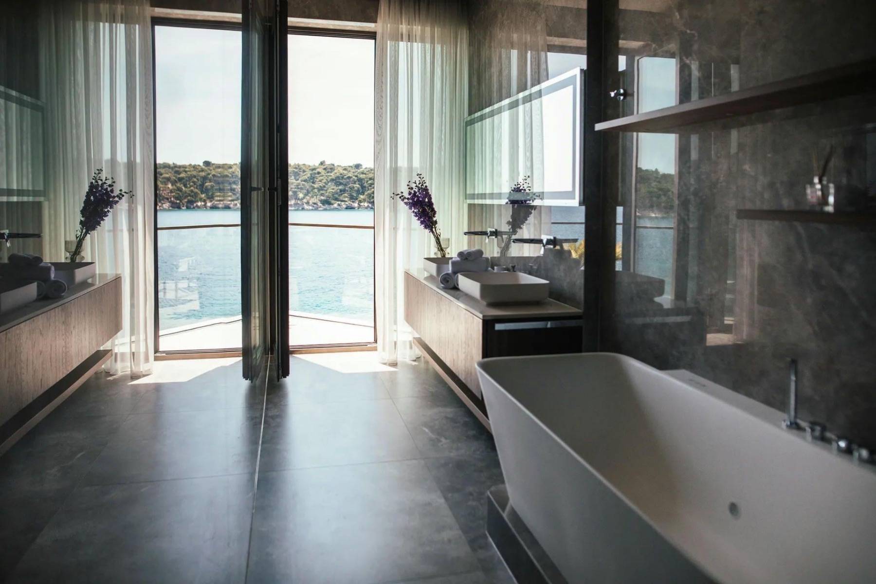 Ein weiteres Highlight dieser Luxus Villa ist der Außenbereich, der bei der warmen und goldenen Sonne Kroatiens nach draußen lockt. Tauchen Sie ein in den beheizten Infinitypool und genießen den Blick auf das Meer und das gegenüberliegende Festland. Rund um den Pool laden Sonnenliegen und Loungemöbel zum relaxen ein. Eine Outdoorküche und ein großer Esstisch findet man wind- und sonnengeschützt unter einem Dach.