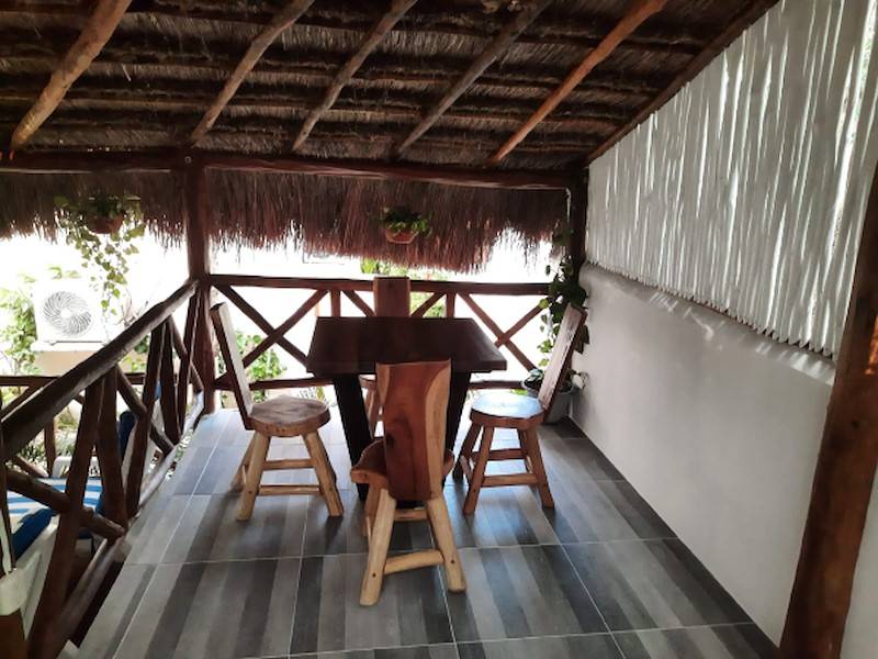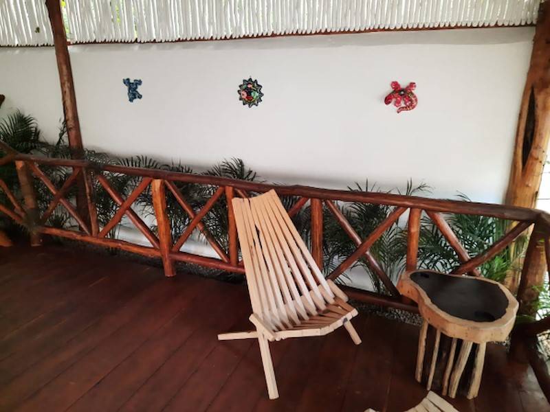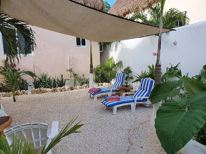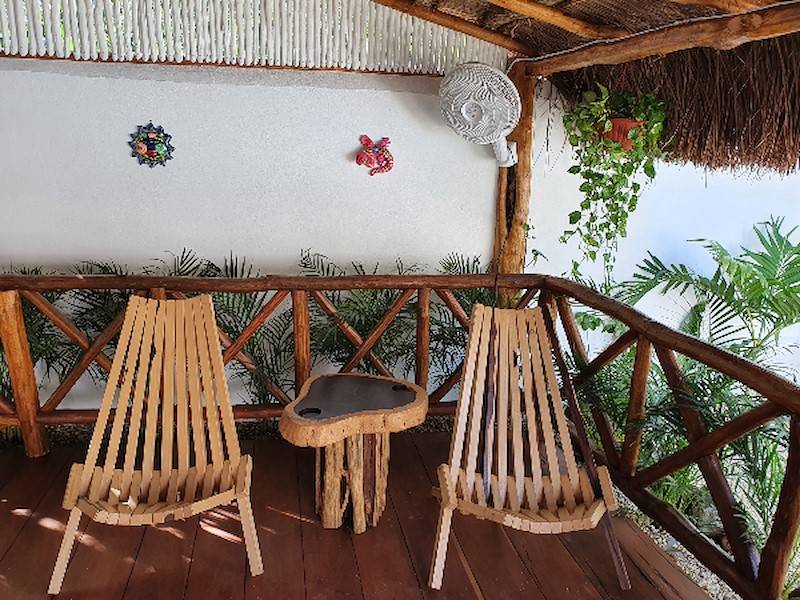 Das im Garten liegende, typisch mexikanische und große Holz-Palapa mit rustikalem Holzdeck und erhöht liegender Terrasse sowie typisch mexikanischer Deko bietet genug Schatten zum Lesen, Faulenzen oder Yoga machen. Man kann dort sein Frühstück einnehmen, Sonnenliegen und bunte Hängestühle laden zum Verweilen ein. Auf der Sonnenterrasse im Garten mit Blick auf den Pool und Hängematten lässt es sich herrlich entspannen. Im Garten unter Palmen gibt es eine weitere Sonnenterasse mit bunten Hängematten. Das Haus hat eine eigene Aufhänge-Möglichkeit für Wäsche im Garten.