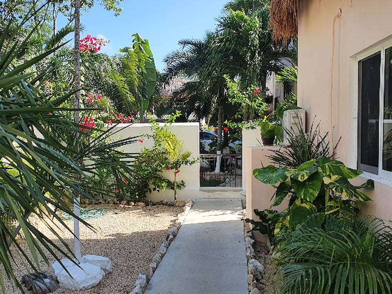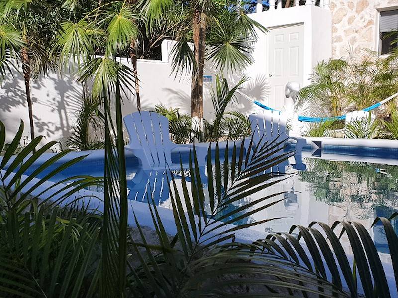 Der Garten ist eingerahmt von einer weißen Mauer, bewachsen mit etlichen schattenspendenden, einheimischen Palmen, tropischen Pflanzen und bunten Blumen. In der Mitte der beiden Häuser und des Apartments liegt eingekuschelt der karibische Pool mit kleinem Wasserfall und Sitzgelegenheit direkt im Wasser. Der Garten bietet Sonne und Ruhe und lässt Euch vom ersten Moment an entspannen und den Alltagsstress vergessen.