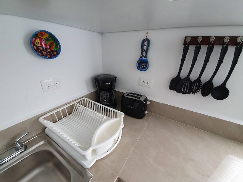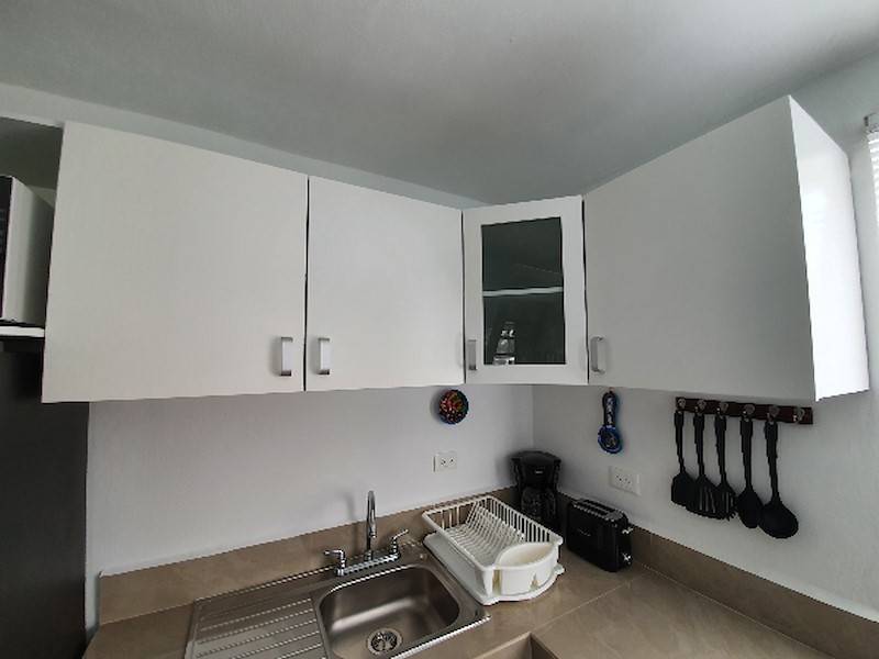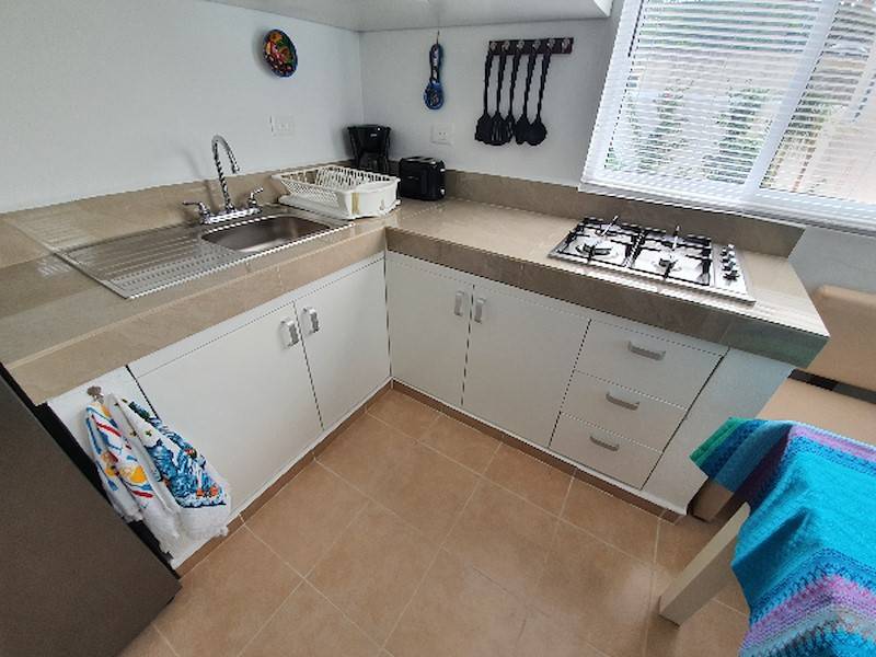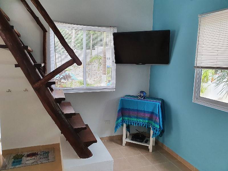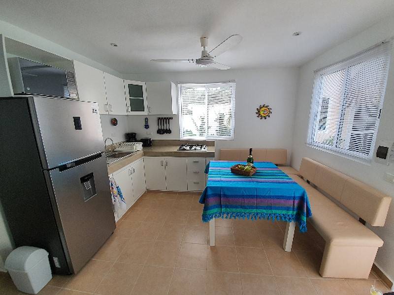 Die voll ausgestattete Wohn-Küche mit Kühlschrank/Gefrierfach, Kaffeemaschine, Gas-Kochfeld, Toaster und Mikrowelle hat eine angrenzende Sitz-Essecke und eignet sich perfekt für Selbstverpfleger. Sie können aber auch ganz gemütlich auf der Terrasse im Garten-Palapa frühstücken oder essen. Das Wohnzimmer ist karibisch eingerichtet mit ausziehbarer Schlafcouch (Schlafmöglichkeit 3. und evtl. 4. Person), rustikalem Wohnzimmertisch und TV-Flachbildschirm.