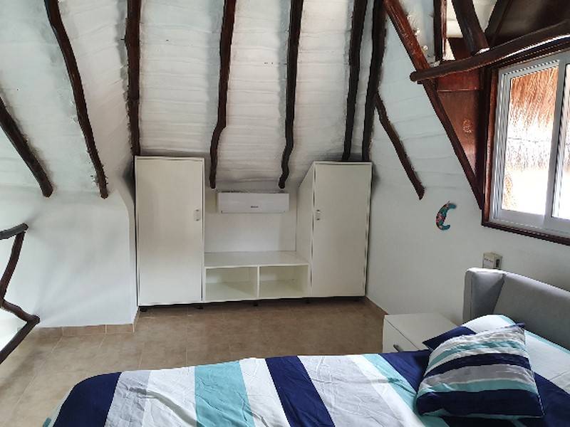 Die Unterkunft mit Pool- und Gartenblick ist ca. 60 m2 groß und erstreckt sich über 2 Ebenen. Das Haus mit 2 Zimmern ist sehr liebevoll ausgestattet und dekoriert, mit modern eingerichteter Küche und Duschbad/WC. Das Schlafzimmer mit King-Size-Bett und kleinen Einbauschränken sowie Lampe mit USB-Stecker zum Aufladen von Geräten liegt oben auf einer offenen Galerie unter dem Dach. Diese ist nur über diese rustikale Holztreppe erreichbar. Im Wohnzimmer sowie im Schlafzimmer sind Klimaanlagen und Ventilatoren vorhanden.