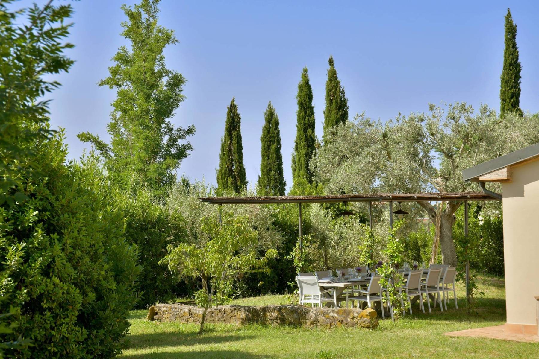 Die Zufahrt erfolgt über eine elektrisches Zufahrtstor mit einer Zypressen- und Olivenhainen gesäumten 200 m langen Zufahrt.