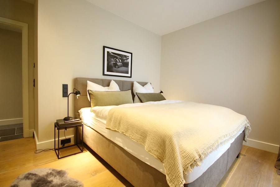 Das Treppenhaus und die Treppenstufen sind kunstvoll beleuchtet. Auf jeder Etage befinden sich jeweils zwei harmonisch eingerichtete Schlafzimmer mit großen Doppelbetten und einem eigenen Flachbildschirm. Zu jedem Schlafzimmer gehört ein mit Handtuchheizkörper und Kosmetikspiegel eingerichtetes Badezimmer. In einem der Bäder lädt eine Badewanne zur Tiefenentspannung ein, während man den Blick durch ein kleines rundes Sprossenfenster schweifen lassen kann.