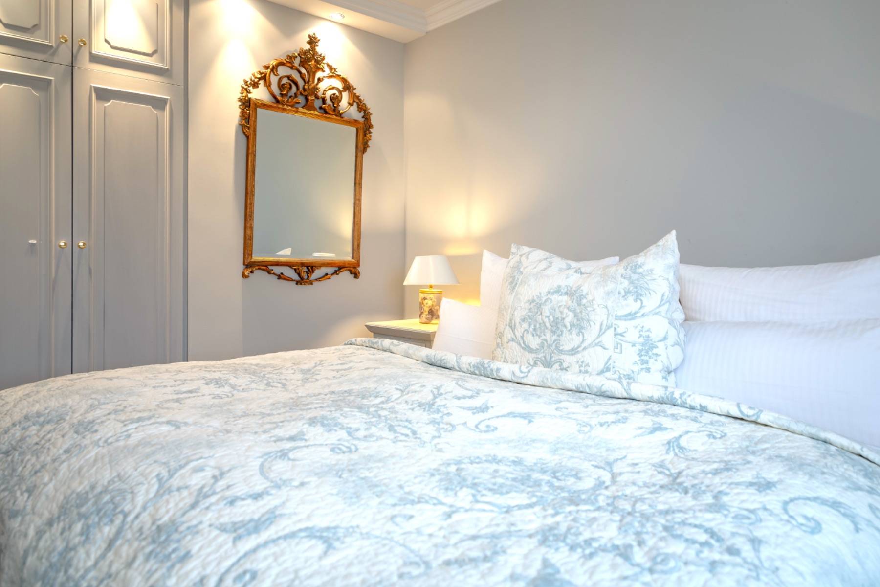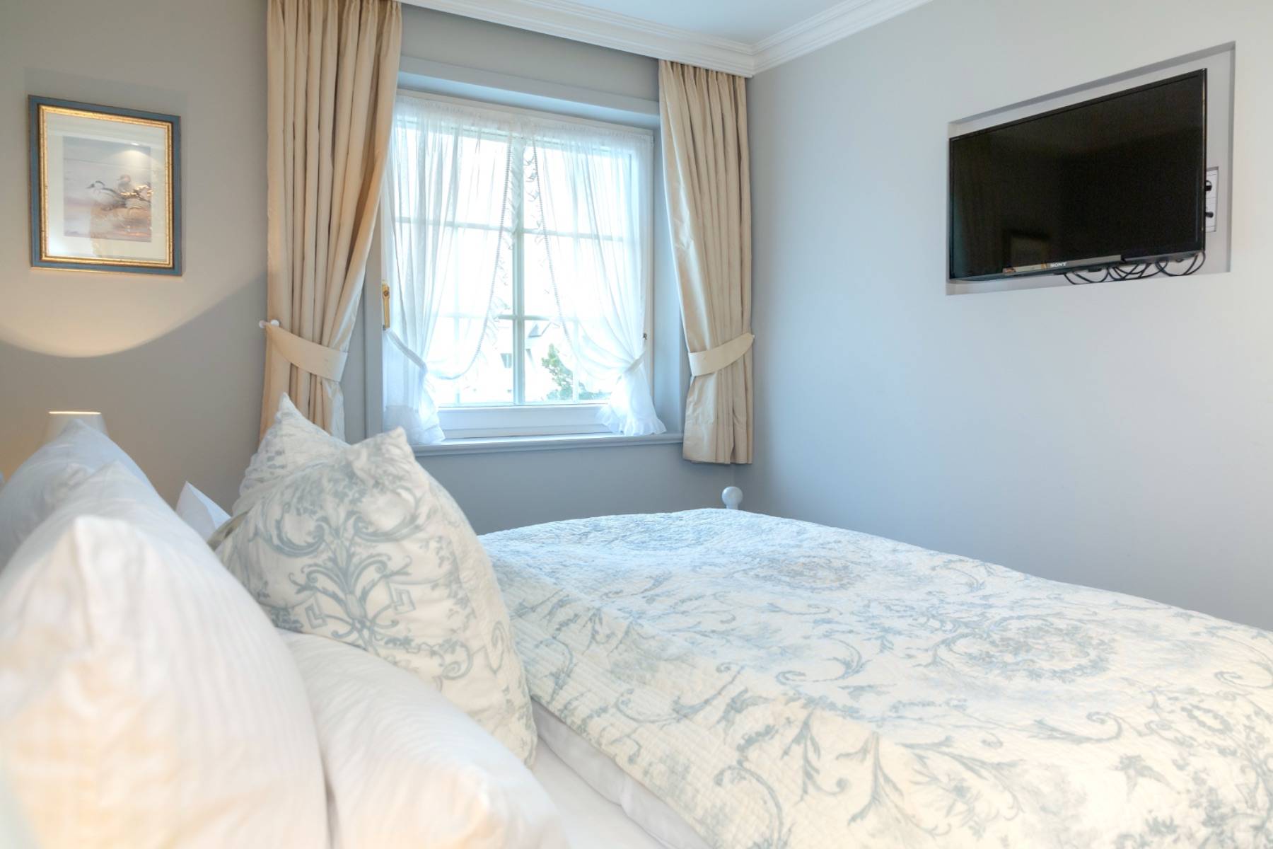 Das Schlafzimmer ist Ton in Ton angelegt und verfügt über einen weiteren Flachbildschirm, ein Herrendiener und einen maßeingebauten Wandschrank für die Garderobe.