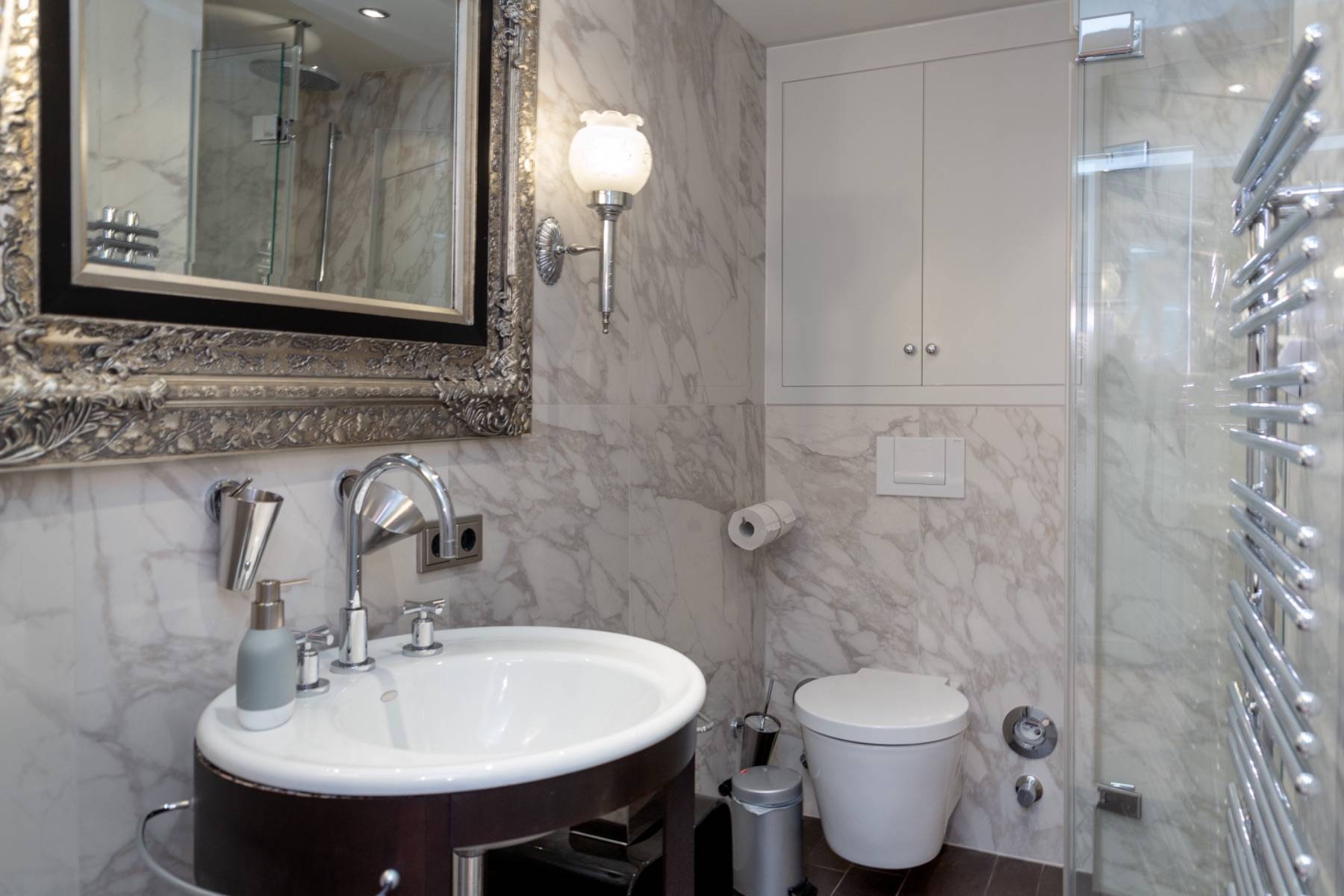 Das Duschbad mit Designelementen von Philip Starck, einer ebenerdigen Dusche und einem zusätzlichen verchromten Handtuchheizkörper erfrischt die Sinne.