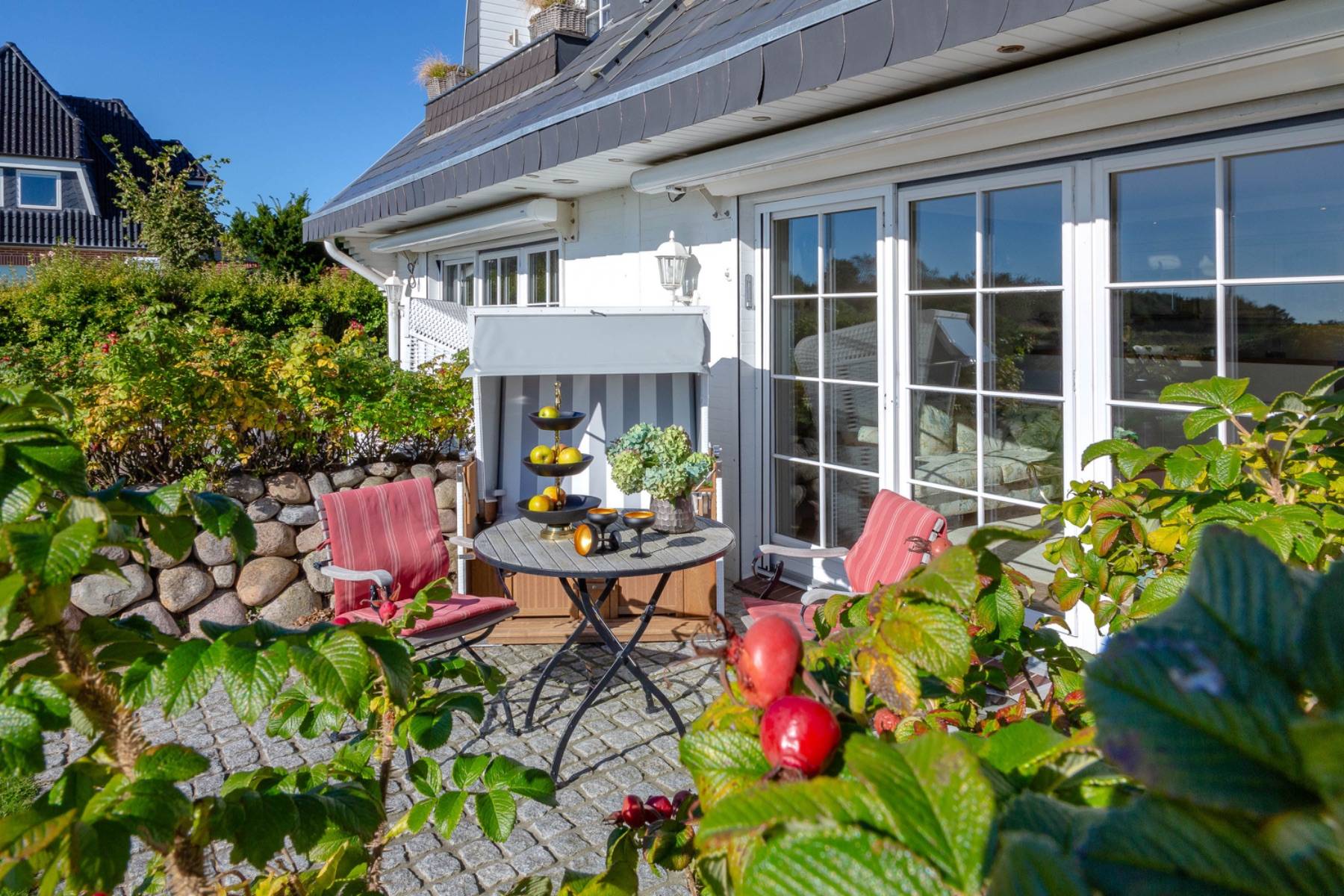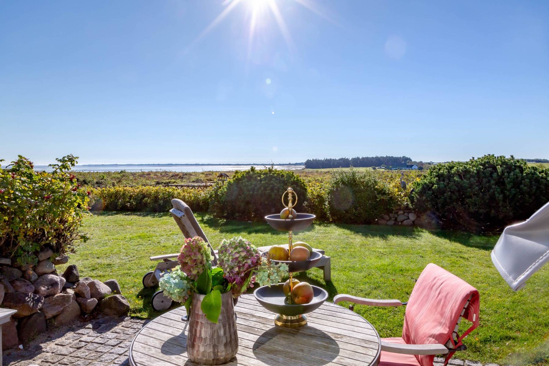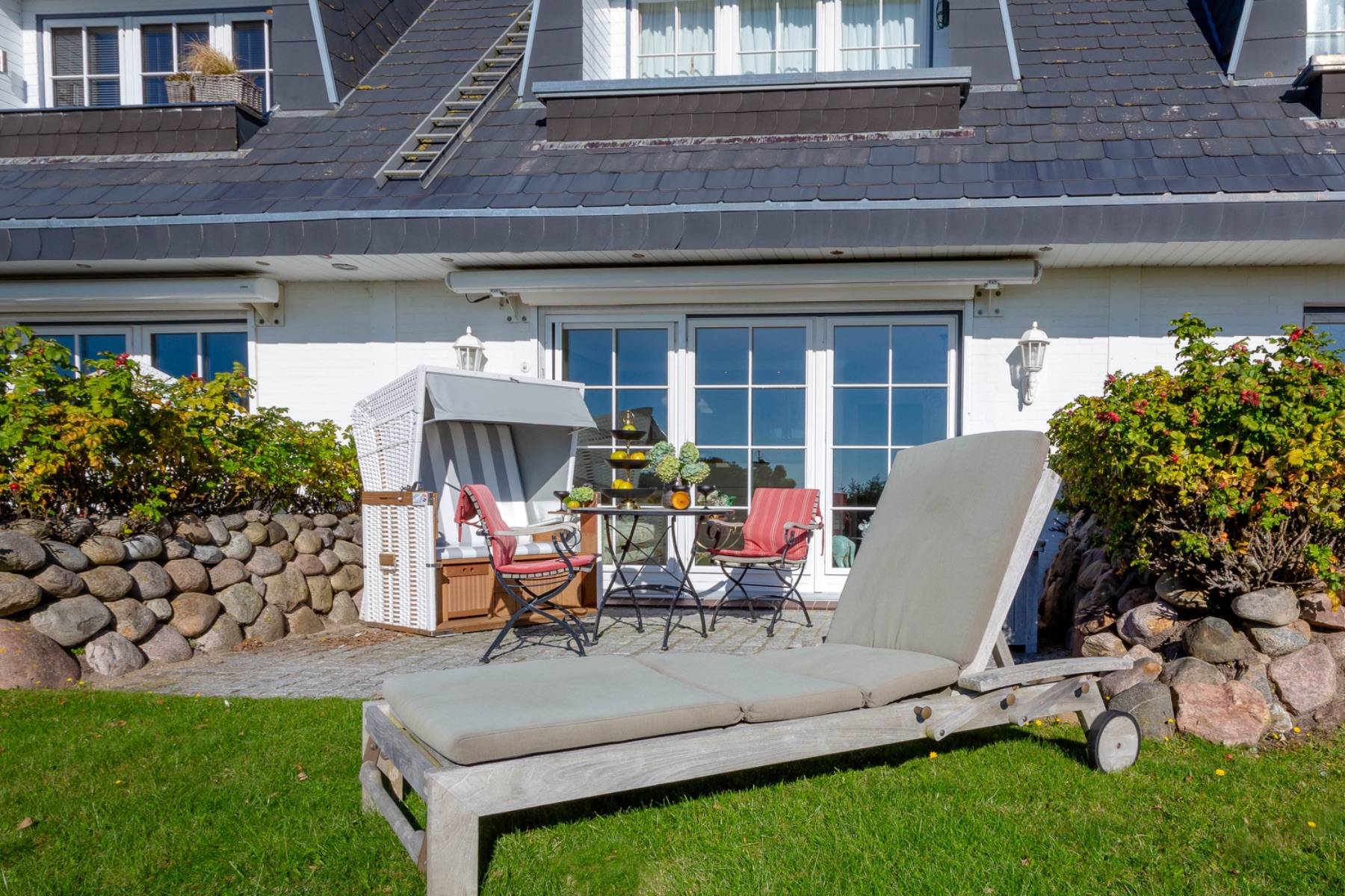 Die Terrasse ist mit hochwertigen Gartenmöbeln und einer Sonnenliege von Garpa ausgestattet, von der man einen wunderbaren Panoramablick auf das Wattenmeer genießen kann. Darüber hinaus spendet eine elektrische Markise bei Bedarf ausreichend Schatten auf der Terrasse, an der auch kleine freilaufende Hasen regelmäßig den Garten aufsuchen.