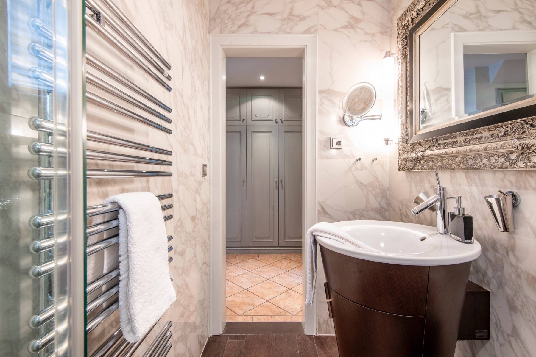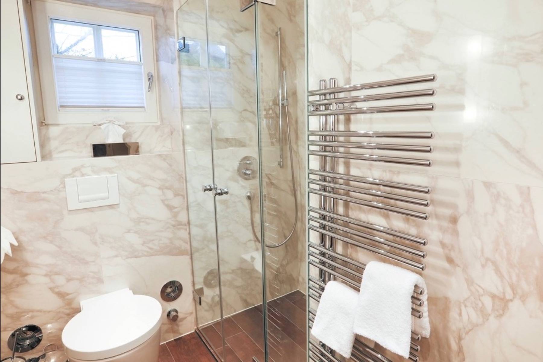 Das Duschbad mit Designelementen von Philippe Starck, einer ebenerdigen Dusche und einem zusätzlichen verchromten Handtuchheizkörper erfrischt die Sinne.