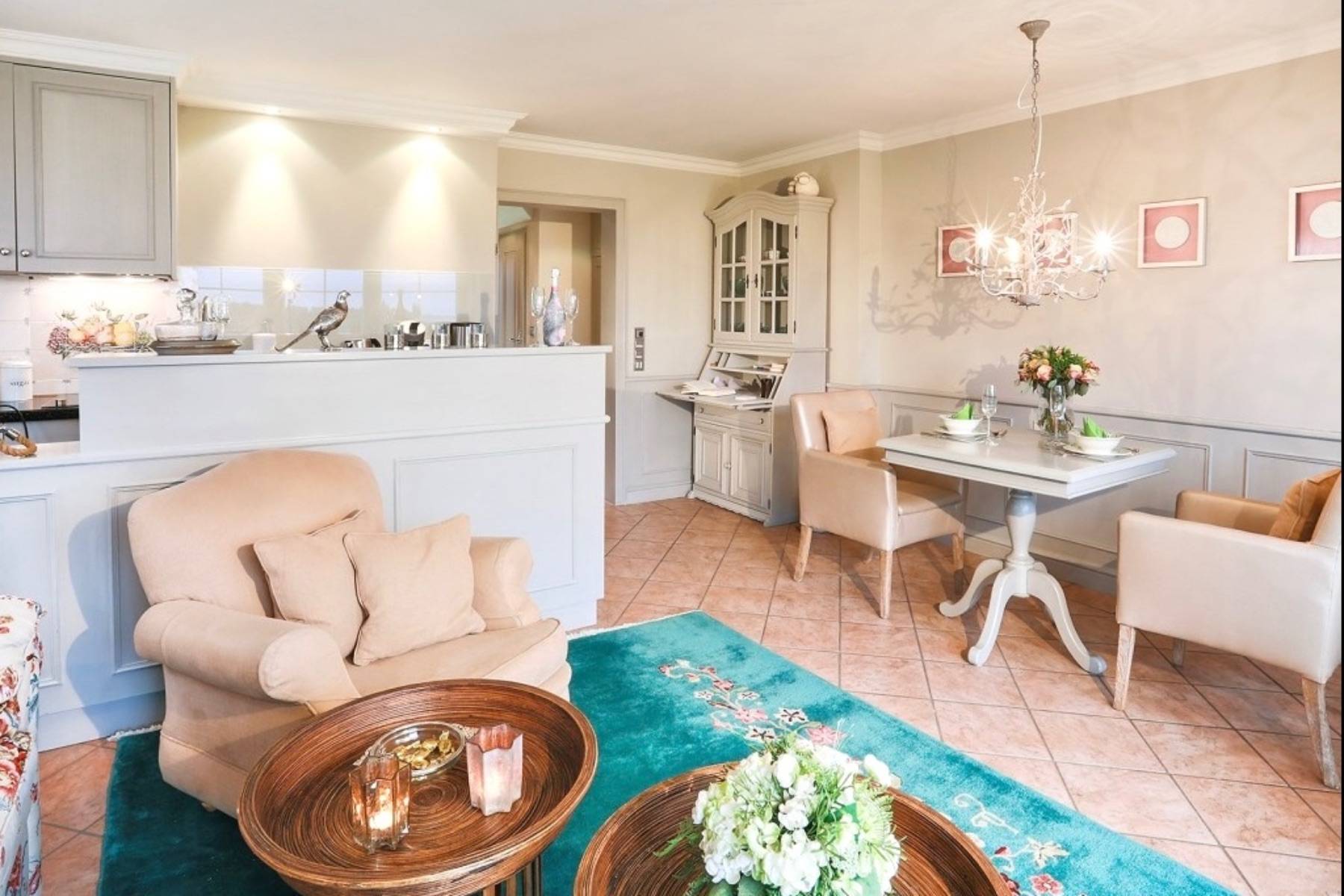 Hochwertige Polstermöbel mit zahlreichen Kissen und ein Ledersessel garantieren gemütliche Stunden vor dem Flachbildschirm. Wer möchte, kann in der in den Raum integrierten Küchenzeile mit Theke sein Abendessen kochen und dieses am Esstisch genießen.