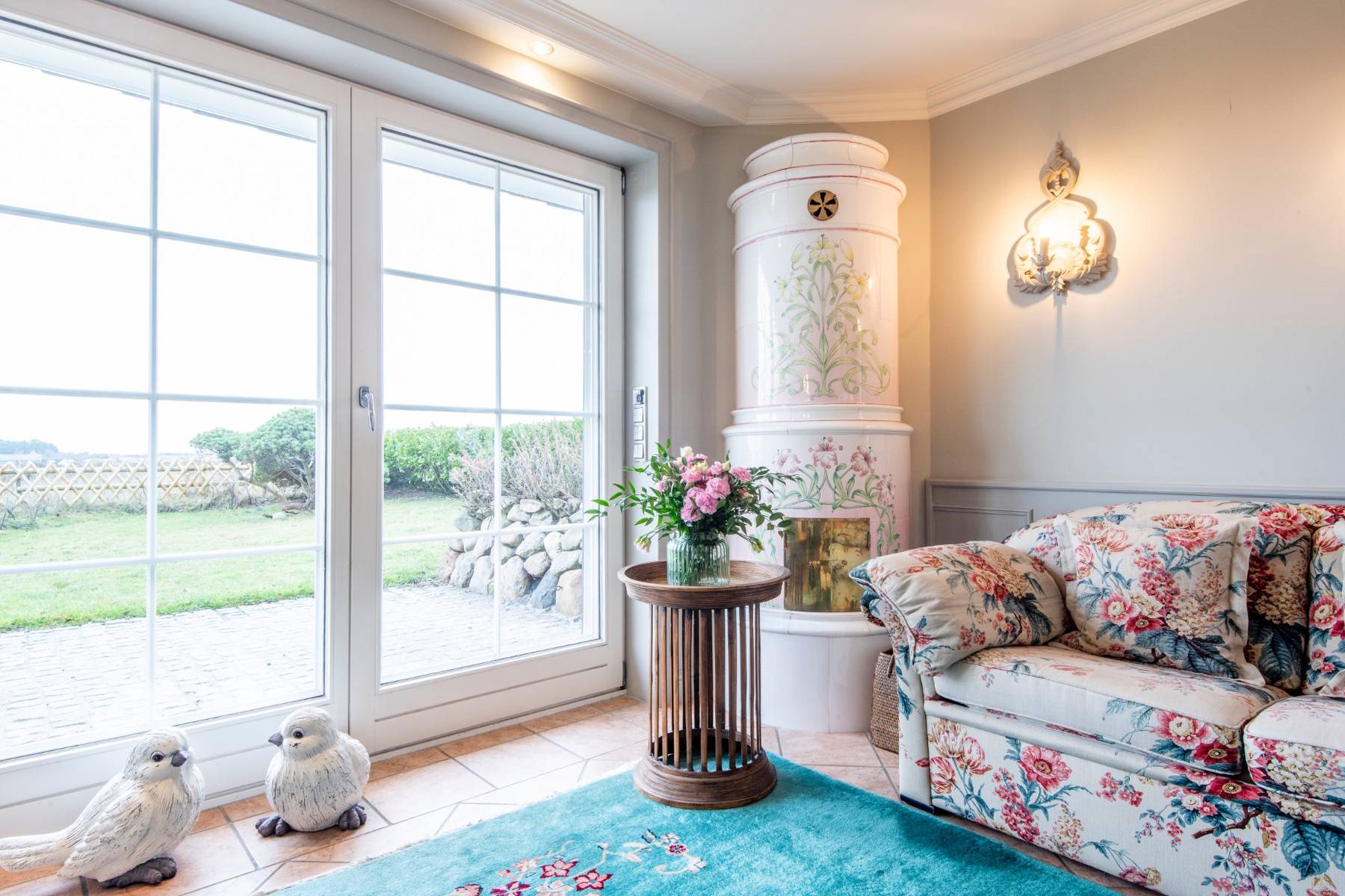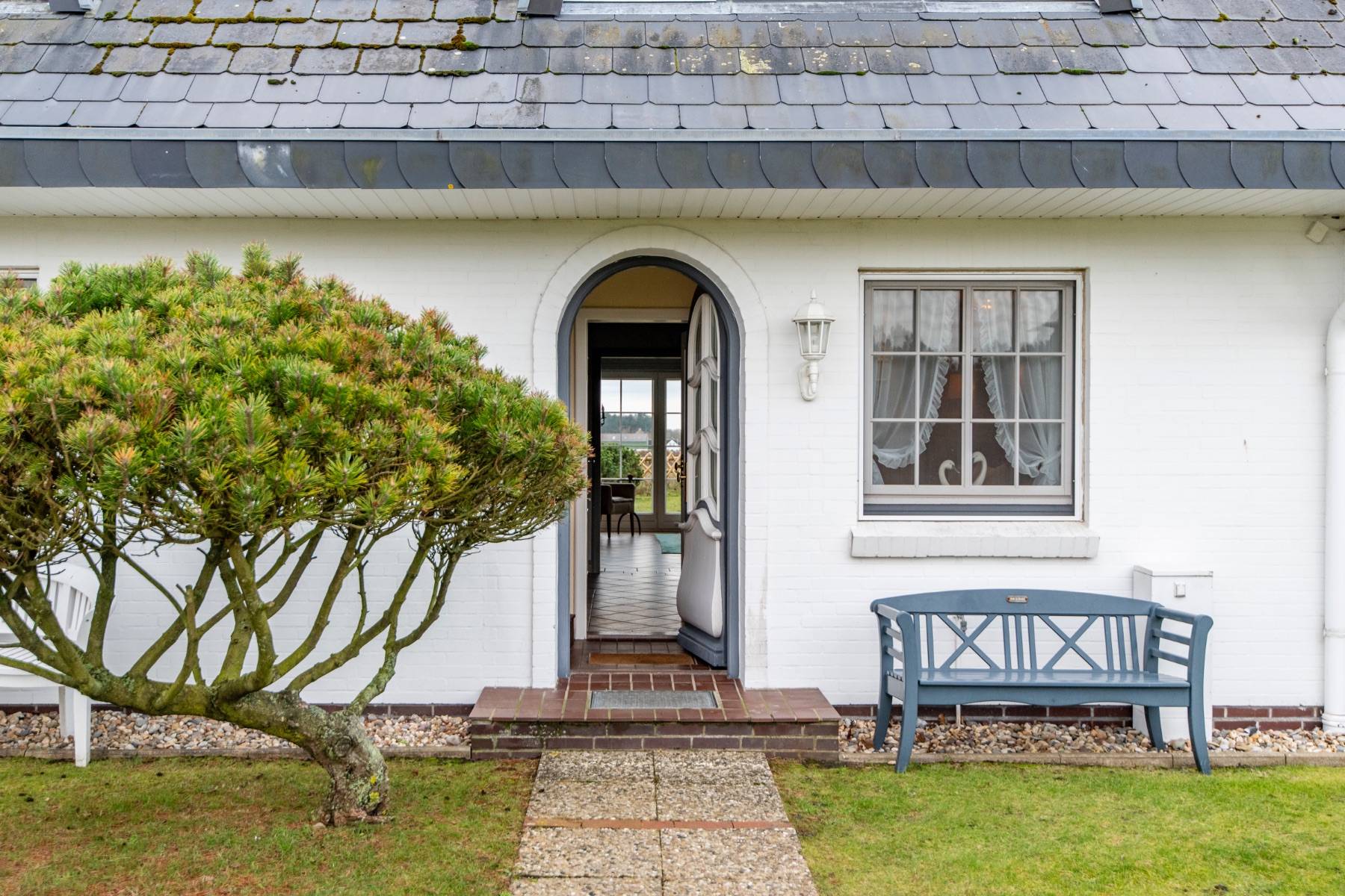 Neu saniert und hochwertig eingerichtet, finden zwei Personen viel Raum und höchsten Komfort. Der Blick führt von der Diele in den Wohnraum durch die bodentiefen Fensterelemente auf die Terrasse und in den Garten. Von hier aus hat man einen atemberaubenden Panoramablick über die Heidelandschaft und auf das Wattenmeer.