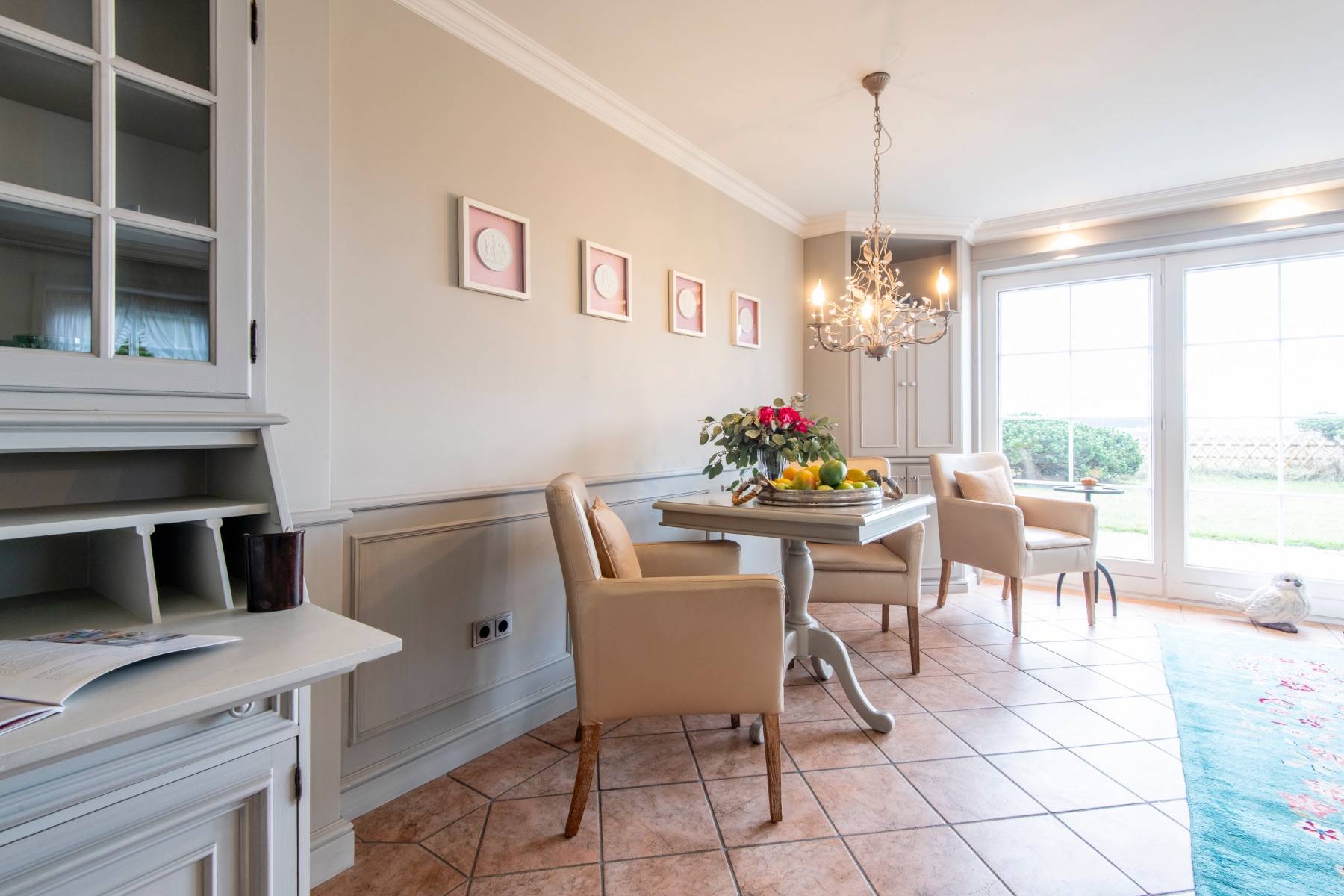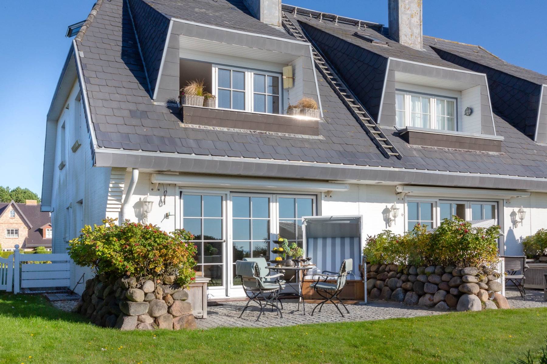 Die Terrasse ist mit hochwertigen Gartenmöbeln und einer Sonnenliege von Garpa ausgestattet, von der man einen wunderbaren Panoramablick auf das Wattenmeer genießen kann. Darüber hinaus spendet eine elektrische Markise bei Bedarf ausreichend Schatten auf der Terrasse, an der auch kleine freilaufende Hasen regelmäßig den Garten aufsuchen.