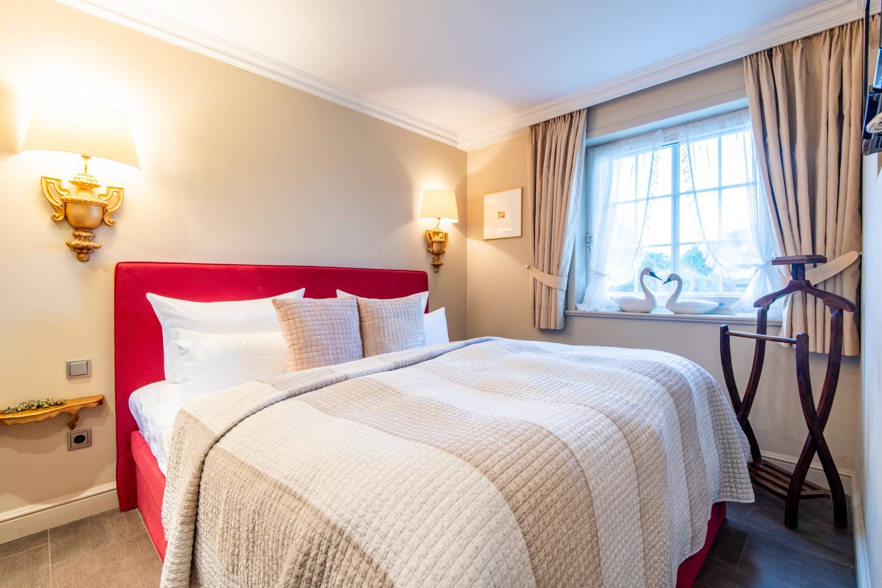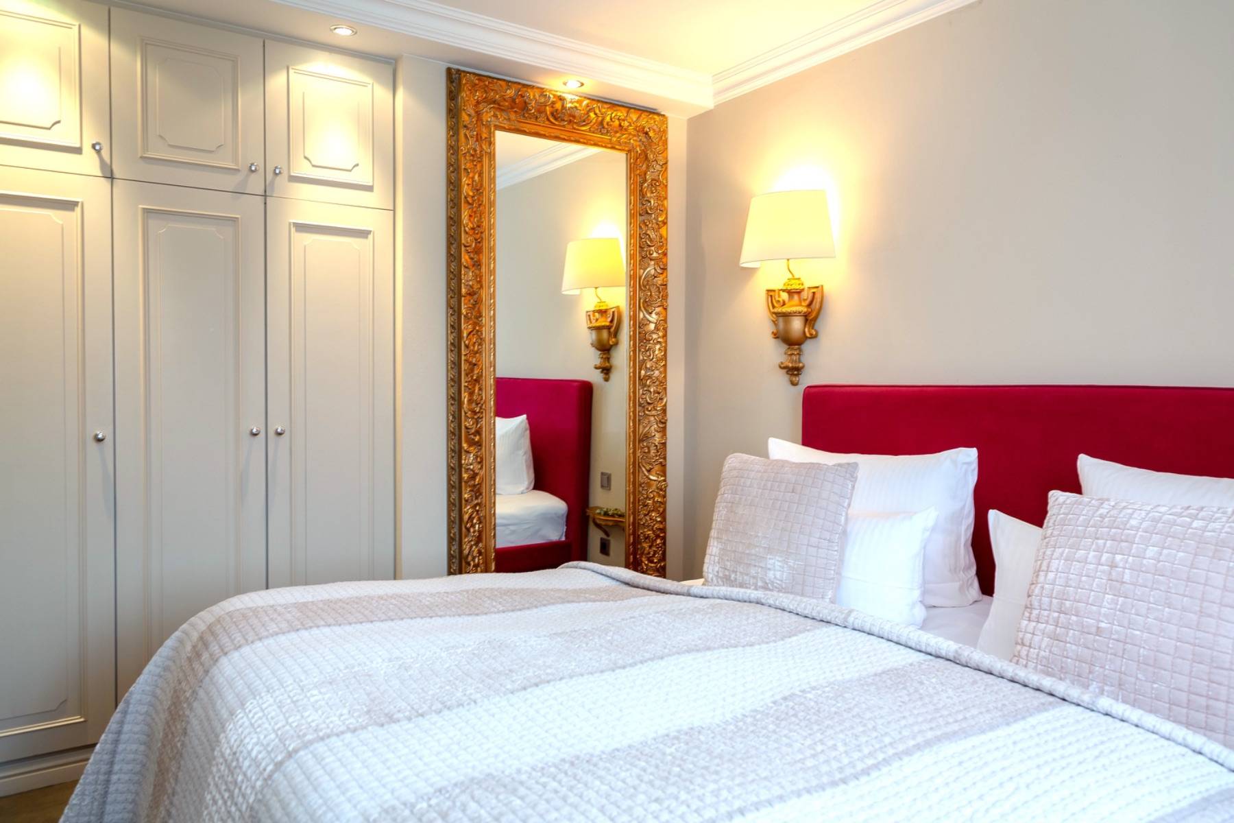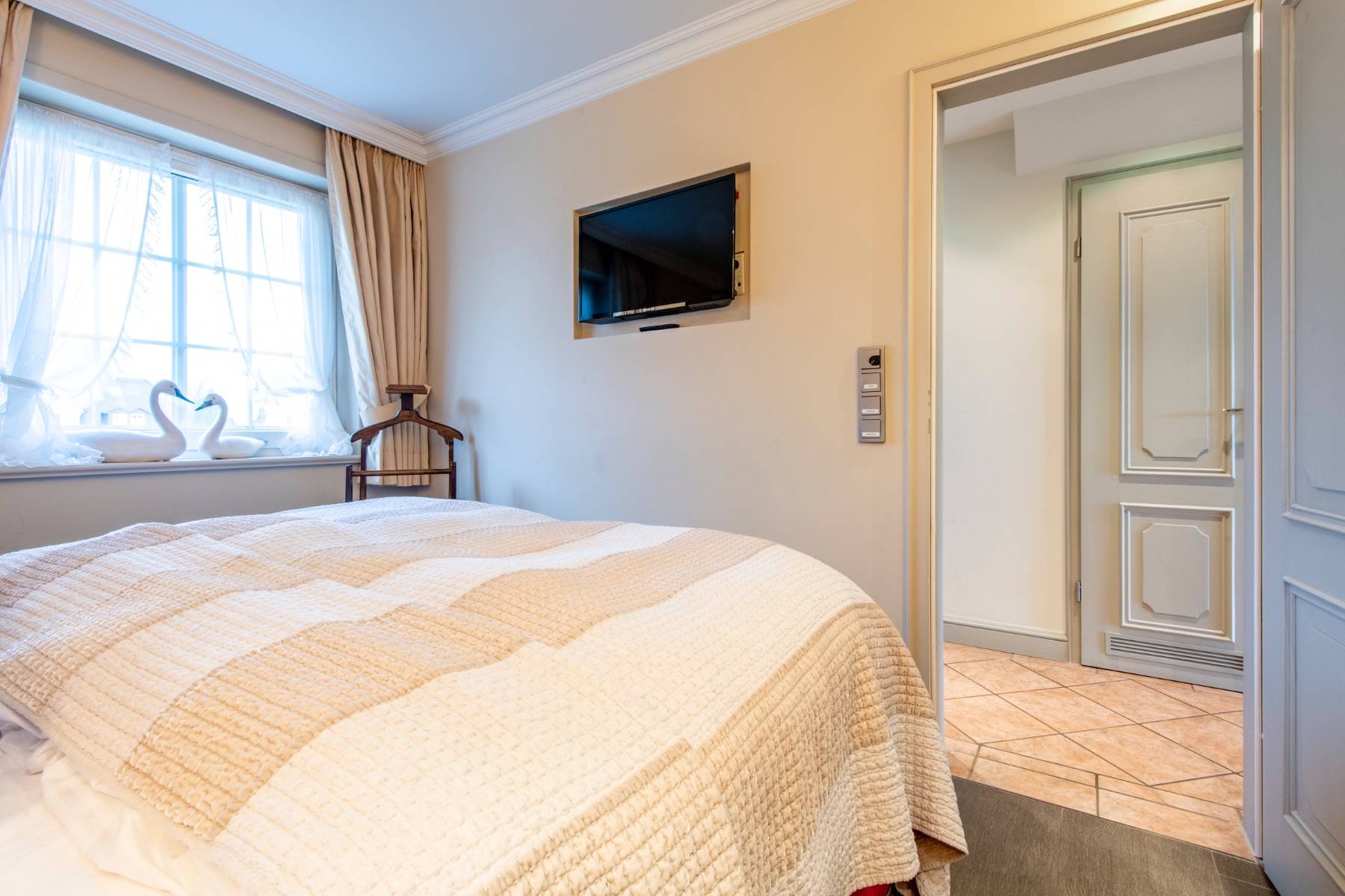 Das Schlafzimmer ist Ton in Ton angelegt und verfügt über einen weiteren Flachbildschirm, ein Herrendiener und einen maßeingebauten Wandschrank für die Garderobe. Das Doppelbett von Treca Interior de Paris sorgt für traumhafte Nächte und einen erholsamen Schlaf.