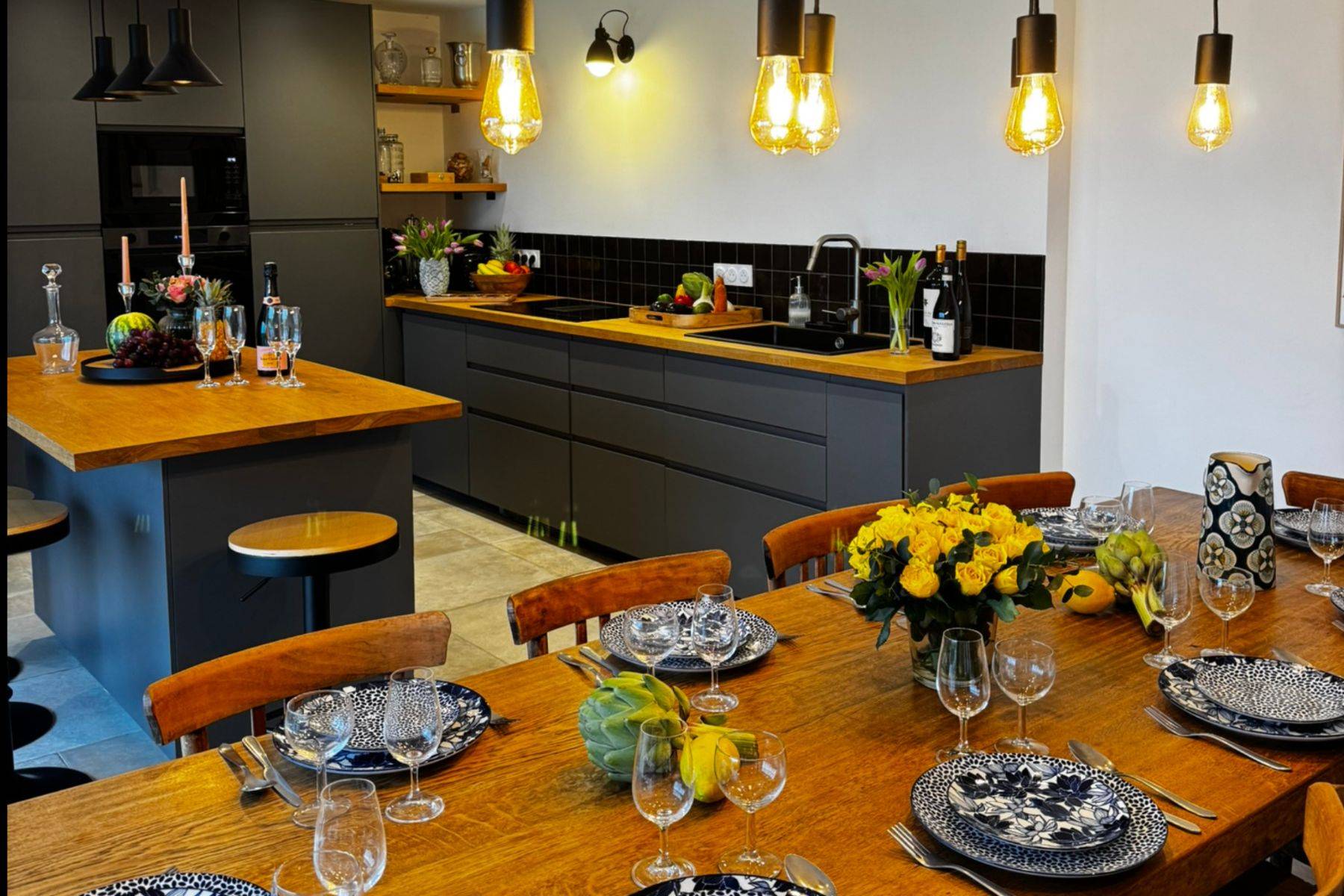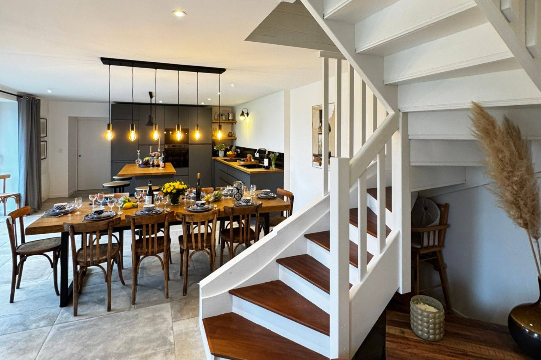 Nach der Renovierung 2025 ist ein modernes, aber von außen traditionell, bretonisches Ferienhaus entstanden (Zentral gelegen ist der offene Wohn-Koch-Ess-Bereich mit Kaminofen).