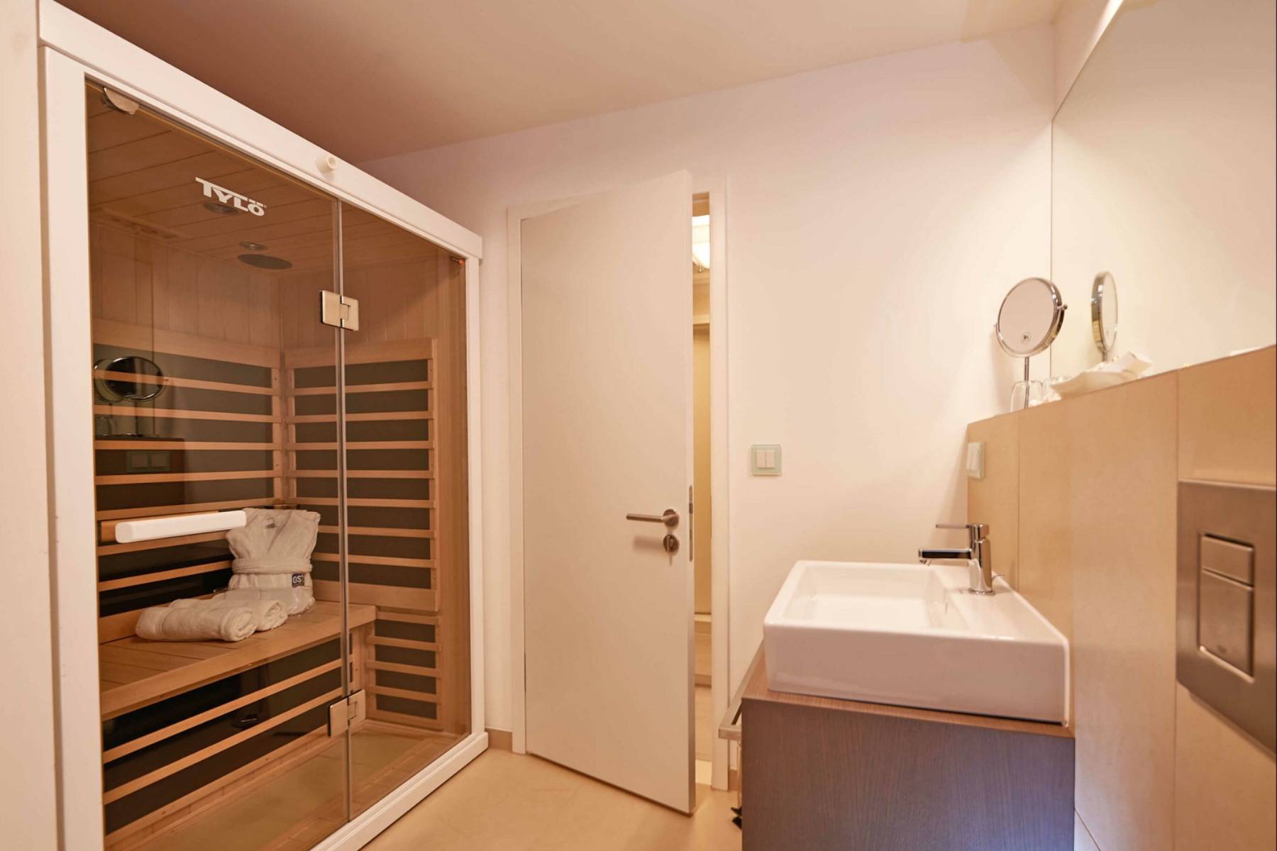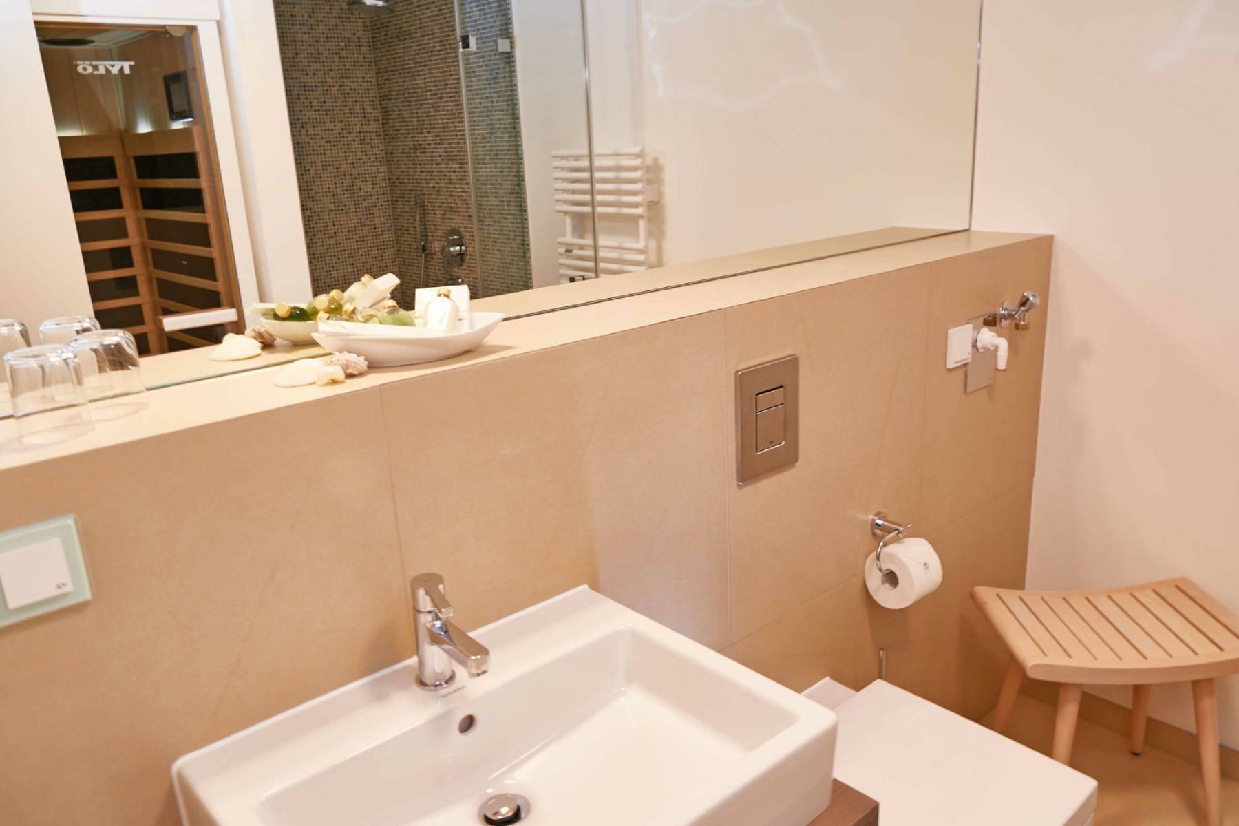 Das moderne Badezimmer ist mit einer ebenerdigen Dusche und einer Luxus- Infrarotkabine von Tylö ausgestattet.