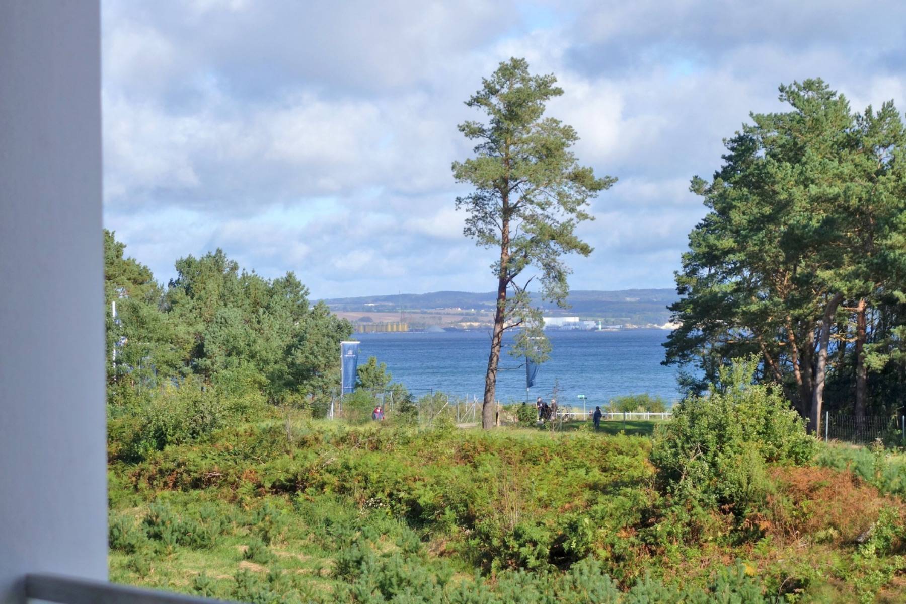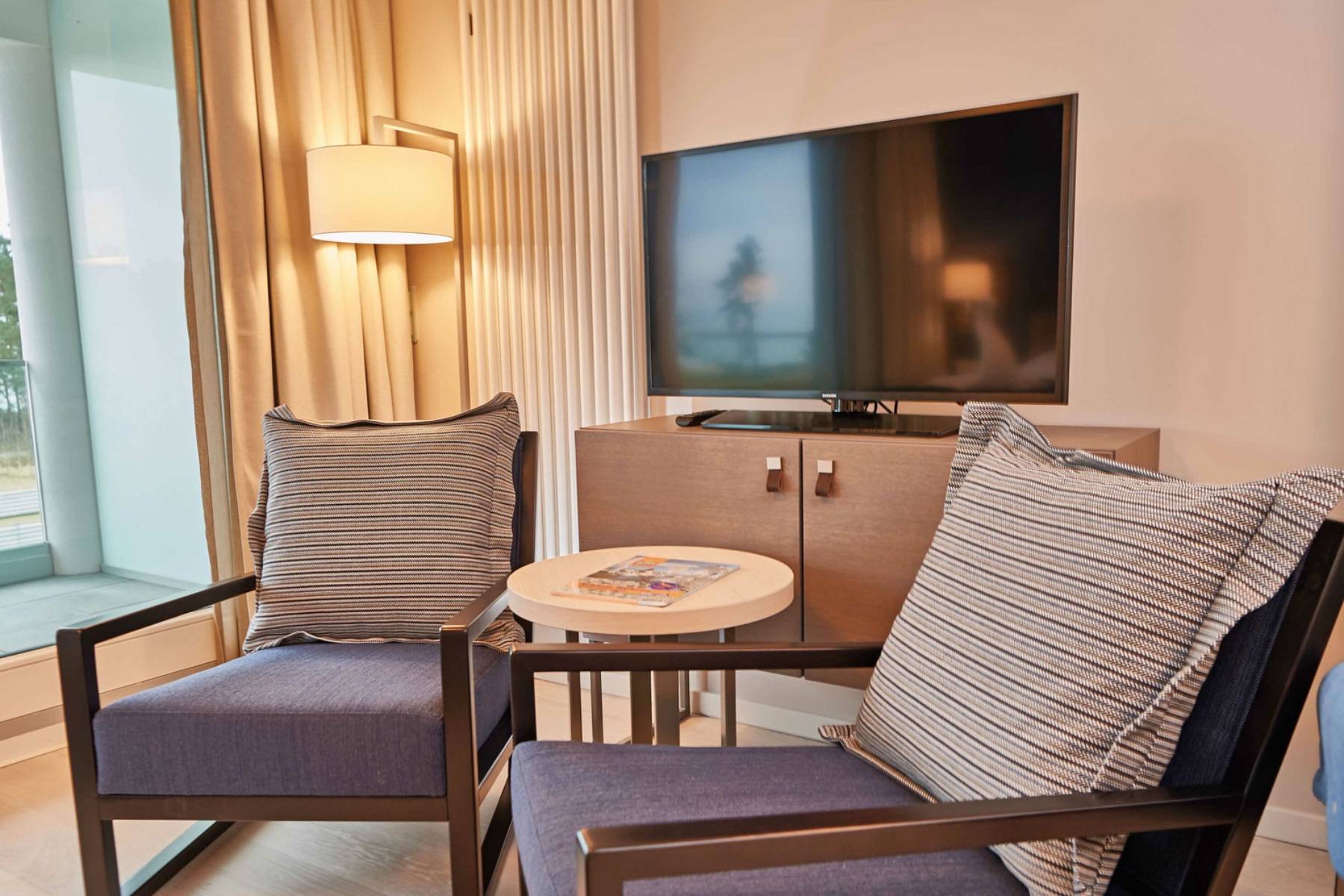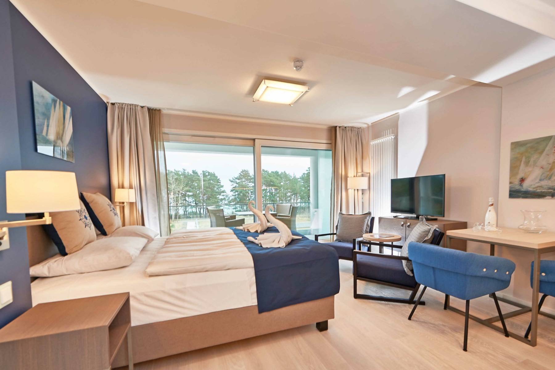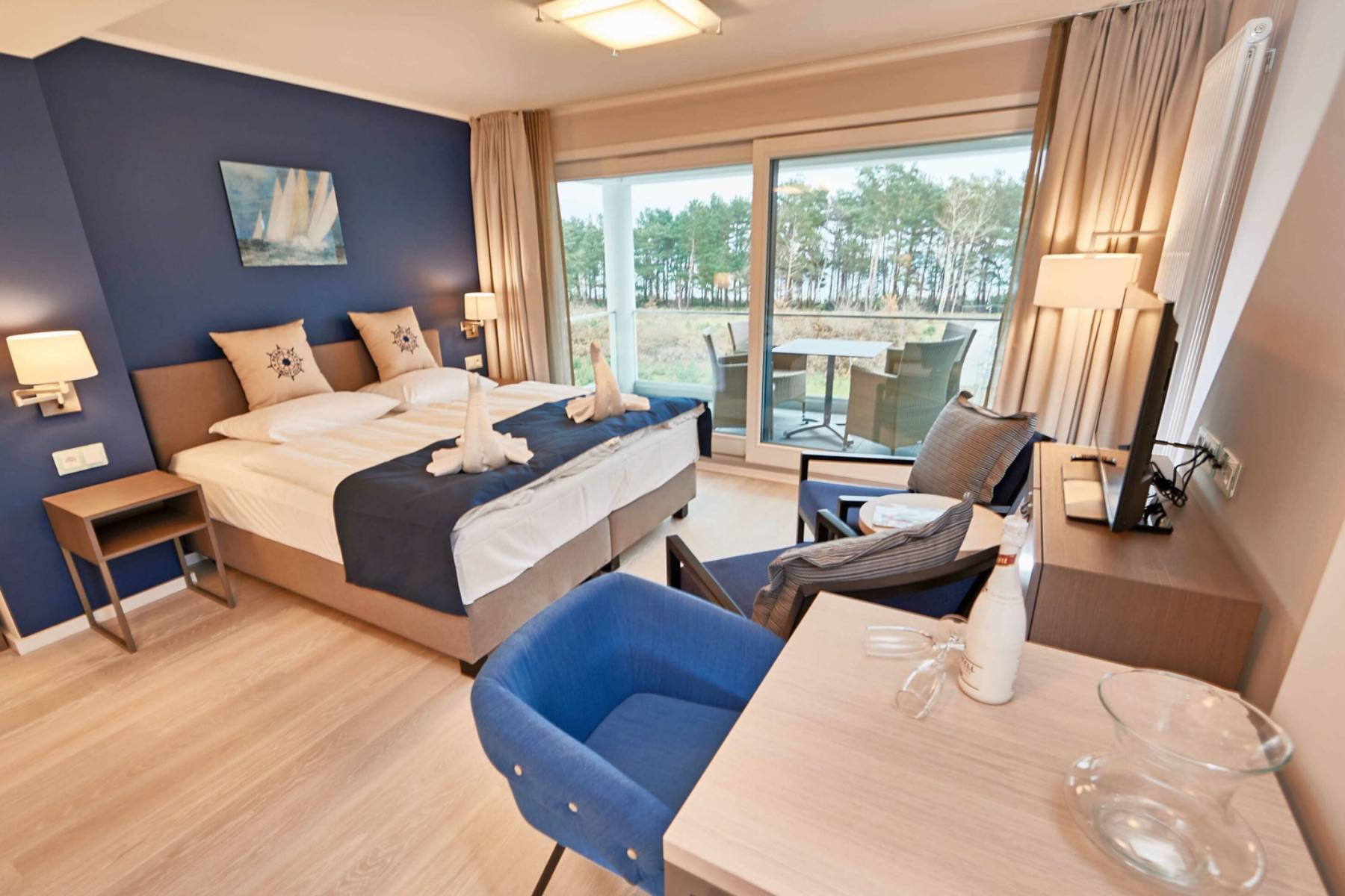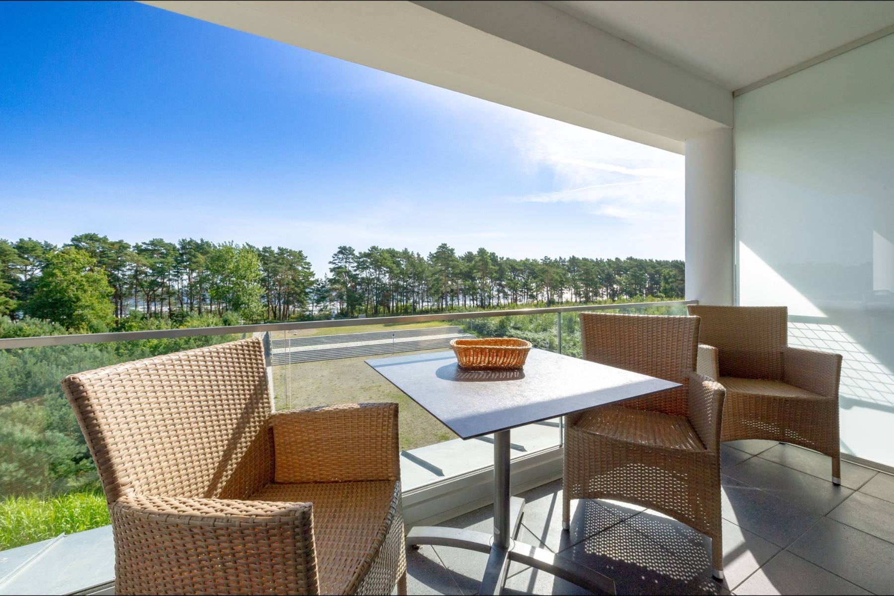Der Wohnbereich ist mit edlem Parkett ausgelegt und dank der bodentiefen Fensterelemente lichtdurchflutet. Durch das Fensterelement gelangt man auf den mit Gartenmöbel bestückten Balkon, von dem man auf die Ostsee blicken kann. Die Balkonmöbel stehen ganzjährig zur Verfügung.