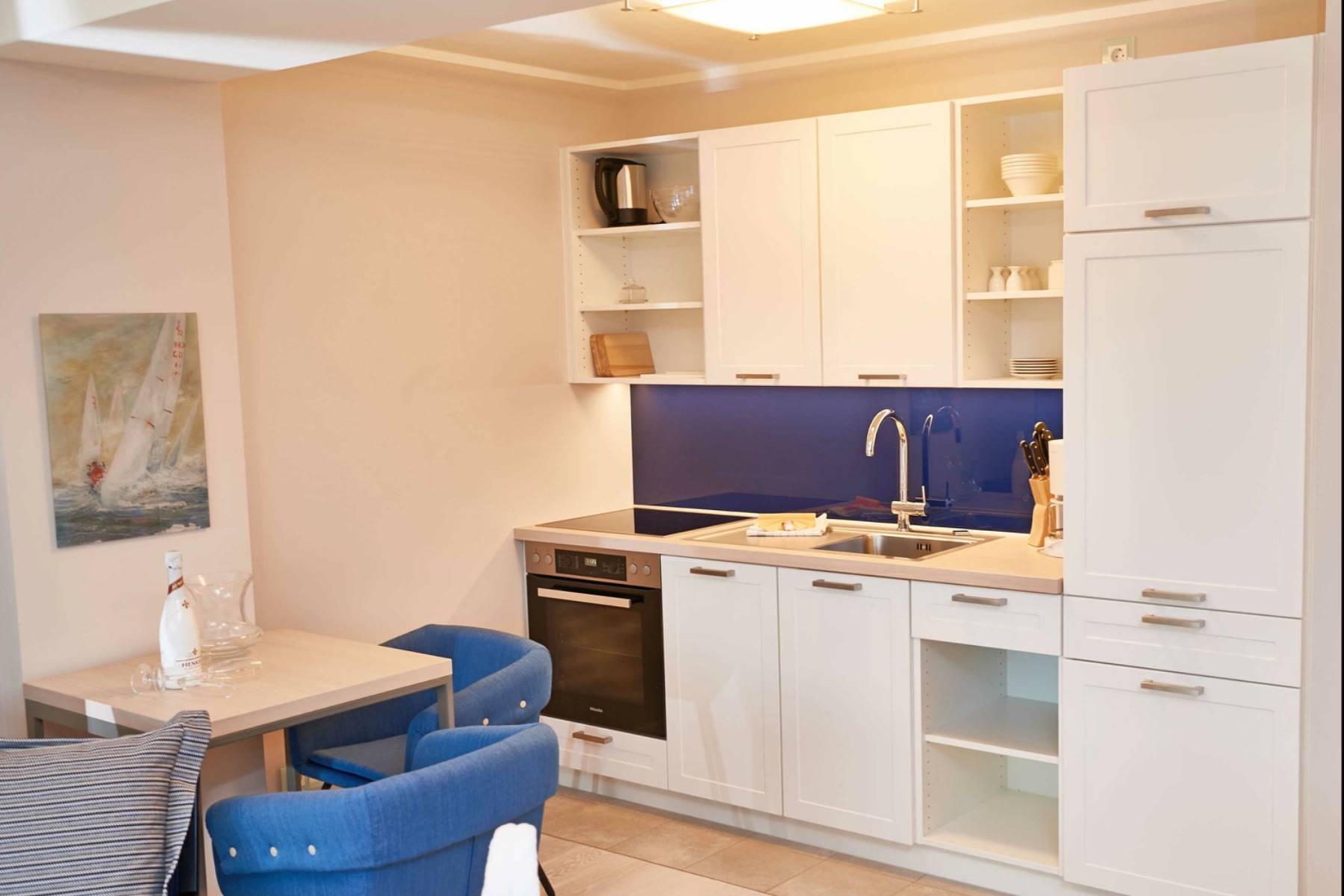 Backofen Balkonzugang Cerankochfeld Dunstabzug Ecksofa Esstisch Fenster Flachbildschirm Gefrierfach 3* Geschirr & Besteck Geschirrspülmaschine Heizung Kaffeemaschine Küchenutensilien Kühlschrank Meerblick Pfannen Sofa Stühle Toaster Töpfe Vorhänge Wasserkocher