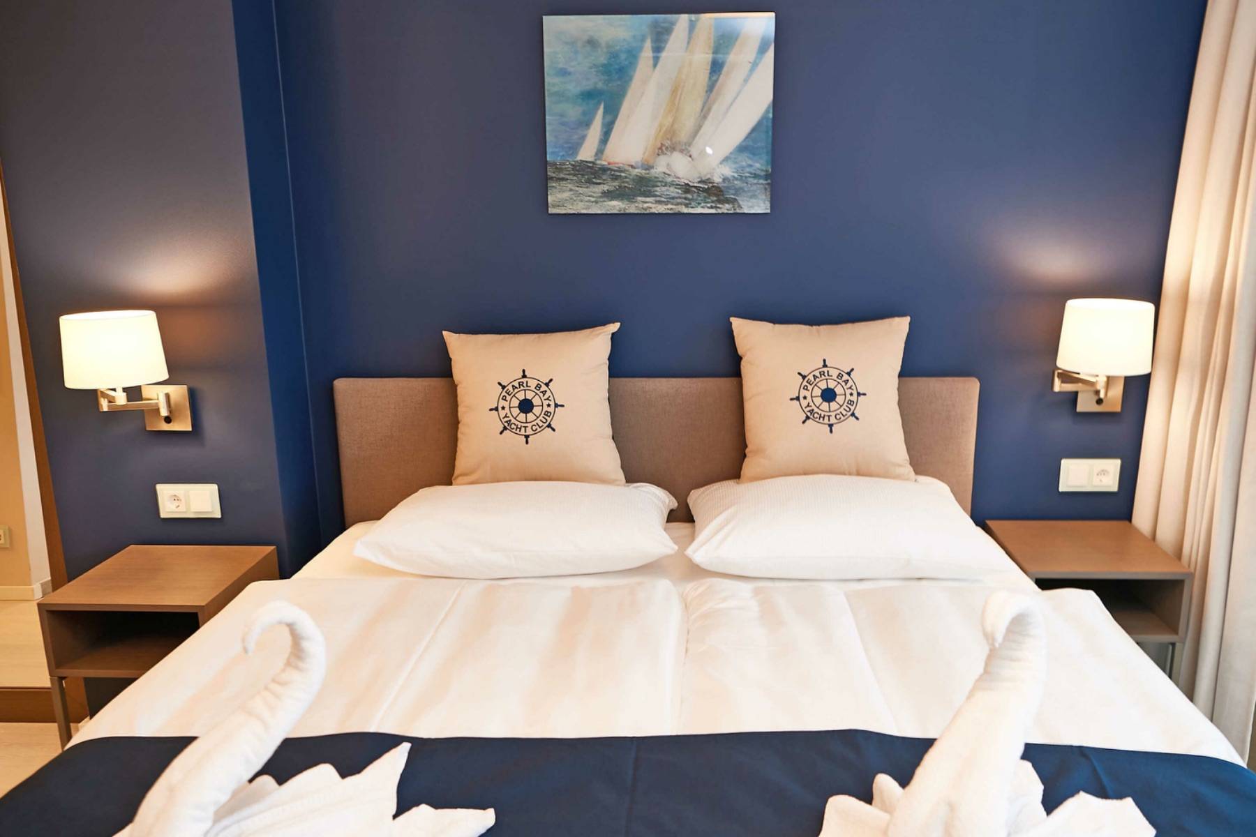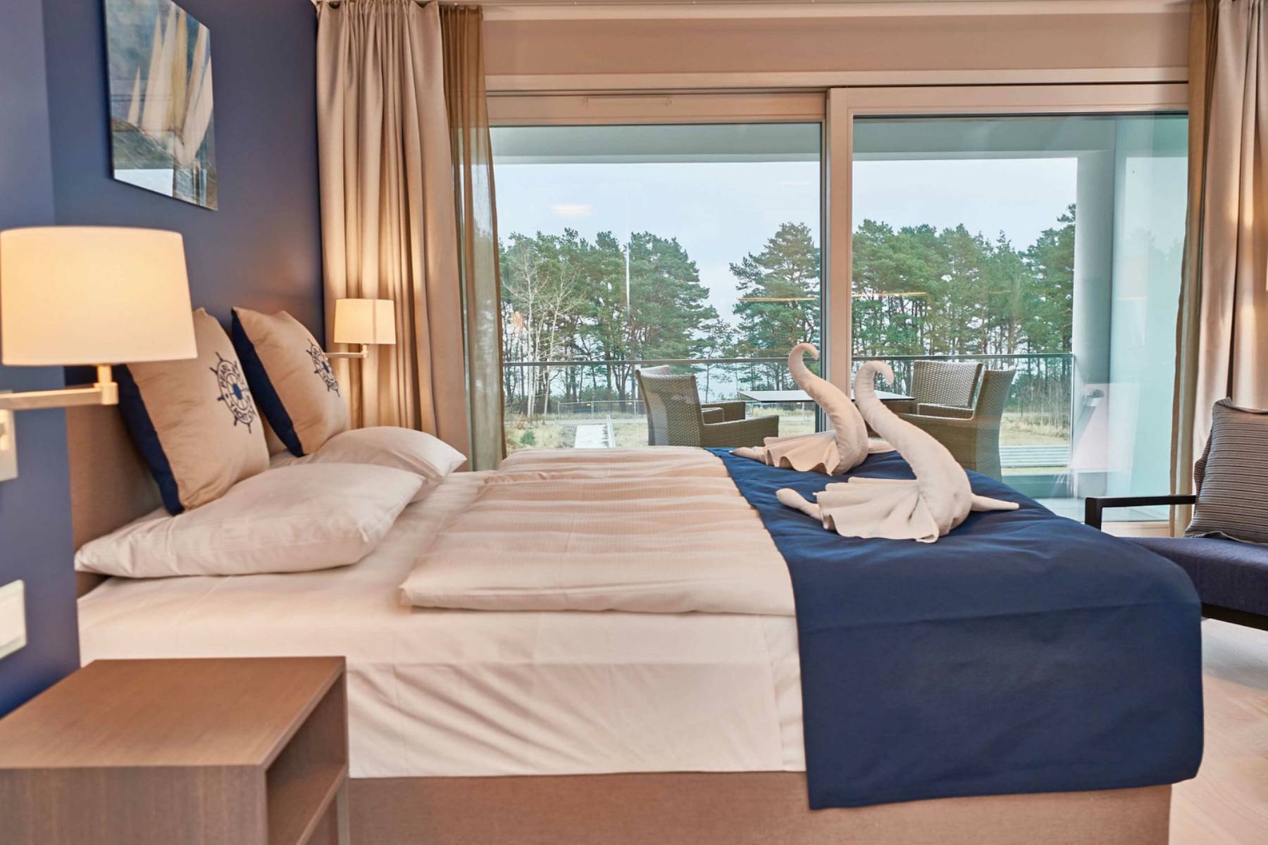 Doppelbett Fenster Meerblick Vorhänge
