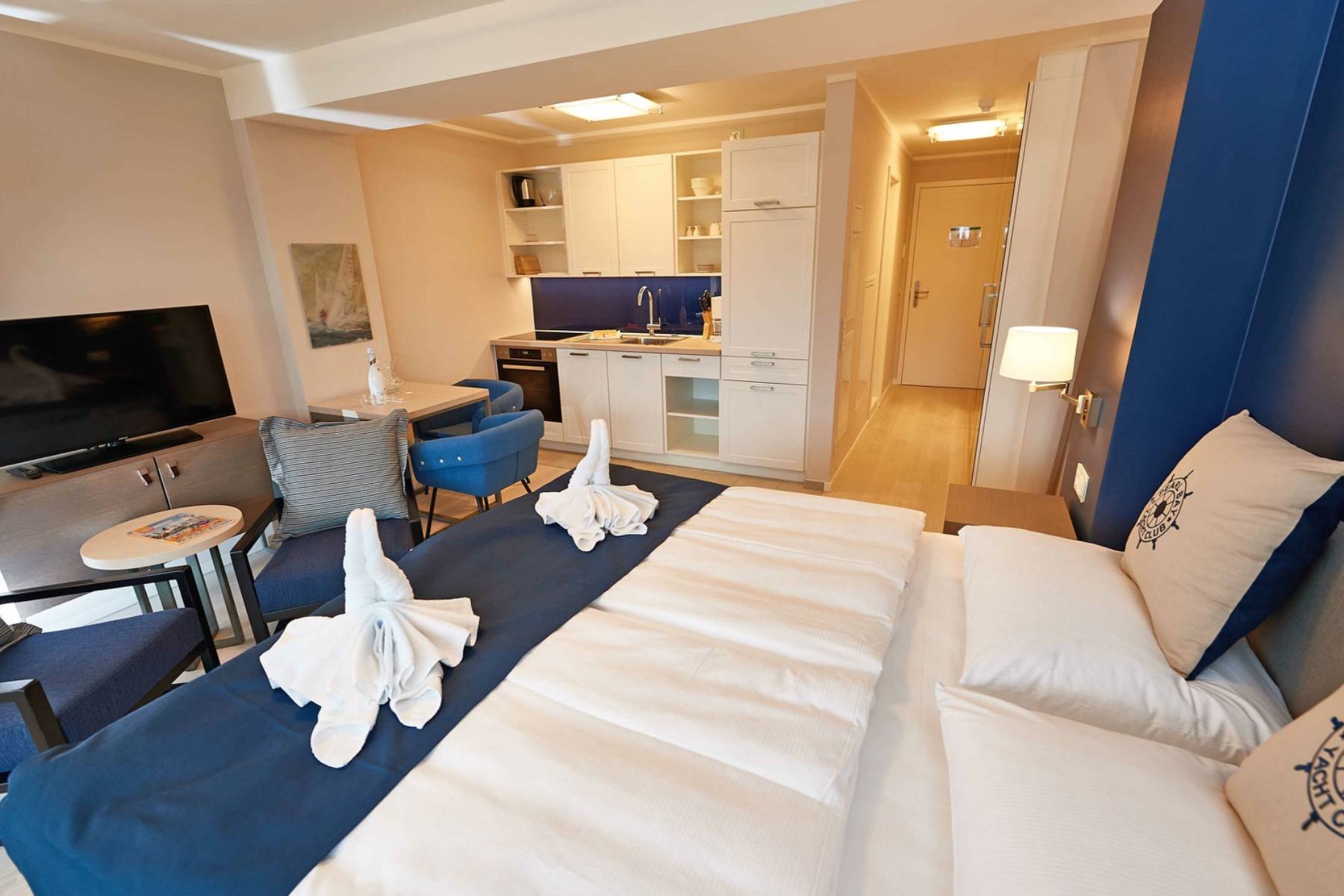 Die Wohnung verfügt über einen modern ausgestatteten Wohn-/Essbereich mit kleiner Sitzecke, einen Flachbild-TV, ein Radio mit USB-Anschluss, Bluetooth und Internet sowie ein komfortables Boxpringbett (1,80 x 2,00 m).