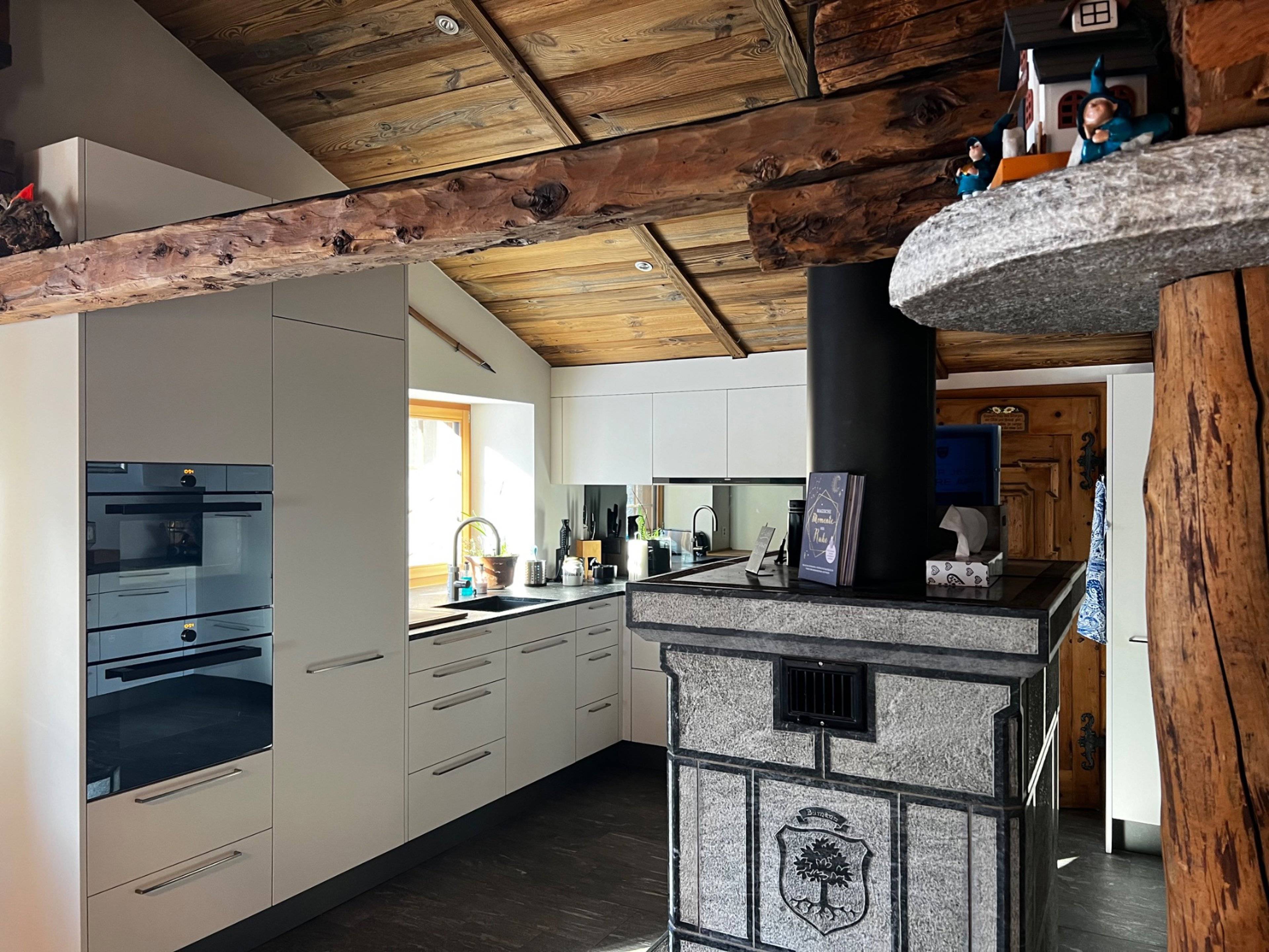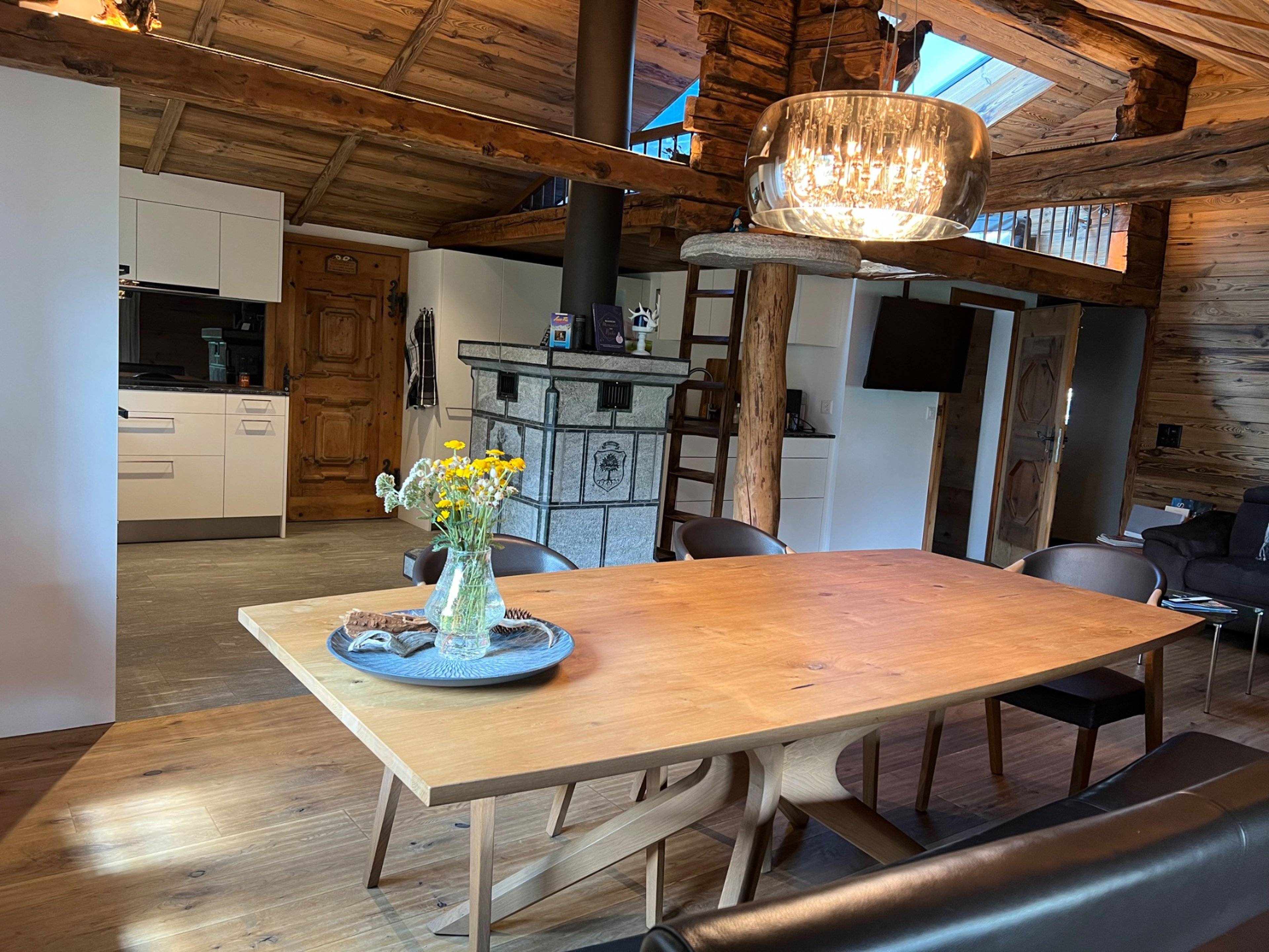 Authentische Chalet-Wohnung in renoviertem Walliserhaus von 1676. Einmalige Lage auf Sonnenterrasse Hohnegg. Luxuriöse Ausstattung mit grosser Küche.