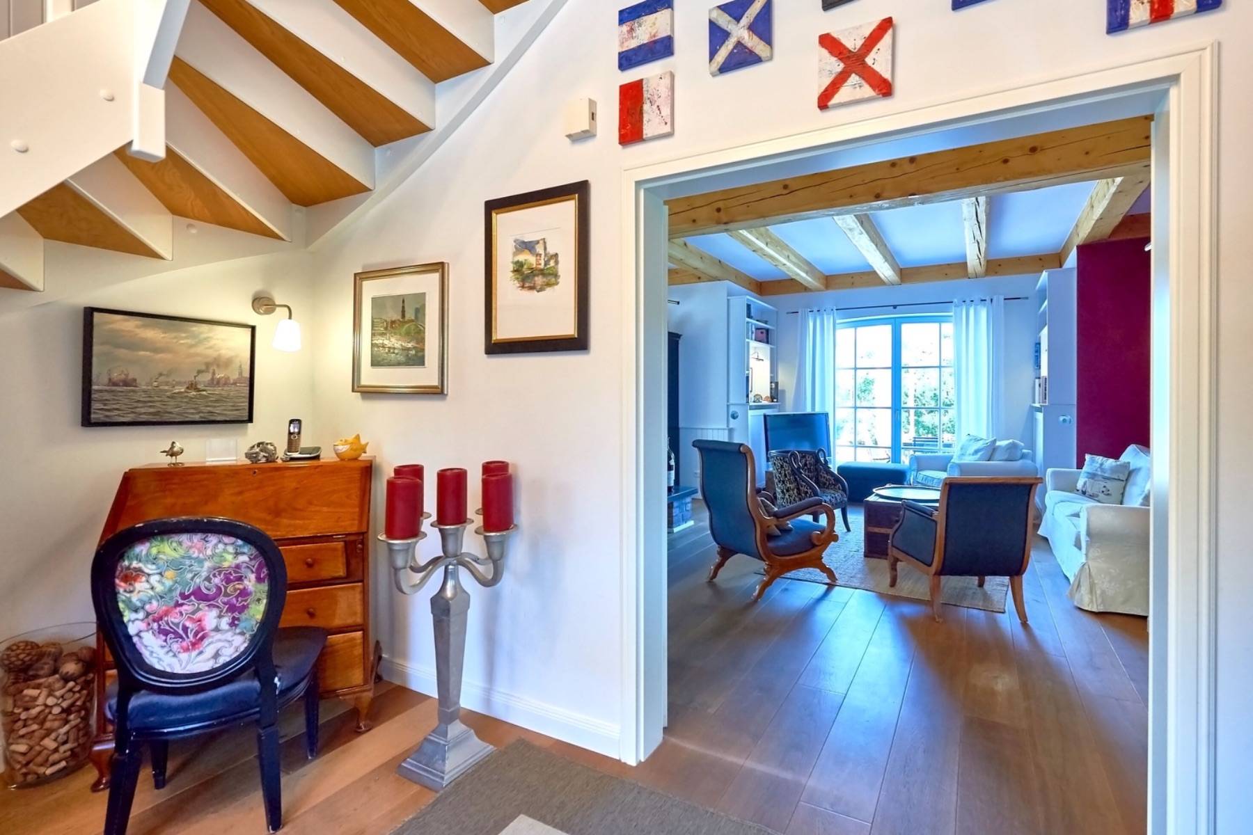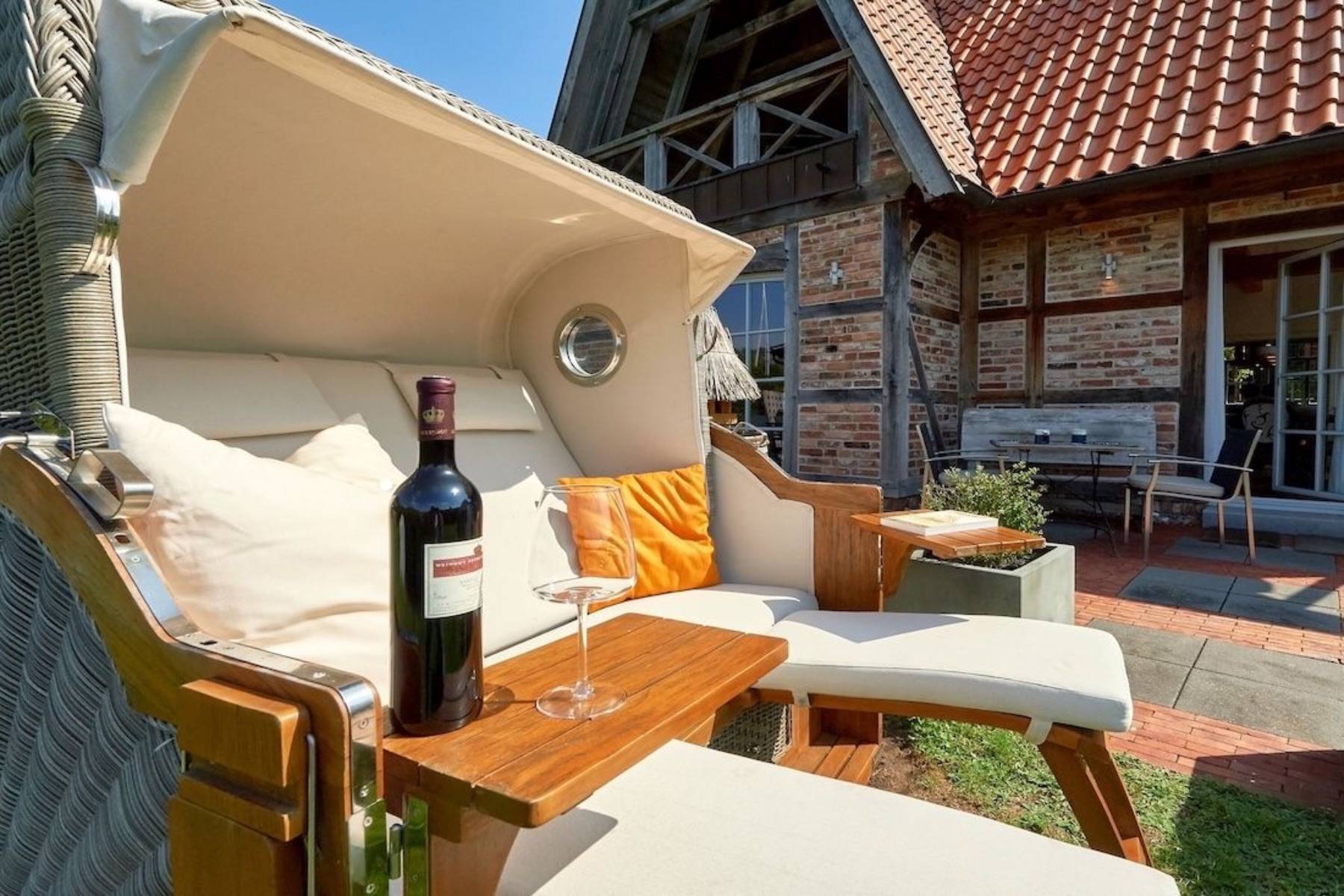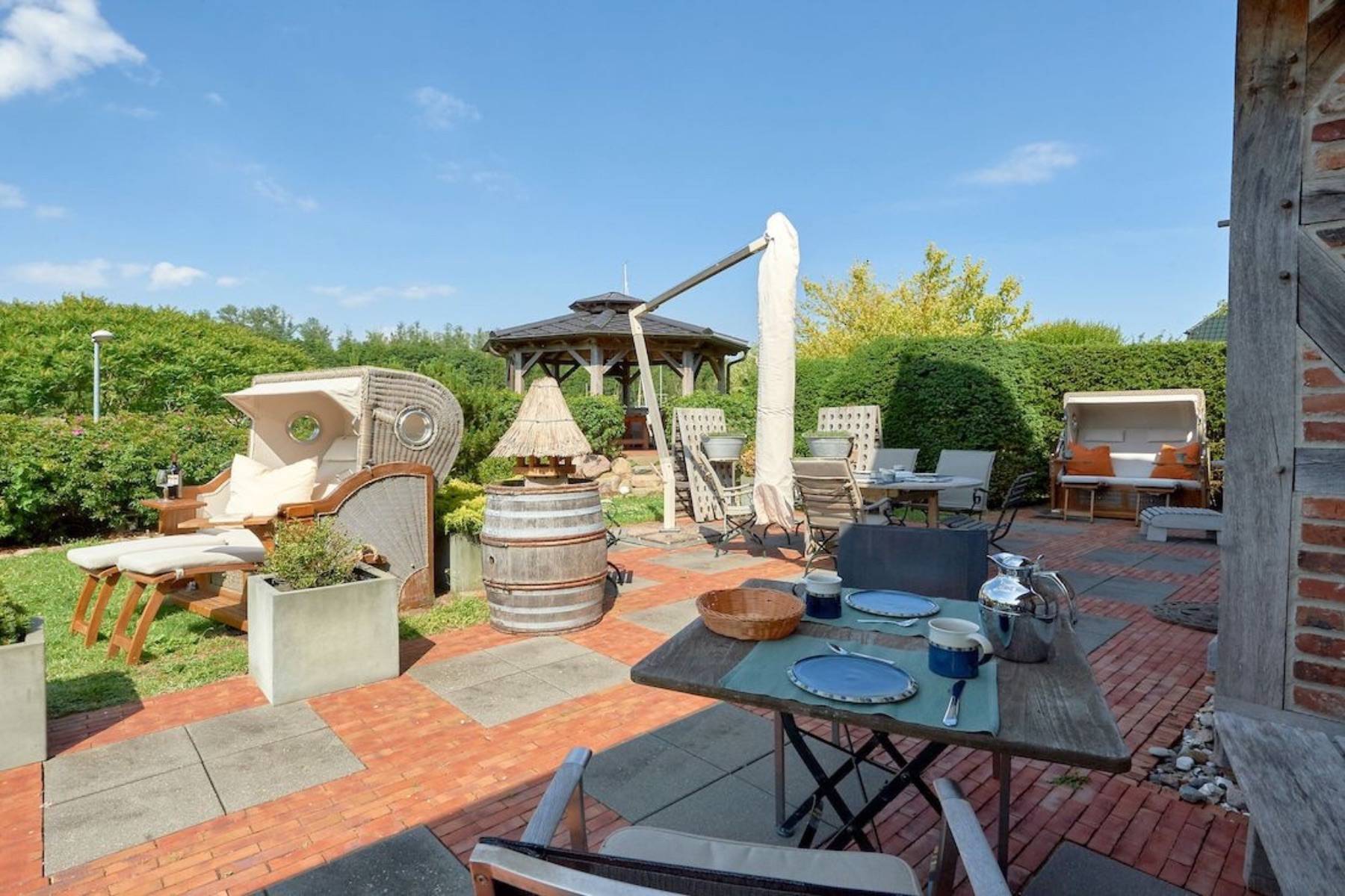 Sonnenliegen und eine Sitzgruppe auf der Terrasse nach Südwesten führen die sehr gute Ausstattung auch im Außenbereich fort und bieten die Möglichkeit, sich rundum wohl zu fühlen. Ein erhöhter Pavillon im Vorgarten mit einer Grillecke und einem herrlichen Ausblick über das verträumte Fischerdörfchen und auf die Having vervollkommnen dieses Arrangement.