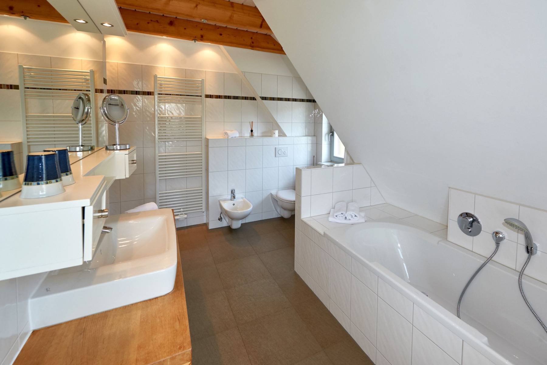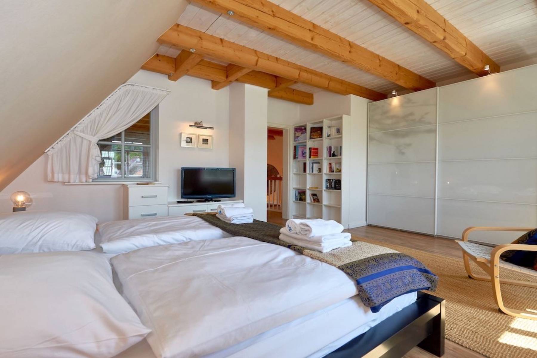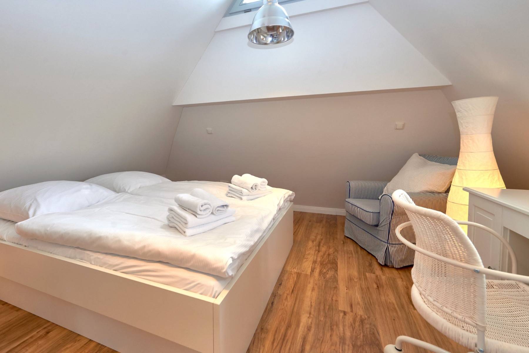 Im mit Laminat ausgelegten Obergeschoss befindet sich das große Schlafzimmer mit 2 Einzelbetten, die zu einem Doppelbett (200x200cm) zusammen gestellt wurden und mit einem Flachbild-TV, einem großen Kleiderschrank sowie das angrenzende großzügige Badezimmer mit Dusche, WC, Bidet, Handtuchheizung, Badewanne und mit einem schönen Blick zur Having.