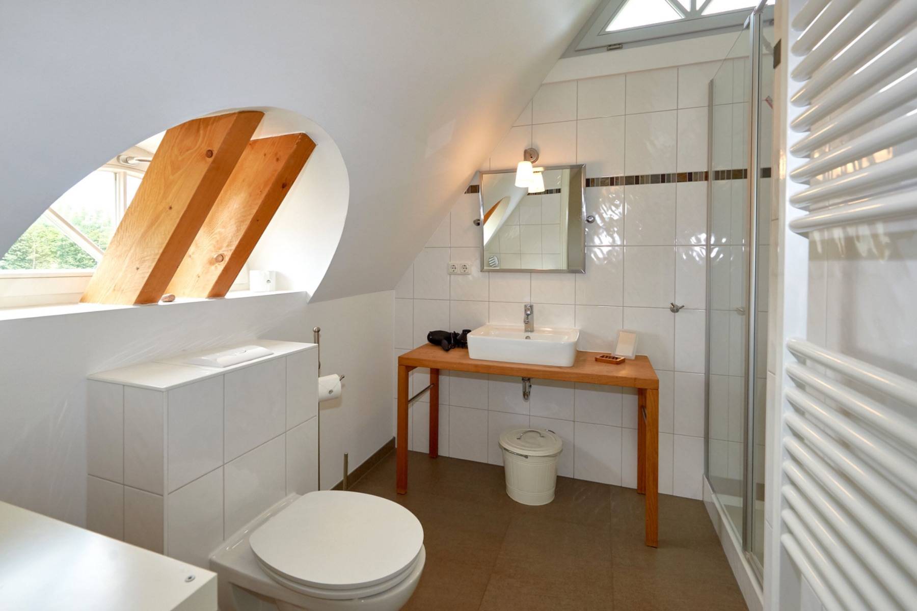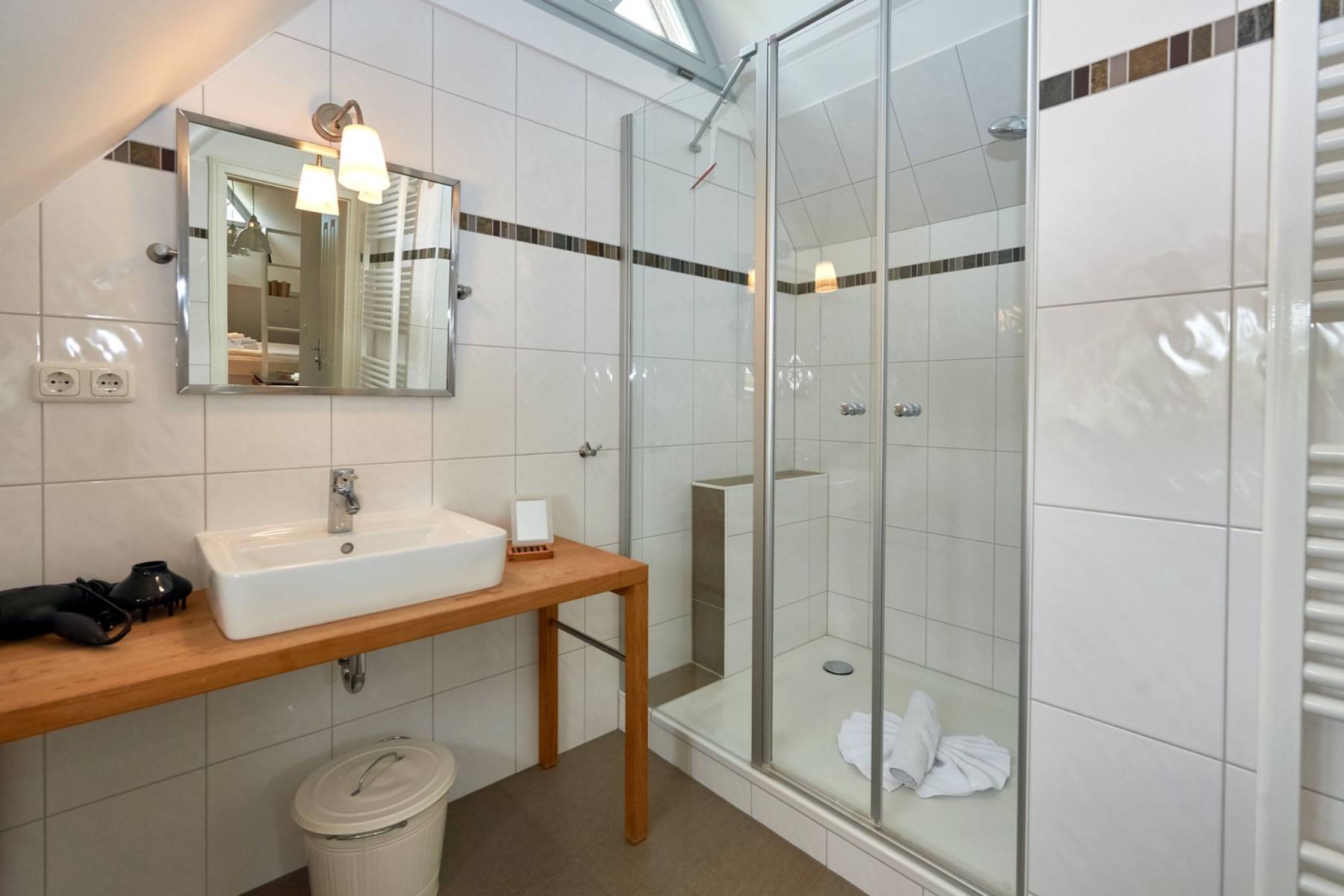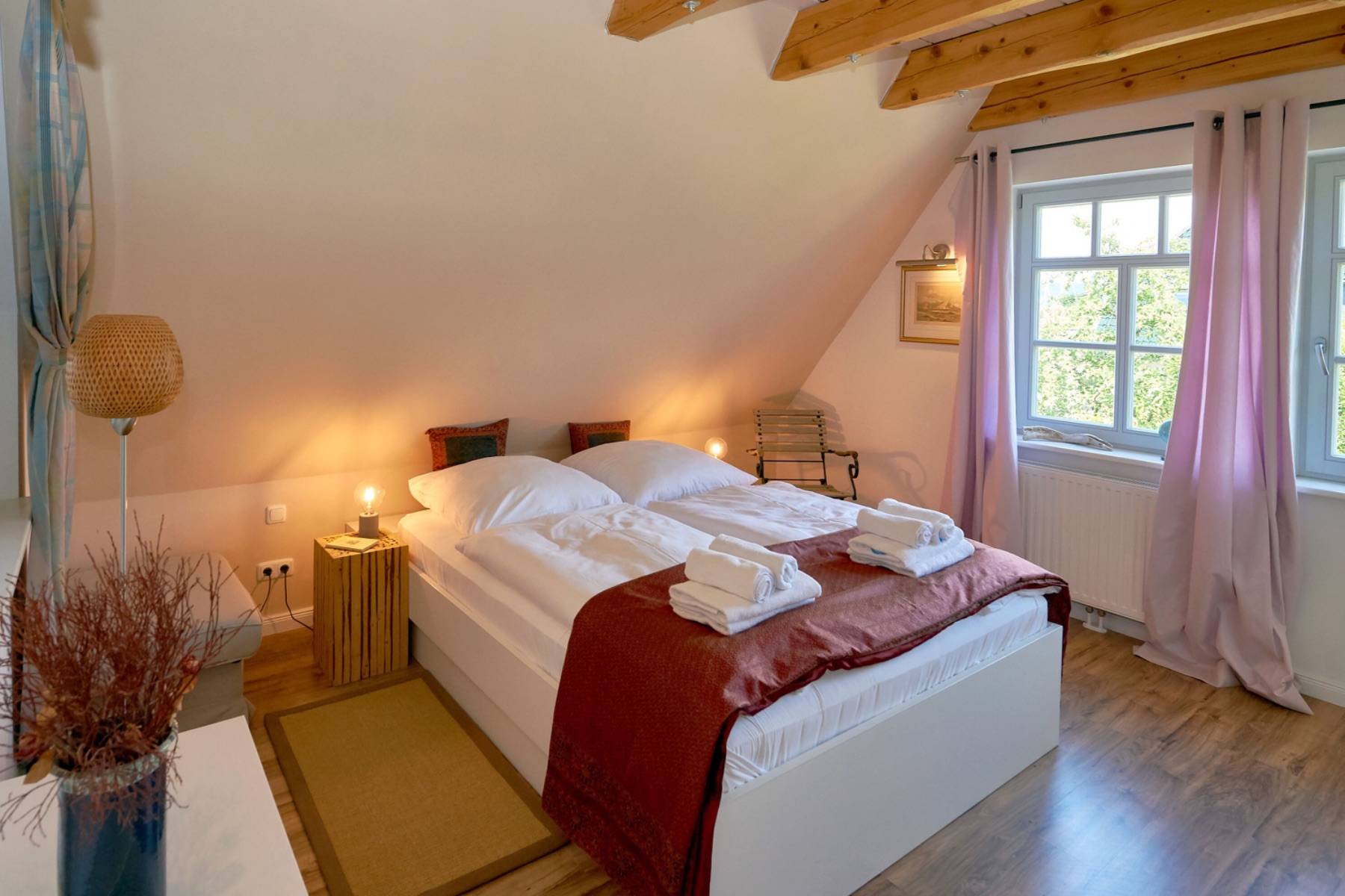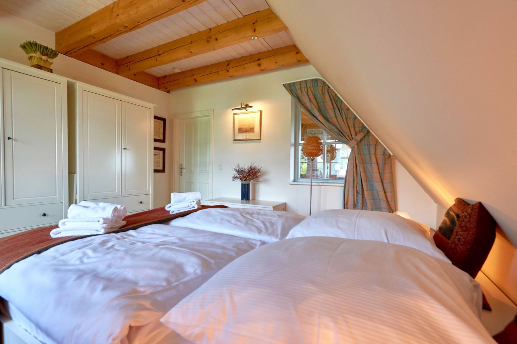 Im mit Laminat ausgelegten Obergeschoss befindet sich das große Schlafzimmer mit 2 Einzelbetten, die zu einem Doppelbett (200x200cm) zusammen gestellt wurden und mit einem Flachbild-TV, einem großen Kleiderschrank sowie das angrenzende großzügige Badezimmer mit Dusche, WC, Bidet, Handtuchheizung, Badewanne und mit einem schönen Blick zur Having.