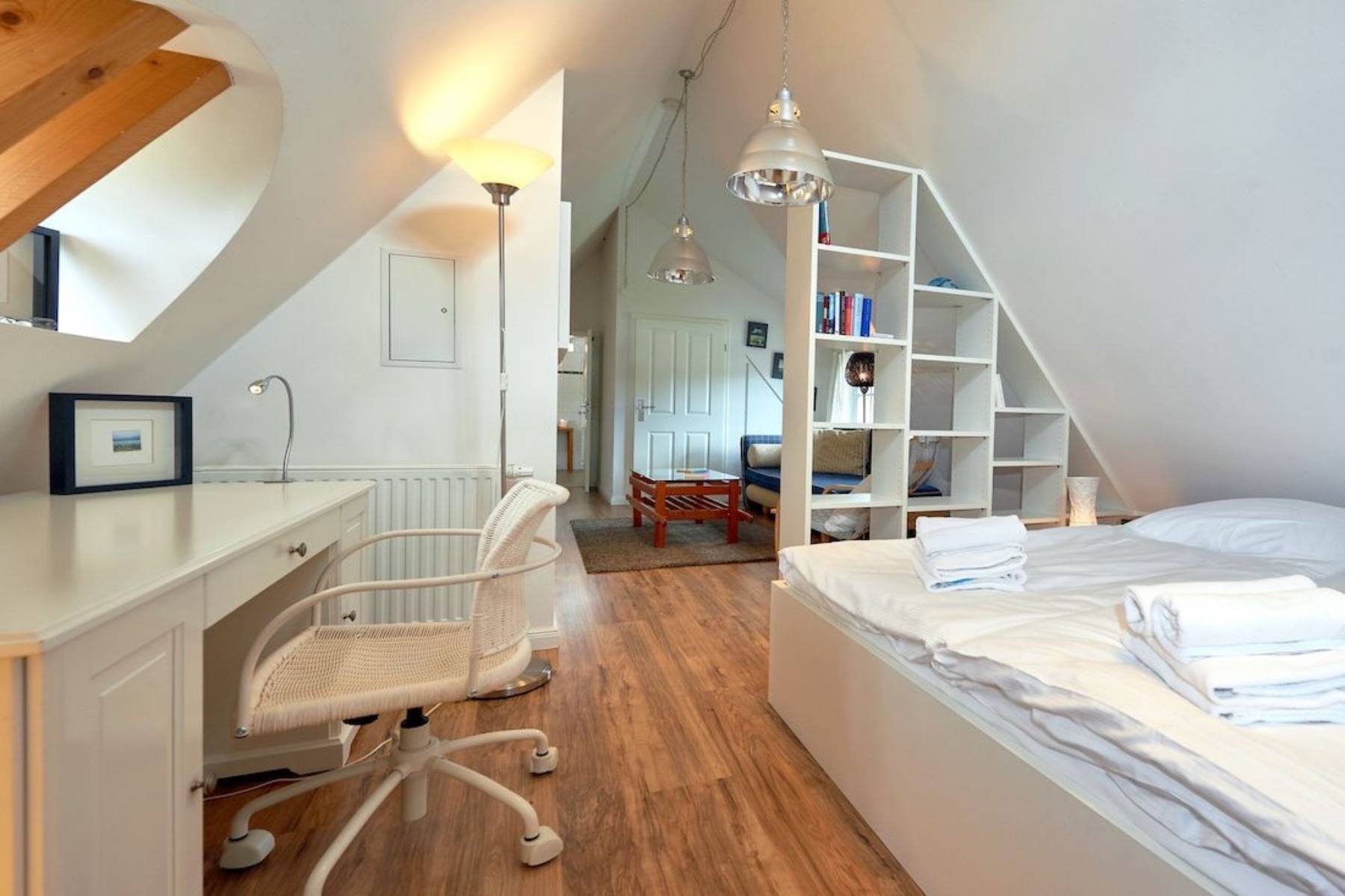 Ein ca. 30 m² großes Studio unter dem Dach mit einem Doppelbett der Größe 1,60 x 2,00m mit einer durchgehenden Matratze, einem Flachbild-TV und ebenfalls mit eigenem Duschbad, rundet das großzügige Raumangebot ab.